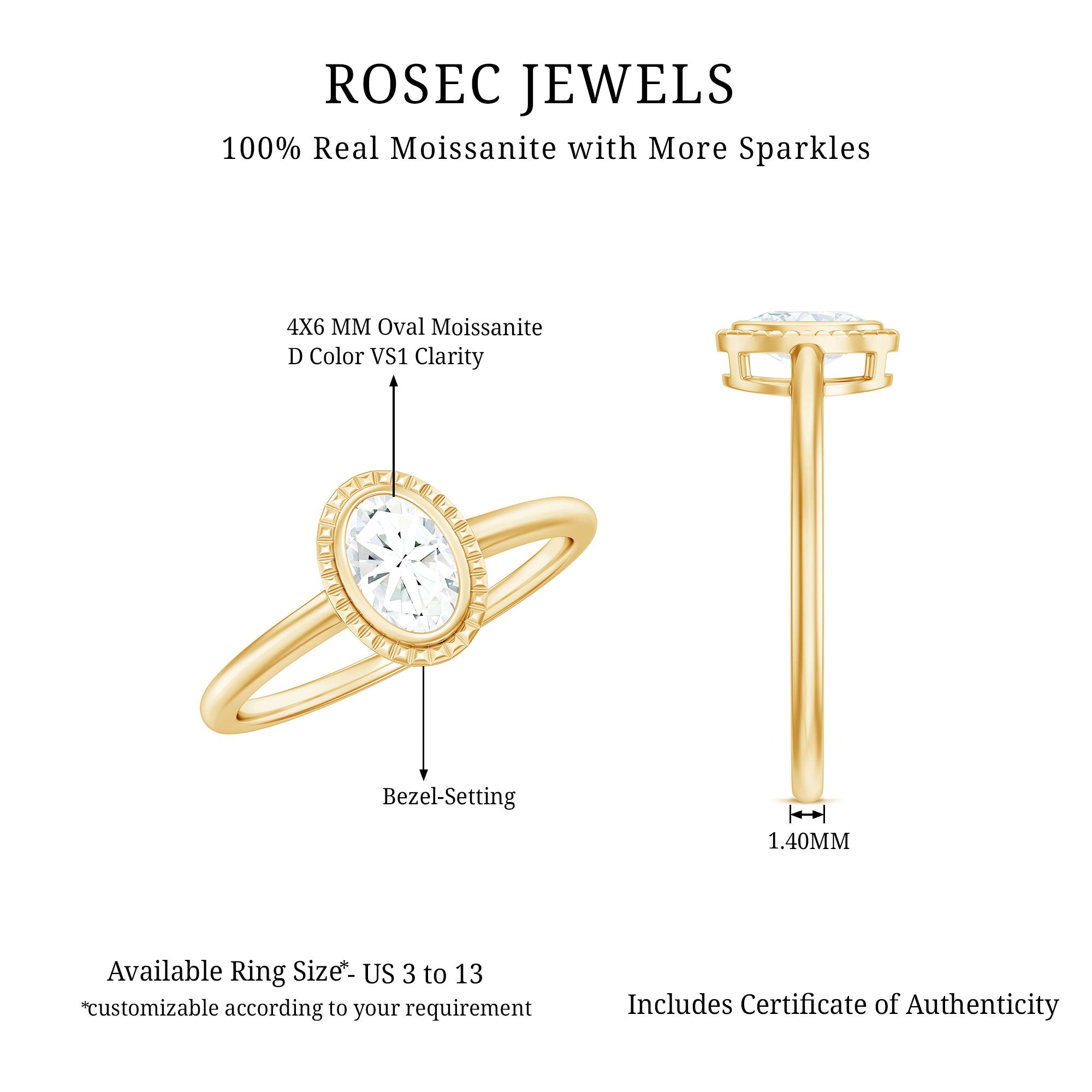 This exquisite Moissanite Solitaire Ring harmoniously combines contemporary design with classic elegance, serving as an ideal emblem of love and commitment. Constructed from premium quality metal, the Oblong Ring showcases a dazzling 4X6 MM oval cut moissanite, securely set in engraved bezel setting, which impart a hint of vintage allure to its modern aesthetic. At its core, the D-VS1 Quality moissanite radiates brilliantly, celebrated for its exceptional clarity and brilliance, providing an ethical and cost-effective substitute for conventional diamonds. The oval cut imparts a gentle, romantic essence to the ring, perfectly symbolizing the promise of eternity and the strength of your connection. Created to honor love in its most genuine form, this Oval Moissanite Ring distinguishes itself with its understated yet enchanting charm. Whether you are commemorating a significant milestone, selecting a thoughtful gift, or celebrating an anniversary or Valentine’s Day, this Bezel Set Ring is an elegant choice. Its refined design is appropriate for everyday wear while remaining special enough for important occasions.
