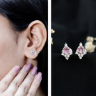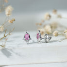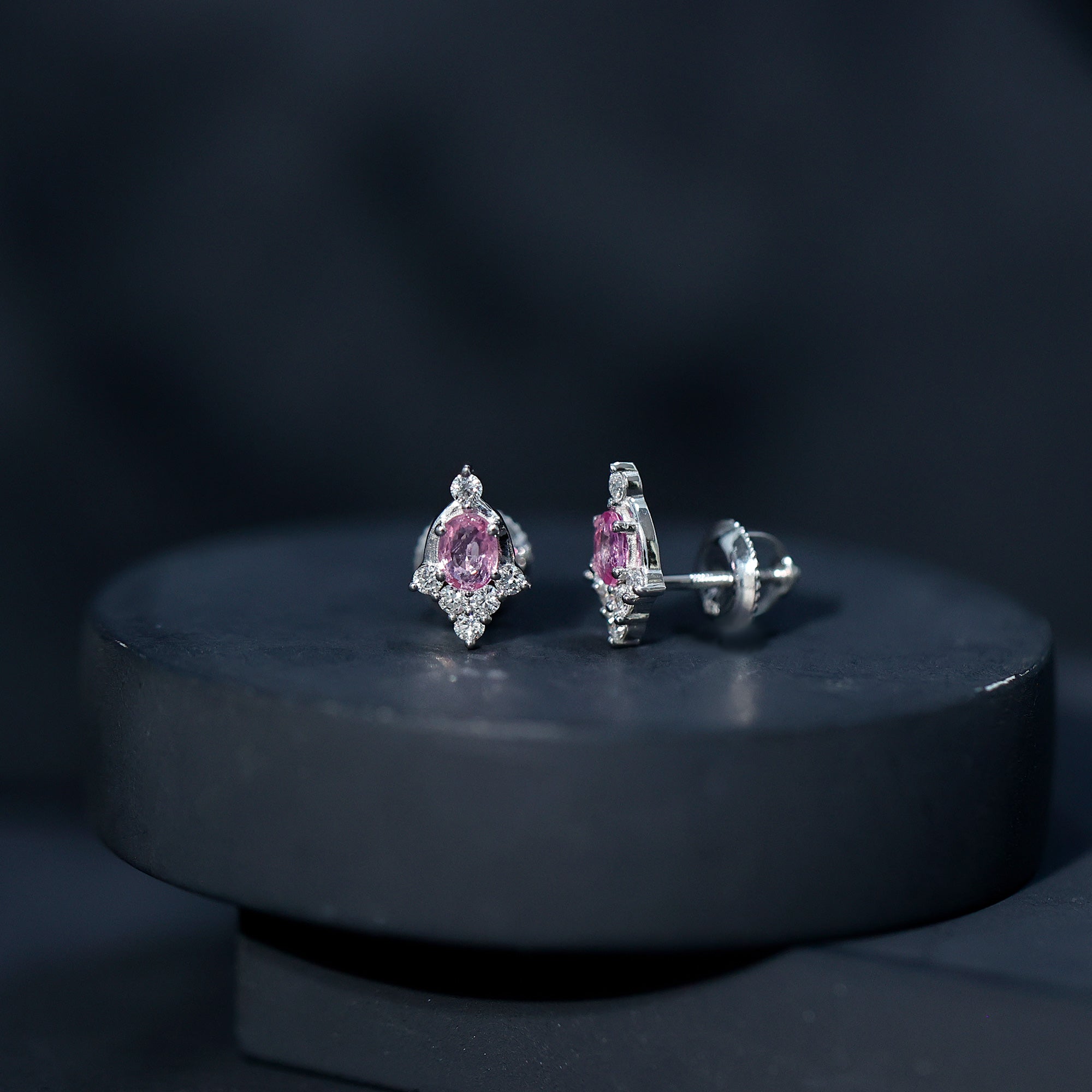Designed with thoughtful details and a timeless style, these Pink Sapphire and Diamond Earrings are curated in 14k white gold plated silver, making them perfect for everyday elegance or a dressed-up occasion. At the center of each stud is a 3X4 MM oval shaped Pink Sapphire, securely held in prong setting that lets the beauty of the gem stand out. What makes these Pink Sapphire Stud Earrings even more special is the round lab grown diamond set just above the sapphire, adding a soft shimmer and drawing the eye upward for a beautiful, balanced look. The design feels both delicate and refined, with just the right touch of sparkle. Finished with screw back closures, these Pink Stone Earrings are made for comfort and security, so you can wear them from morning to night with ease. Whether you are heading to work, going out with friends, or dressing up for a celebration, they bring just enough glow to brighten your look without overwhelming it. The AAA quality Pink Sapphire gives the Classic Stud Earrings their romantic and soft charm, while the EF-VS quality lab diamonds bring out a gentle brilliance that catches the light in all the right ways.