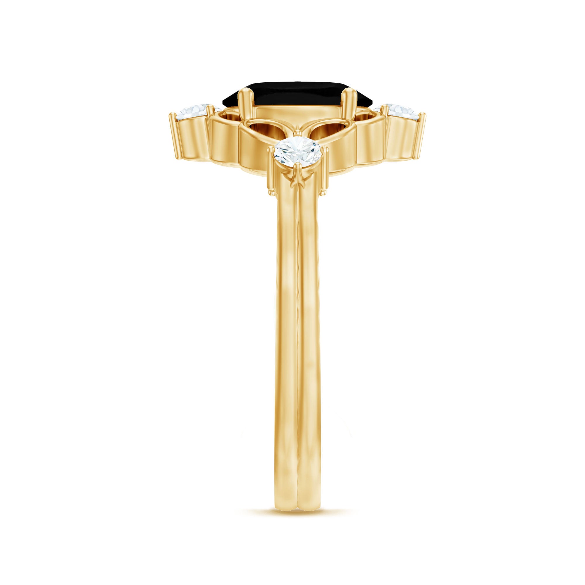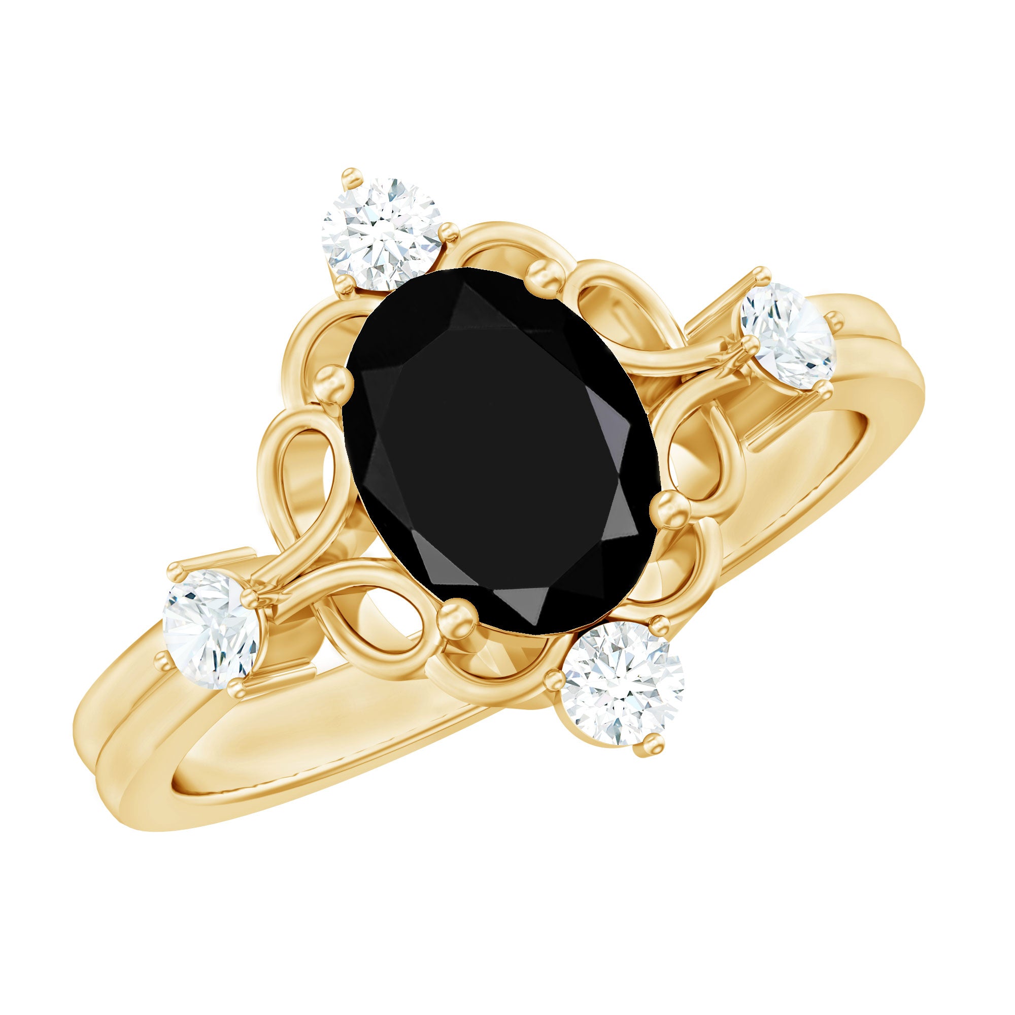 Treat your look with this lovely Gold Cocktail Engagement Ring adorned with Oval Shape Created Black Diamond set as a solitaire and Round Shape Diamond in a prong setting. This Solitaire Cocktail Ring is mounted in gold for a luxurious look.