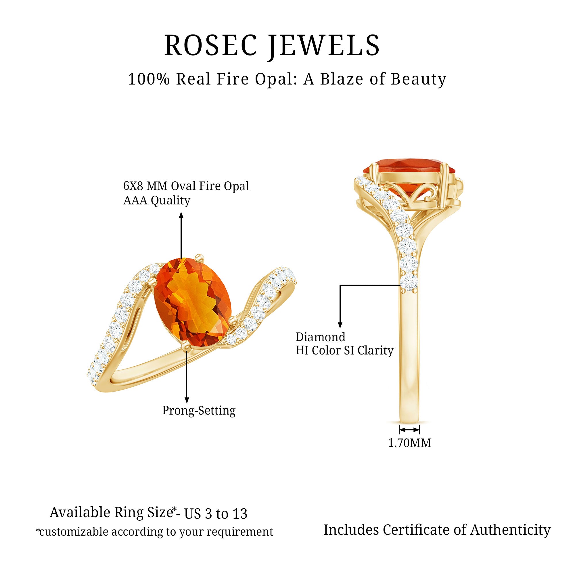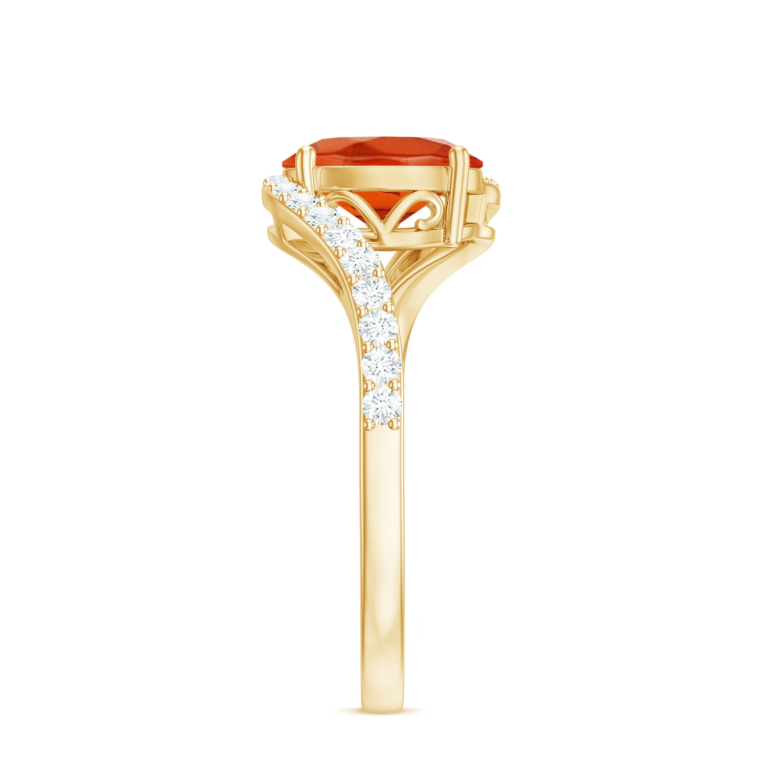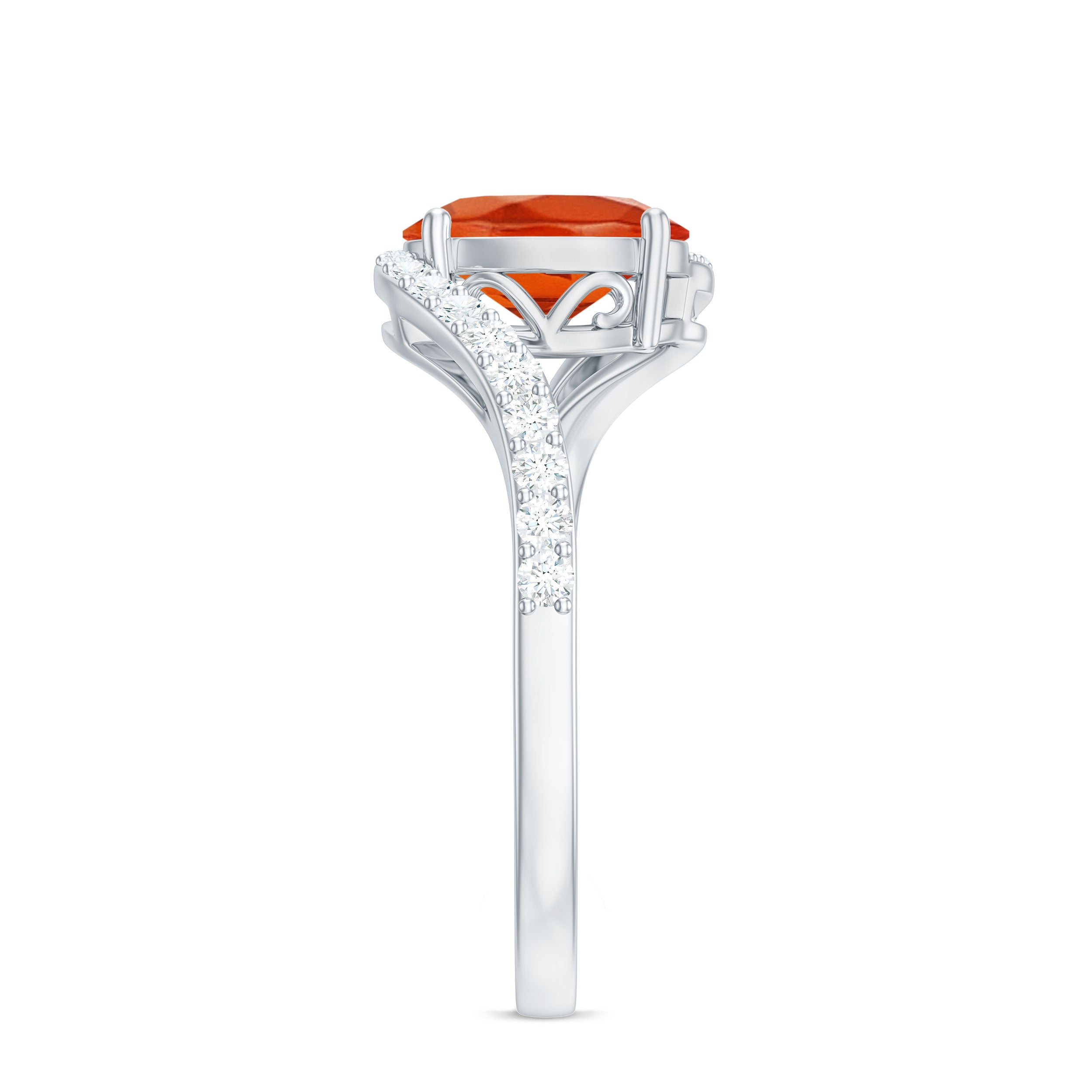 Chic and stylish this Fire Opal gemstone of Oval Cut in Prong Setting with Diamond on the Bypass shank is a perfect piece for your special occasion.