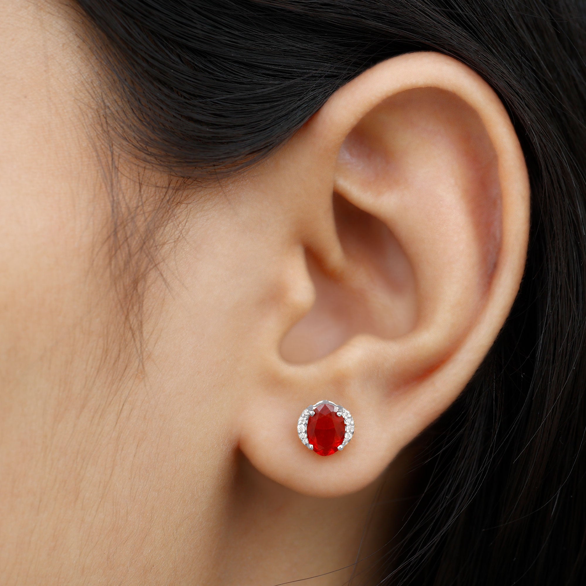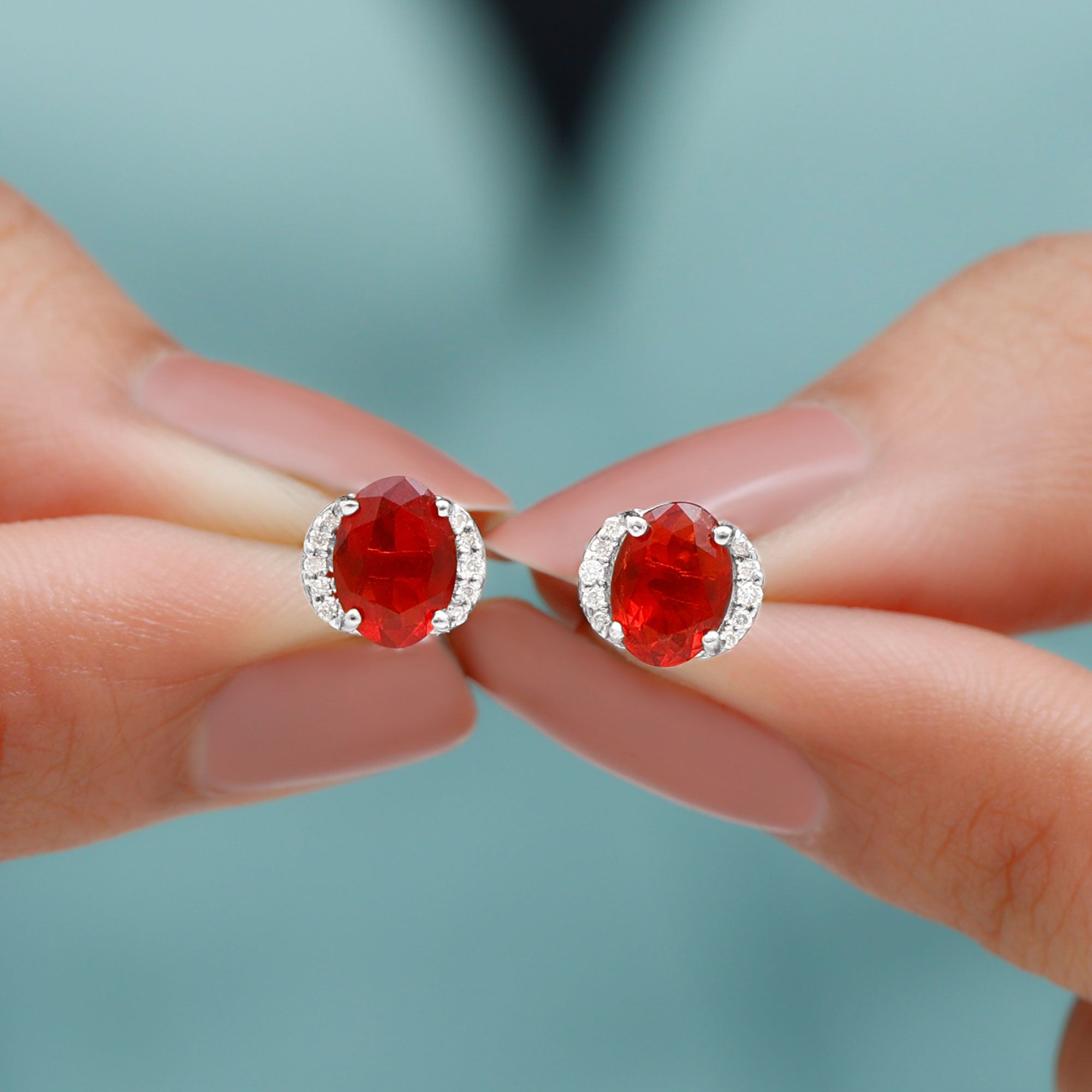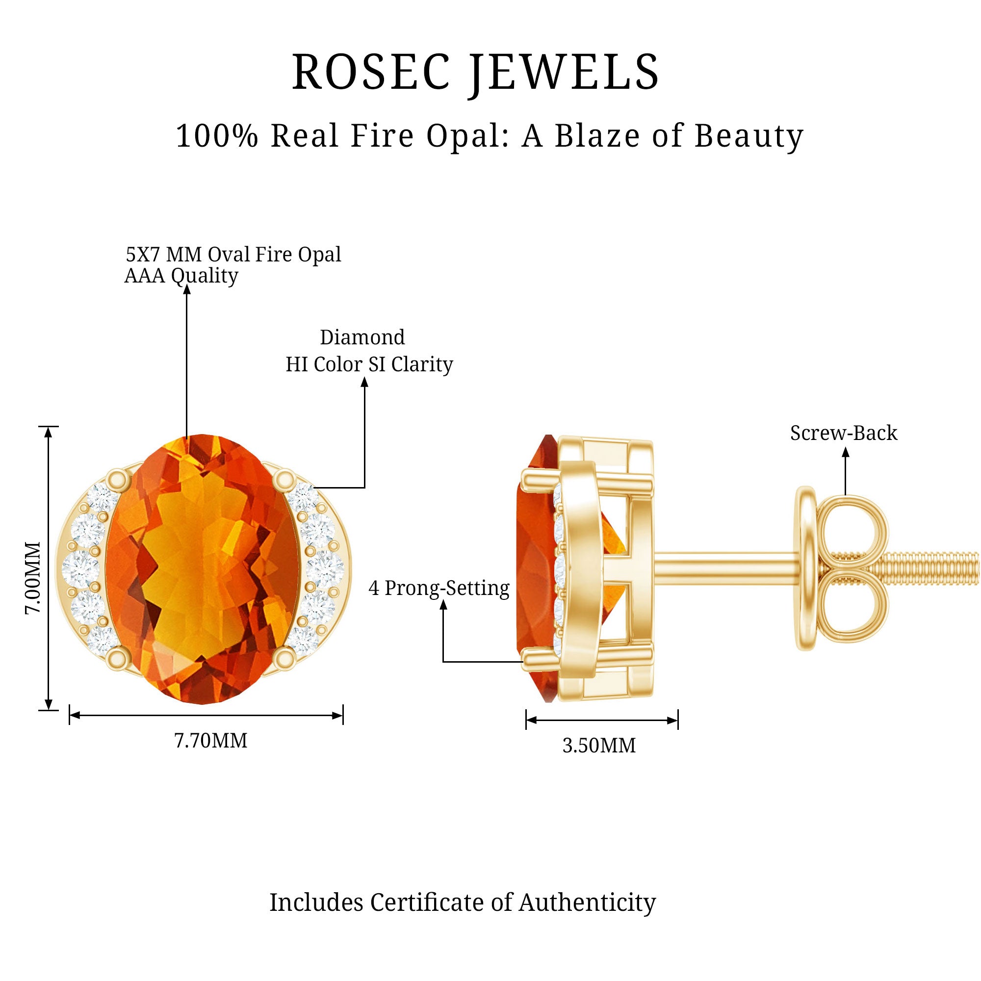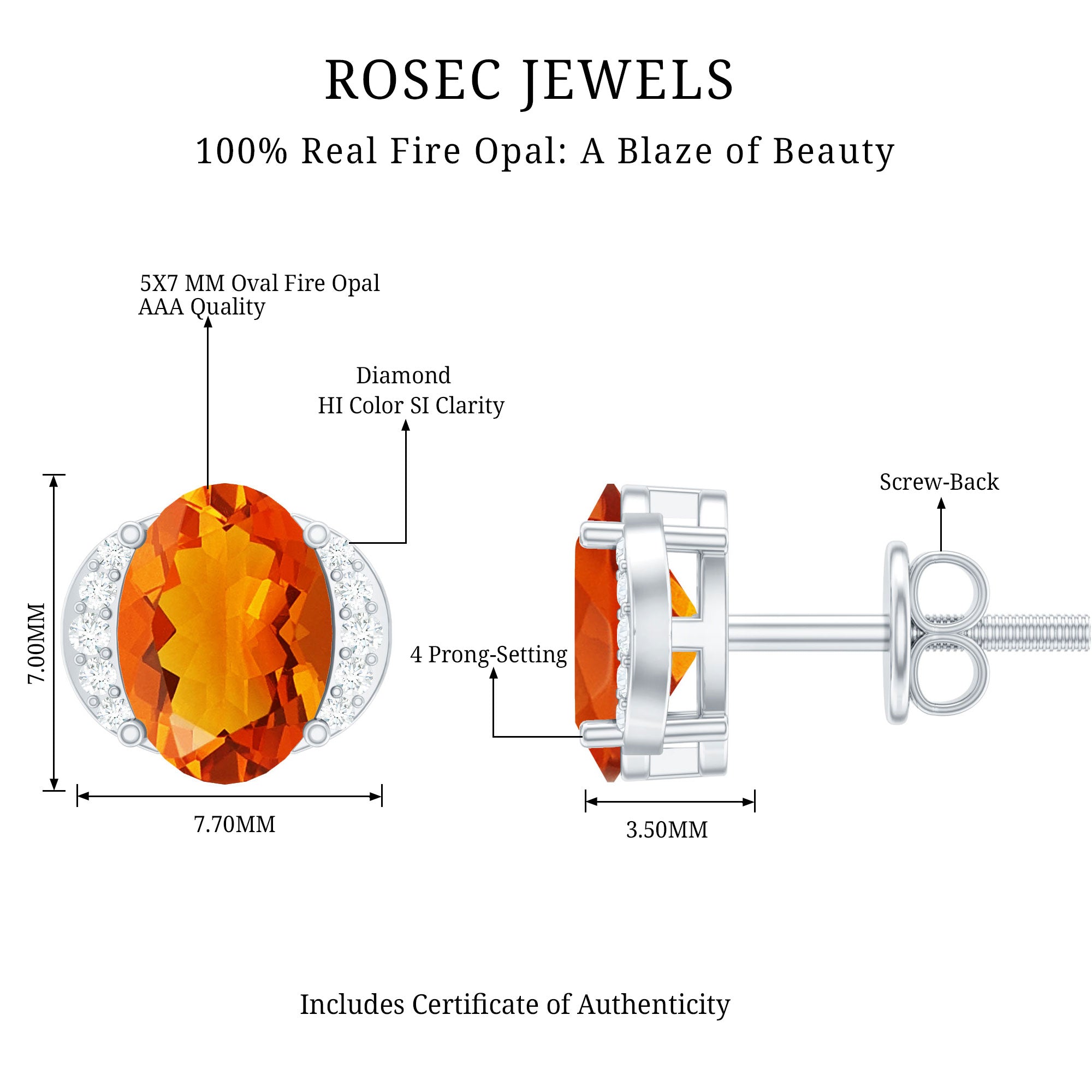 Rosec Jewels Fire Opal Stud Earrings are designed to elevate everyday style with ease. Each earring features a beautiful 5X7MM oval cut fire opal set in prong setting. Small diamond accents add a hint of shimmer, enhancing the natural beauty of the opal without overpowering it. Whether worn with casual clothing, office wear, or evening attire, they add a graceful touch of sophistication. Their decent size makes them noticeable while remaining lightweight and comfortable for daily wear. Secure screw back closures ensure the Opal and Diamond Earrings stay in place throughout the day, offering peace of mind and a comfortable fit. Carefully crafted with attention to detail, these Oval Stud Earrings are designed to last and remain a favorite for years to come. Perfect for anyone who appreciates simple jewelry with a touch of color, these Fire Opal Earrings make a thoughtful gift for birthdays, anniversaries, or personal milestones.