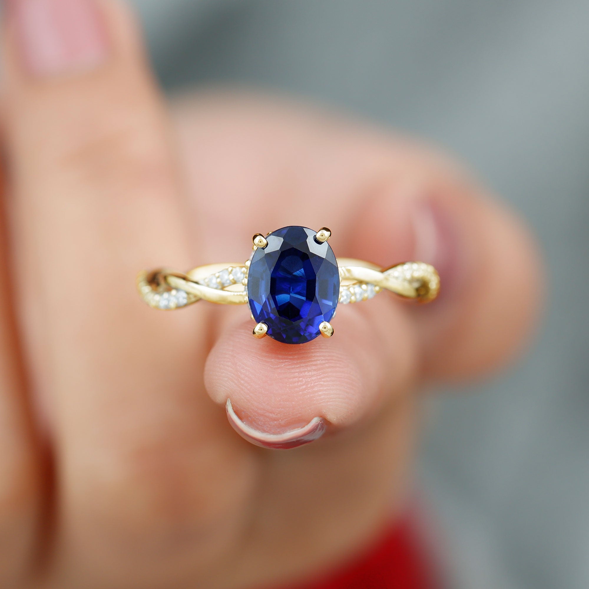 Express your love with this adorable Braided Solitaire Ring, a stunning symbol of affection. The ring features a captivating Oval Cut Lab Created Blue Sapphire in a secure Prong Setting, accented with sparkling Round Shape Diamond for added brilliance. The elegant braided design adds a touch of sophistication, making it a cherished piece shell treasure forever. Let this stunning Solitaire Ring be a constant reminder of your love and admiration, a timeless and meaningful gift to make her feel truly special and cherished.