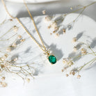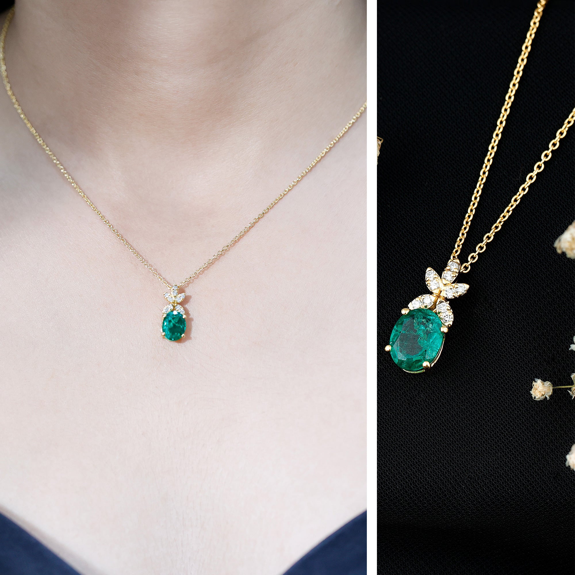 Let your love story shine through with this floral inspired Emerald Necklace. Crafted with care in 14K yellow gold plated silver, this piece brings together graceful design and meaningful detail, making it a beautiful choice for your big day, or any day you want to feel extra special. At the center of the design sits a 7X9 MM oval cut lab created emerald, secured with prong setting that allows it to gently catch the light. Above the center stone, a delicate floral motif blooms with round lab grown diamonds, adding a soft shimmer and a lovely romantic touch. The Emerald and Diamond Necklace is suspended from a polished, lightweight chain that drapes comfortably across the neckline. It is subtle enough to wear alone, yet detailed enough to stand out, especially for moments that call for something extra meaningful. Whether you are walking down the aisle, sharing a special evening, or simply dressing up for a quiet afternoon, this Emerald Flower Pendant adds a gentle glow and a touch of thoughtful elegance. Perfect as a Wedding Necklace for Bride, a gift for someone close, or a piece you treat yourself to. It comes beautifully presented in a signature jewelry box and includes a certificate of authenticity, so you can treasure it with confidence.