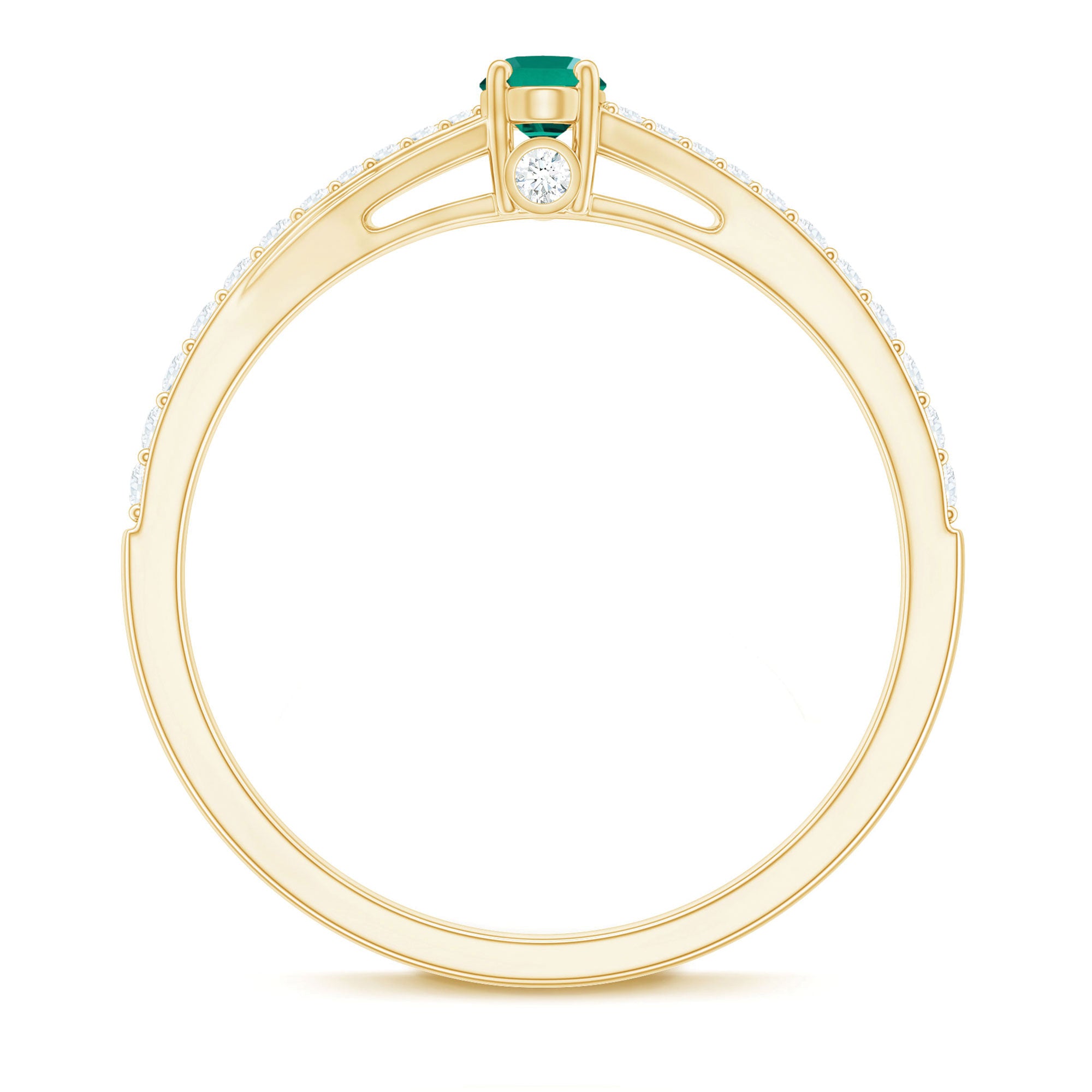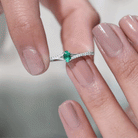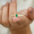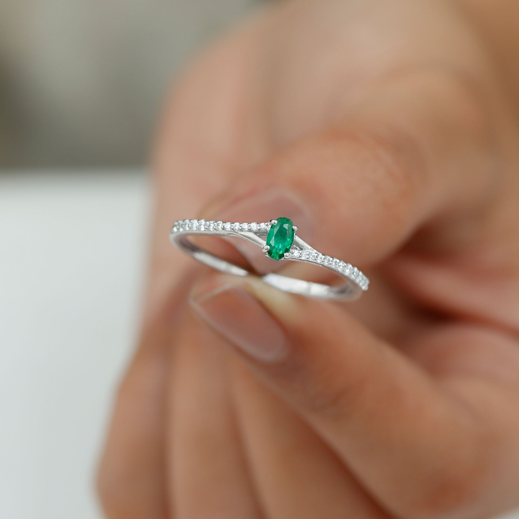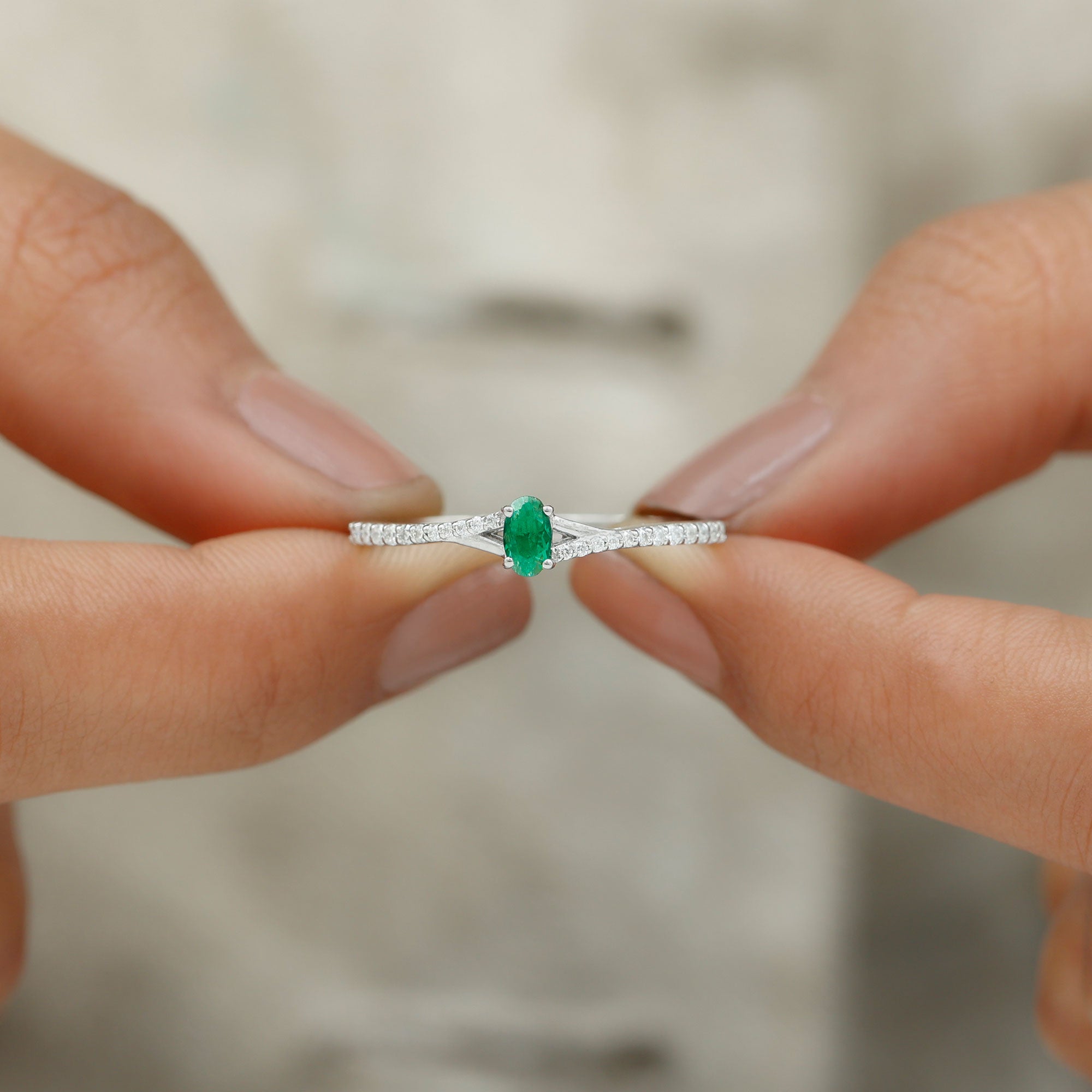 Discover the allure of modern romance with this Lab Emerald Promise Ring having an eye-catching allure. It features a mesmerizing 3X5 MM Oval Shaped Lab Created Emerald, celebrated for its rich green hue and brilliant sparkle. The emerald is elegantly showcased in a split shank band, with a Diamond studded on it, creating a trendy and sophisticated look. Its elegant design draws attention to the stunning center stone while providing a chic edge. Perfect for celebrating a special promise or marking a memorable occasion, this Promise Ring for Her combines classic elegance with a fresh and on-trend flair. This Emerald and Diamond Ring is a heartfelt present or a standout piece in your jewelry collection that makes a bold statement of love and style.