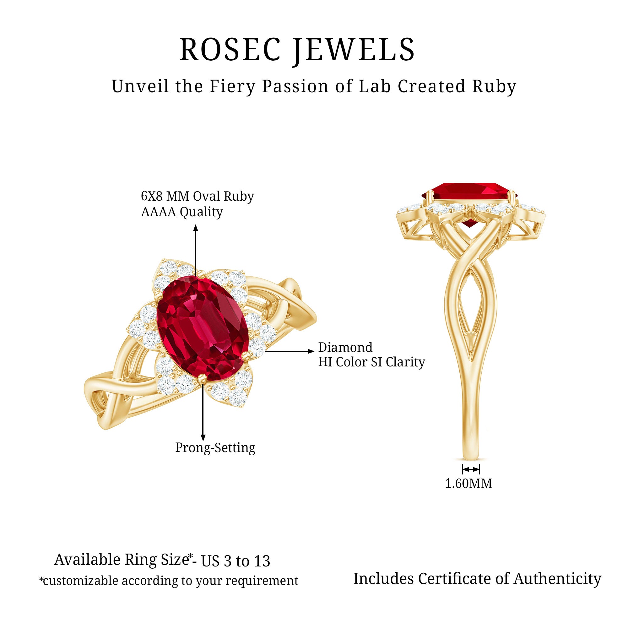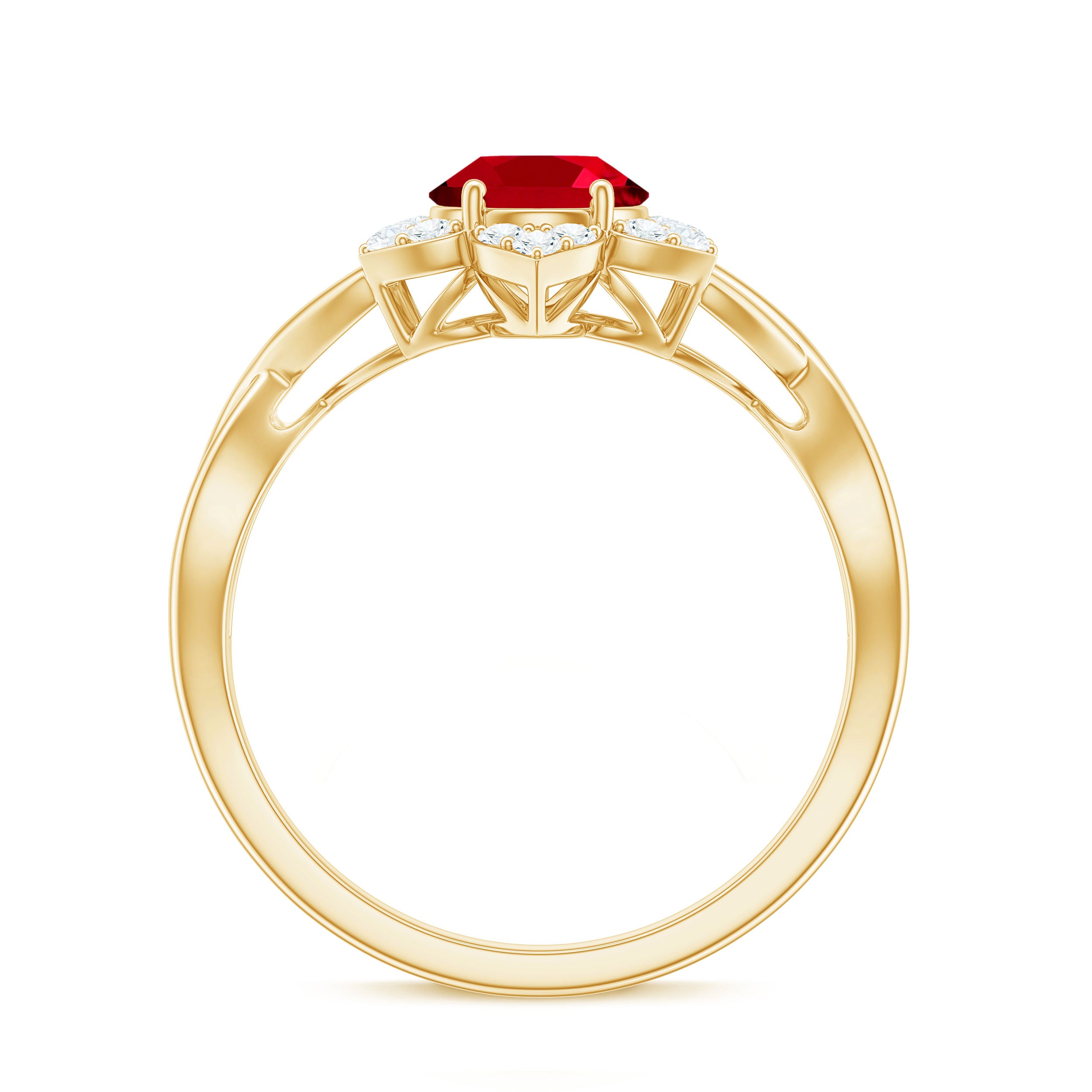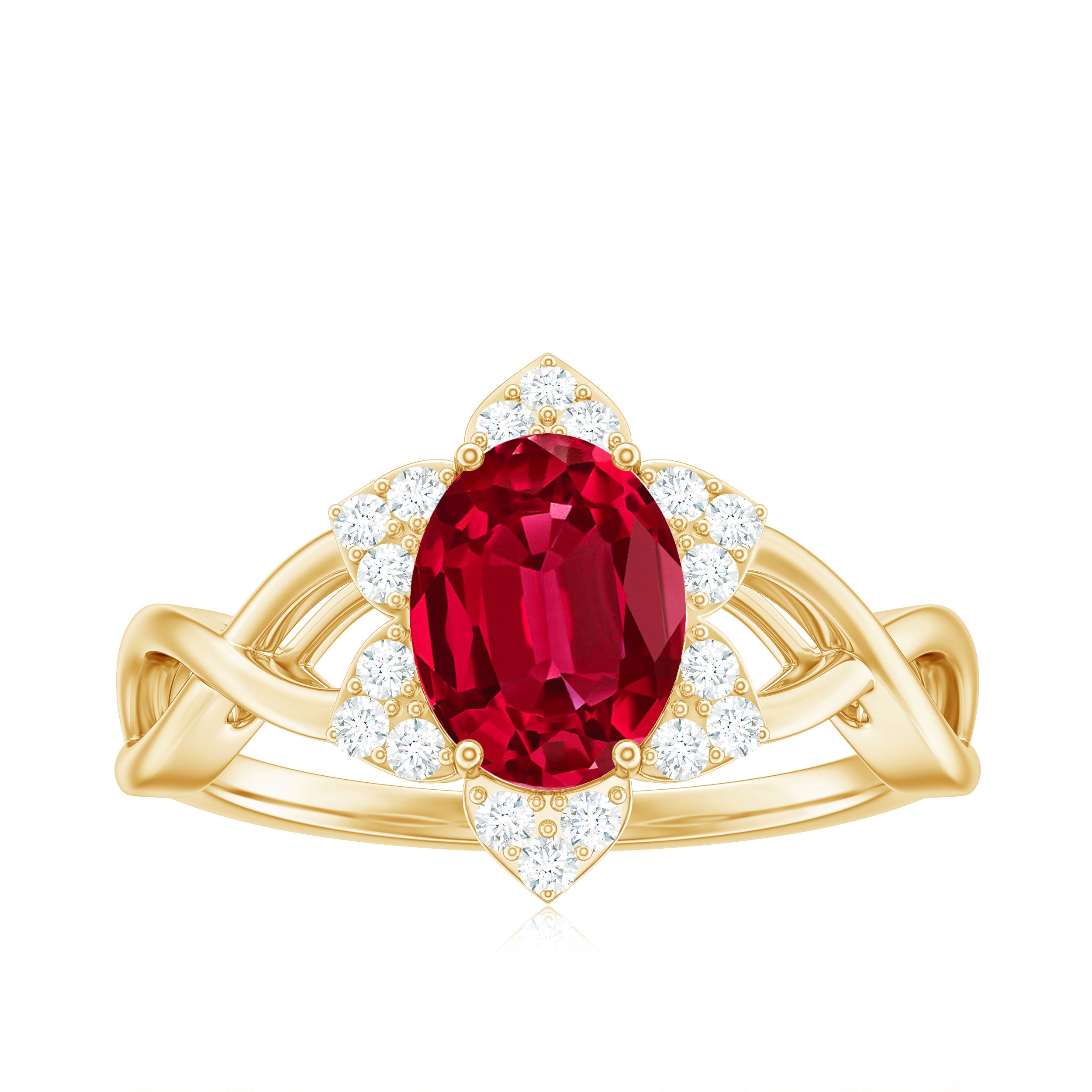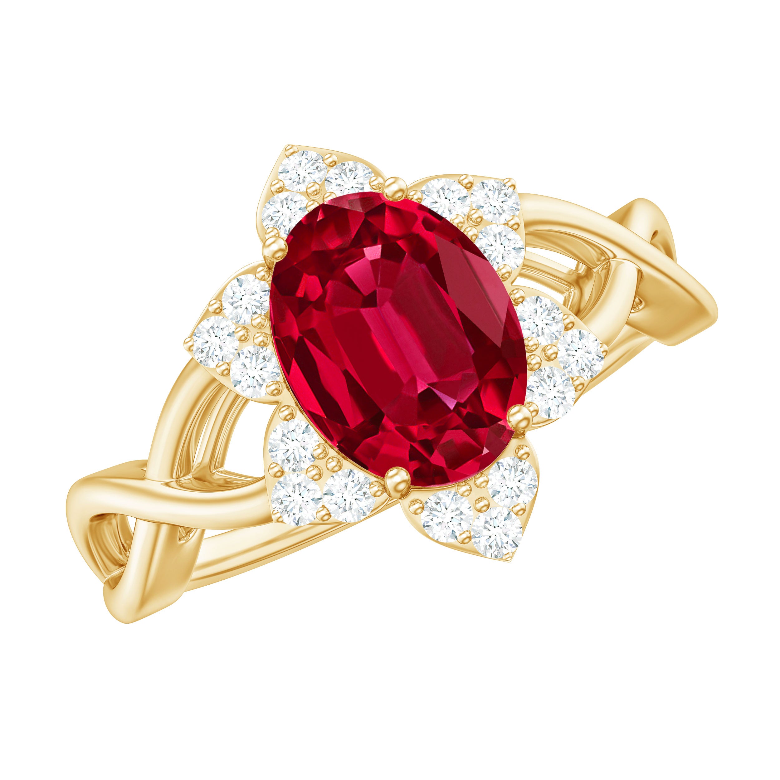 Celebrate romance with this Floral Ring. The Oval Shape Lab Created Ruby blooms at the center, embraced by a delicate Crossover design. Shimmering Diamond gemstones form a halo, enhancing its allure. This Lab Grown Ruby Ring captures the beauty of loves journey, making it a cherished symbol of devotion and elegance.