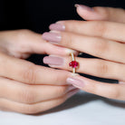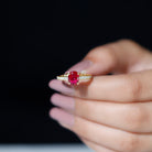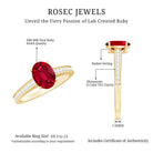 Elevate your everyday moments with this exquisite Solitaire Ring, featuring an Oval Shape Created Ruby elegantly set as a captivating solitaire within basket setting. Accompanied by Round Shape Moissanite side stones secured in surface prong settings, this created ruby ring adds a touch of brilliance to your party wear outfits. With a wide variety of metal options available, you can personalize this ring to your unique taste and style, making each day a special occasion.