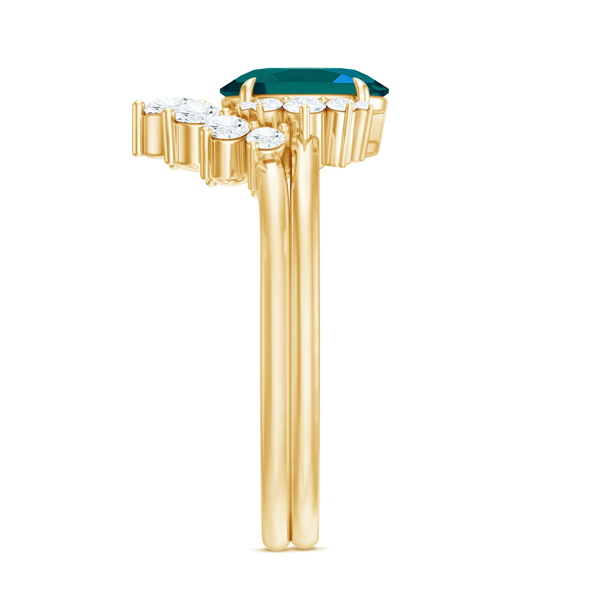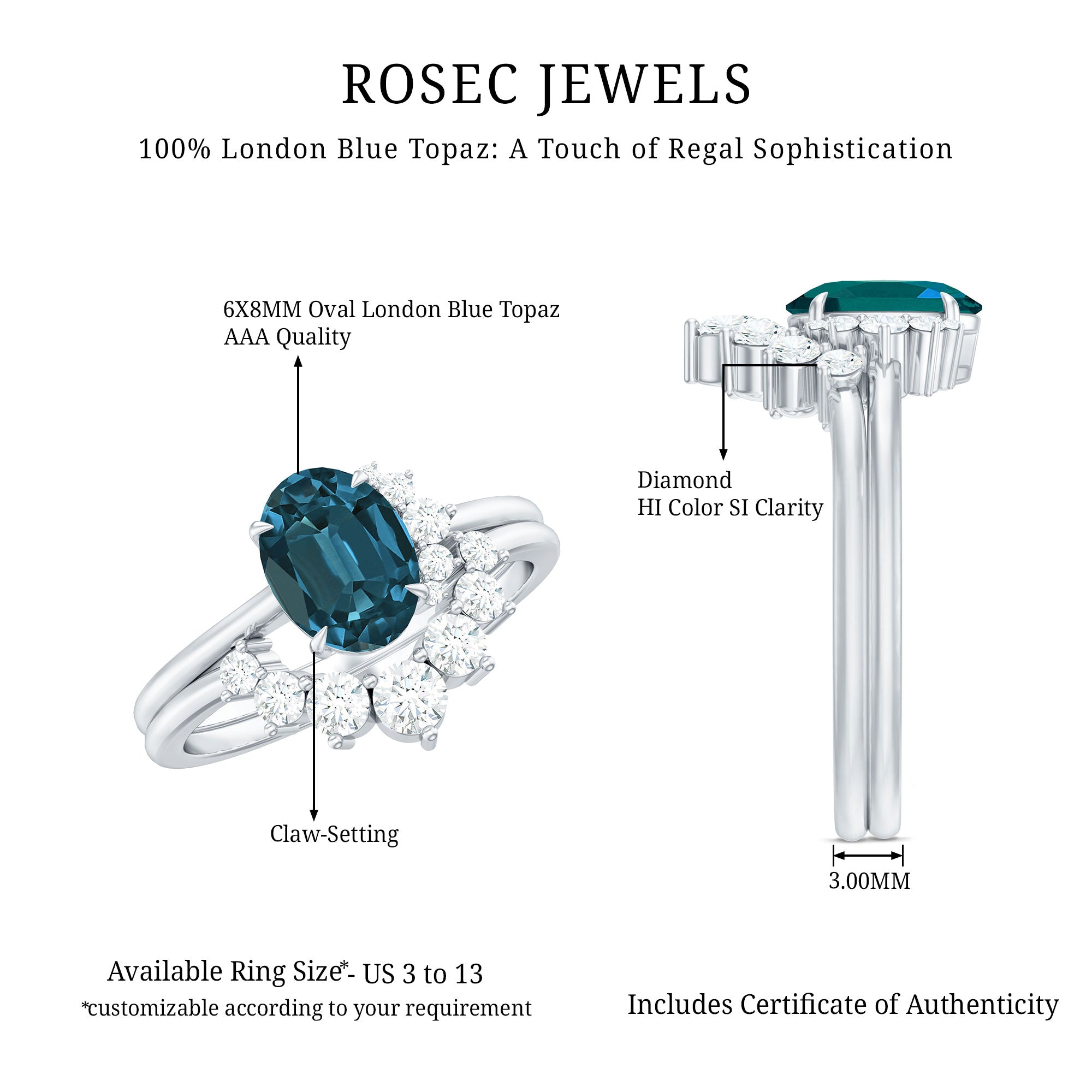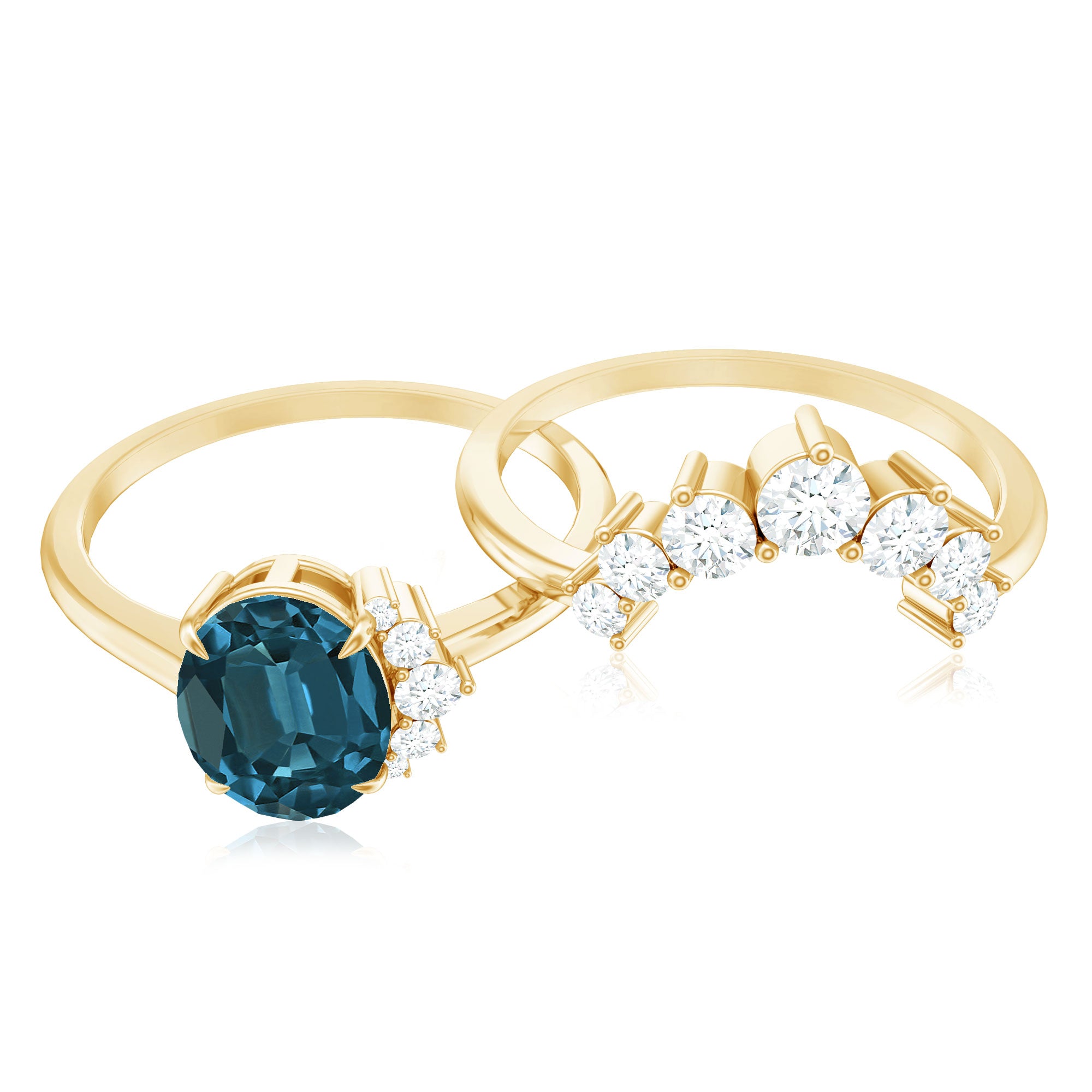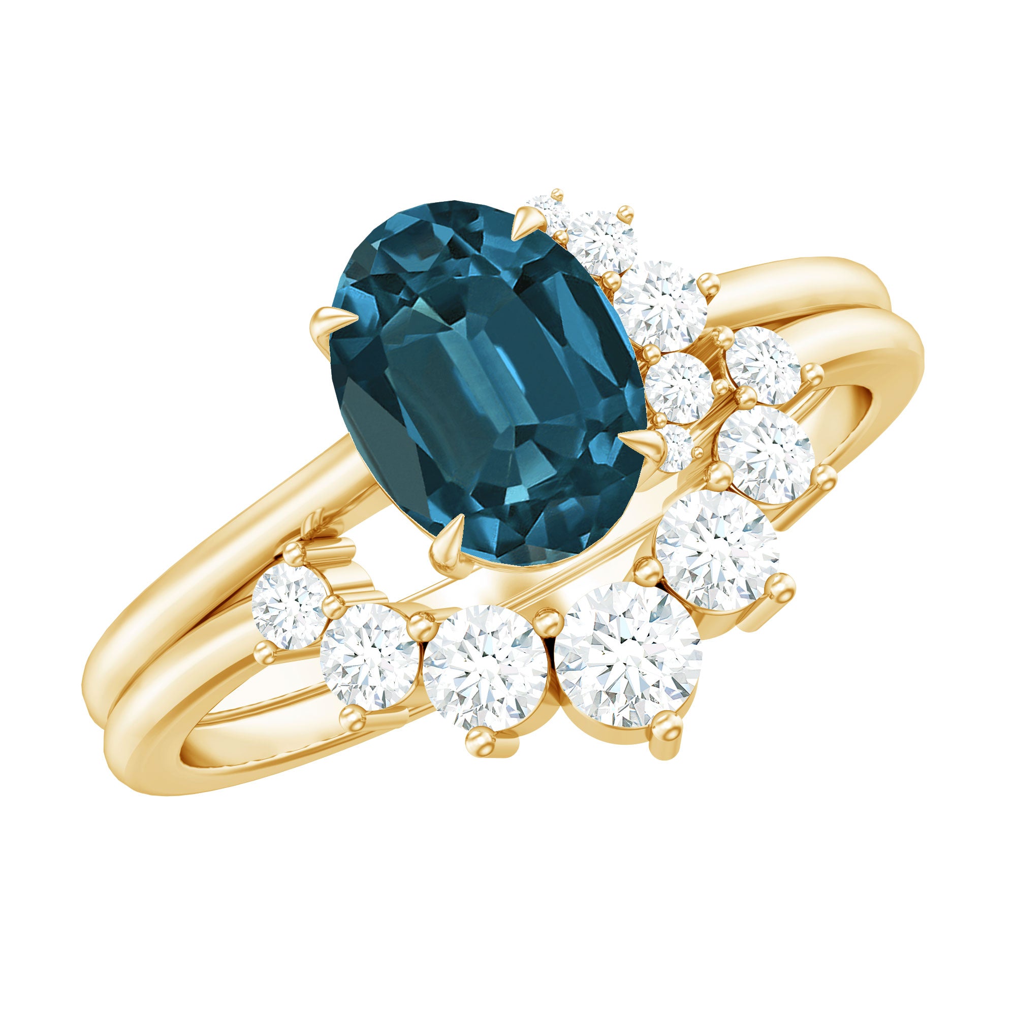 Begin your everlasting journey with this Blue Topaz Wedding Ring Set, which embodies the profound nature of your bond and the elegance of your shared experiences. This Blue Topaz Engagement Ring Set is meticulously crafted to encapsulate the sentiments behind each vow, serving as a timeless emblem of affection and fidelity. The focal point of the engagement ring features an 6X8 MM oval-shaped London Blue Topaz, securely held in a claw setting accompanied by 5 small round shape Diamond accents. Accompanying the engagement ring is a delicate curved enhancer band, designed to fit flawlessly around the central stone. This coordinating band is adorned with shimmering round-cut diamonds in graduated style, forming a stunning frame that enhances the overall brilliance and allure of the set. The curved silhouette captures attention and accentuates the oval shape topaz, rendering this Solitaire Bridal Ring Set a captivating piece from every perspective. To commemorate a significant occasion, this London Blue Topaz Ring Set presents a considerate and fashionable option. With its refined design and meaningful details, it gently embraces the finger, providing both comfort and aesthetic appeal. An ideal selection for the bride-to-be who cherishes timeless romance with a distinctive flair, this Engagement Ring with Wedding Band Set narrates a tale of love, devotion, and the promising future that awaits.