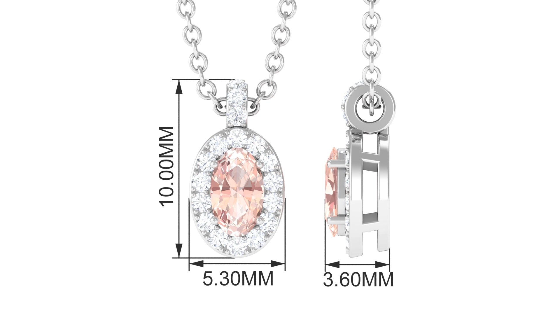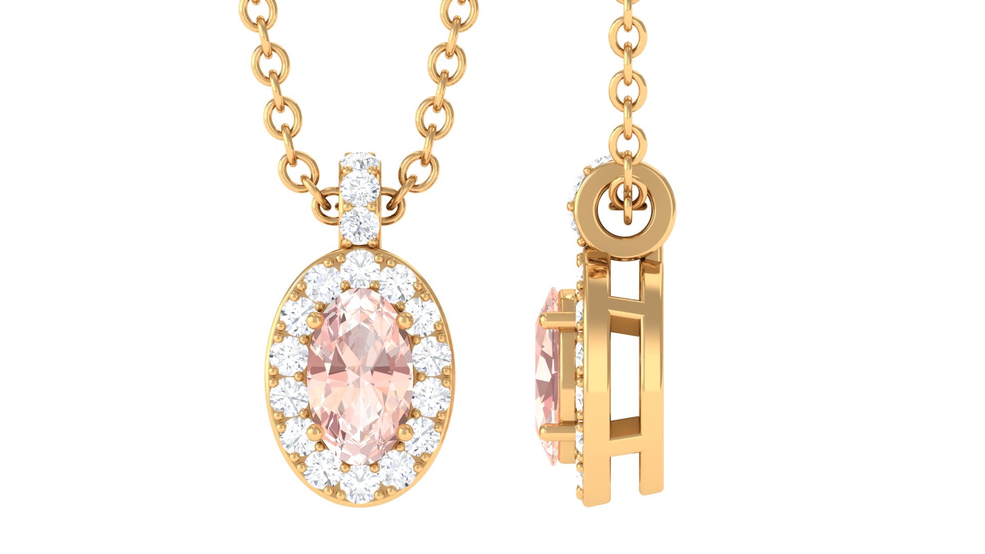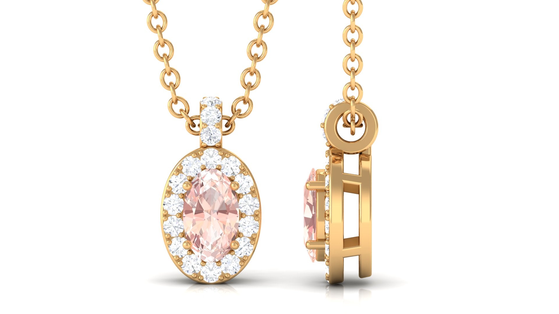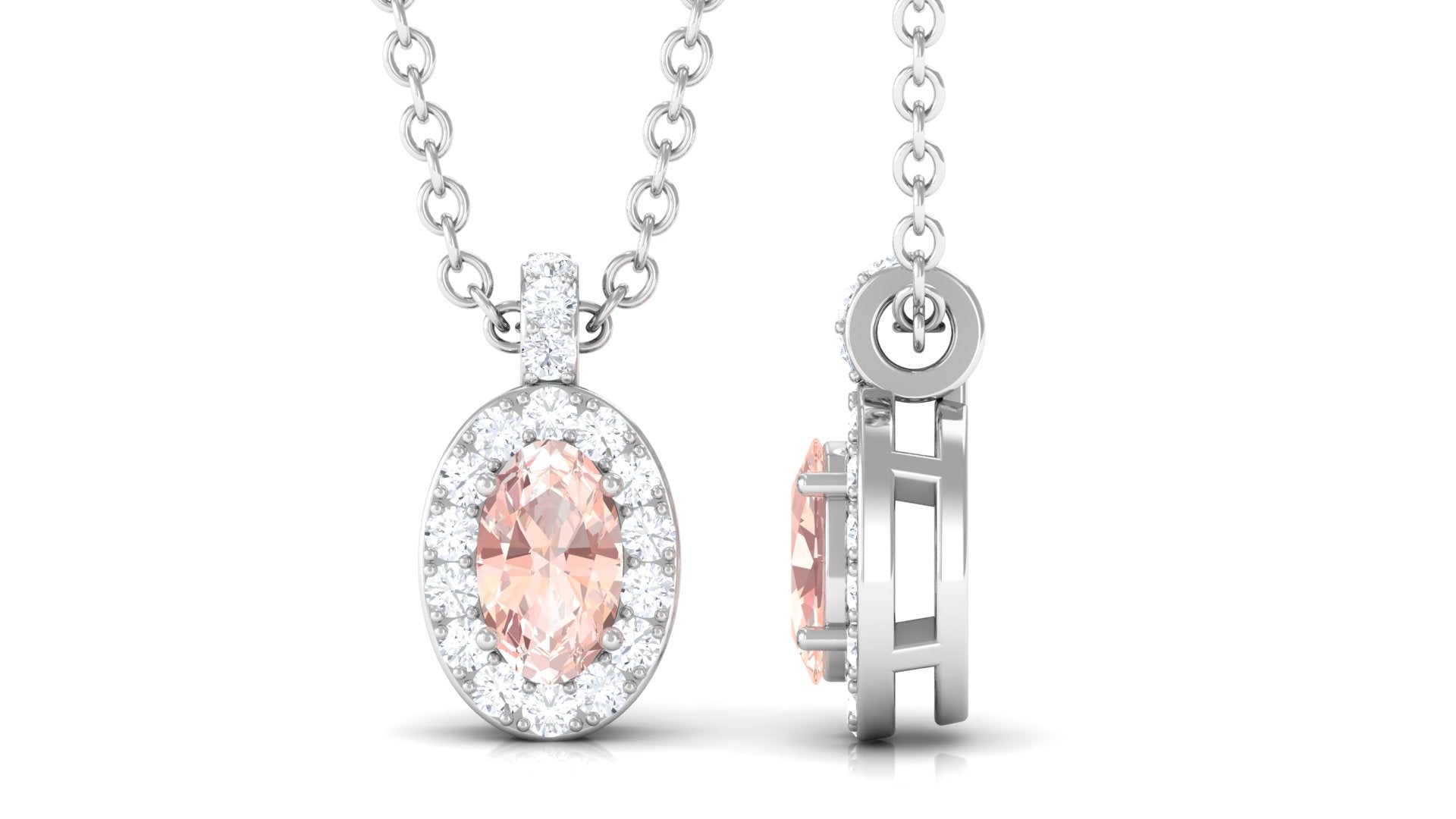 Flaunt this Morganite Pendant Necklace with your attire and leave everyone awestruck. This Morganite Necklace is destined to make everyone a fan of your minimal style, showcasing sparkling Oval Cut Morganite secured by 4 Prong Setting while dainty Round Diamonds studded as Halo and on the bail too. Elevate your casual and special attires by pairing up this Pendant Necklace crafted with Hallmarked Metal. Create a special moment by giving this Morganite Necklace to your loved one.