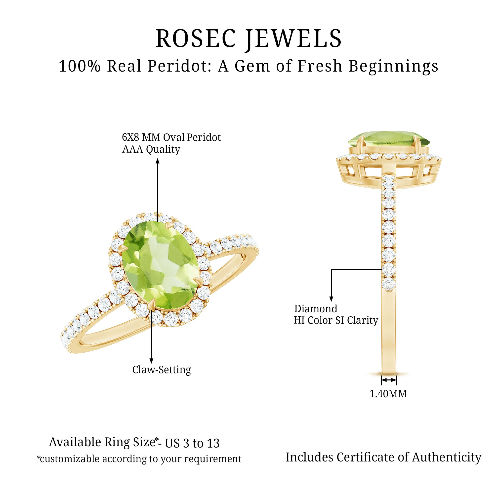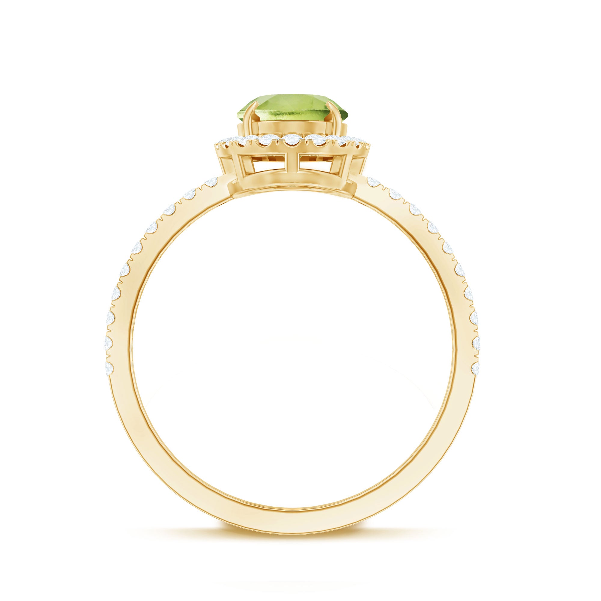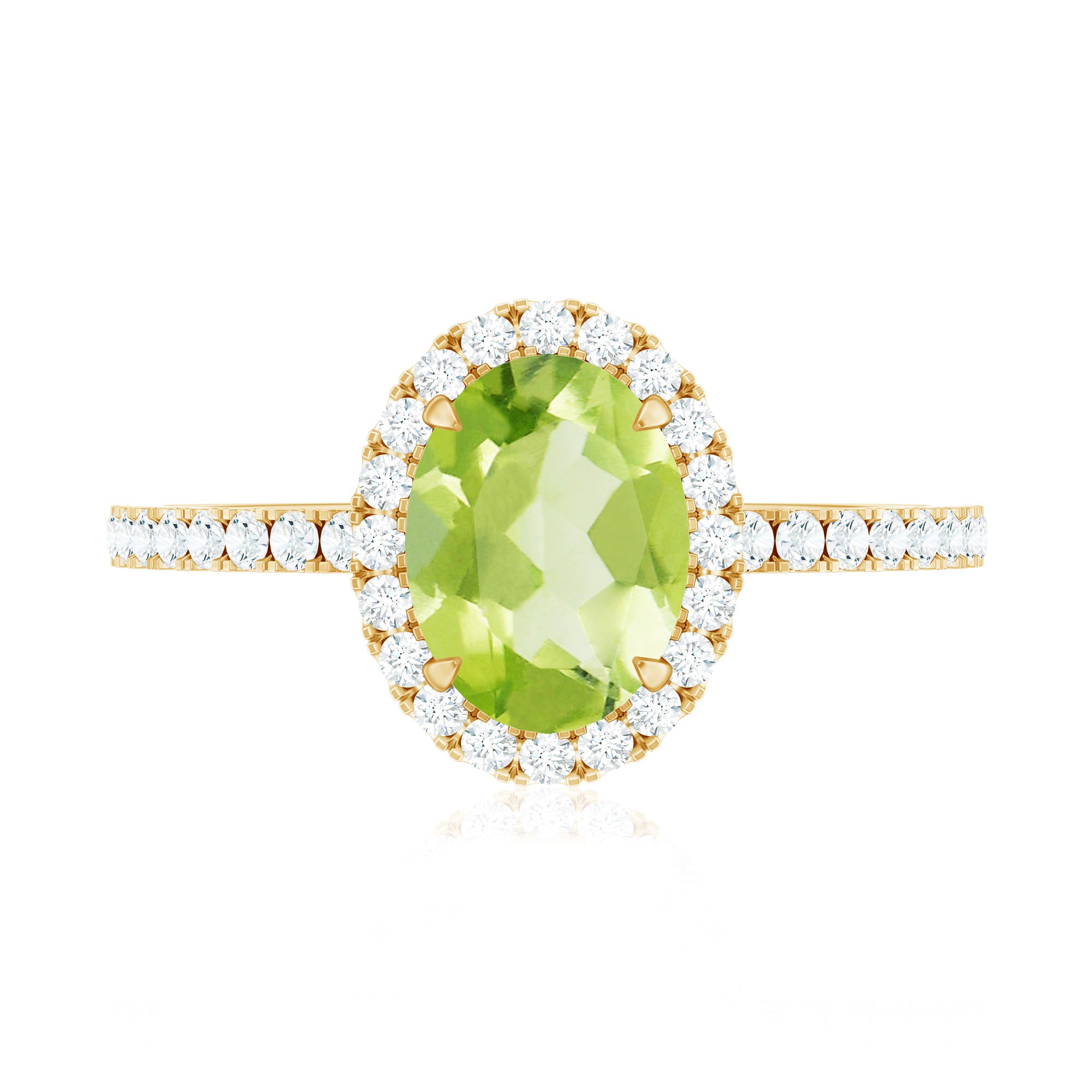 An appealing Peridot in a prong setting is surrounded by a glimmering Diamond halo. The shoulders are also adorned with Diamond for added sparkle. Crafted in gold, this Oval Peridot Engagement Ring is simply luxurious. Make your significant other extremely happy by presenting her this Peridot Diamond Ring.