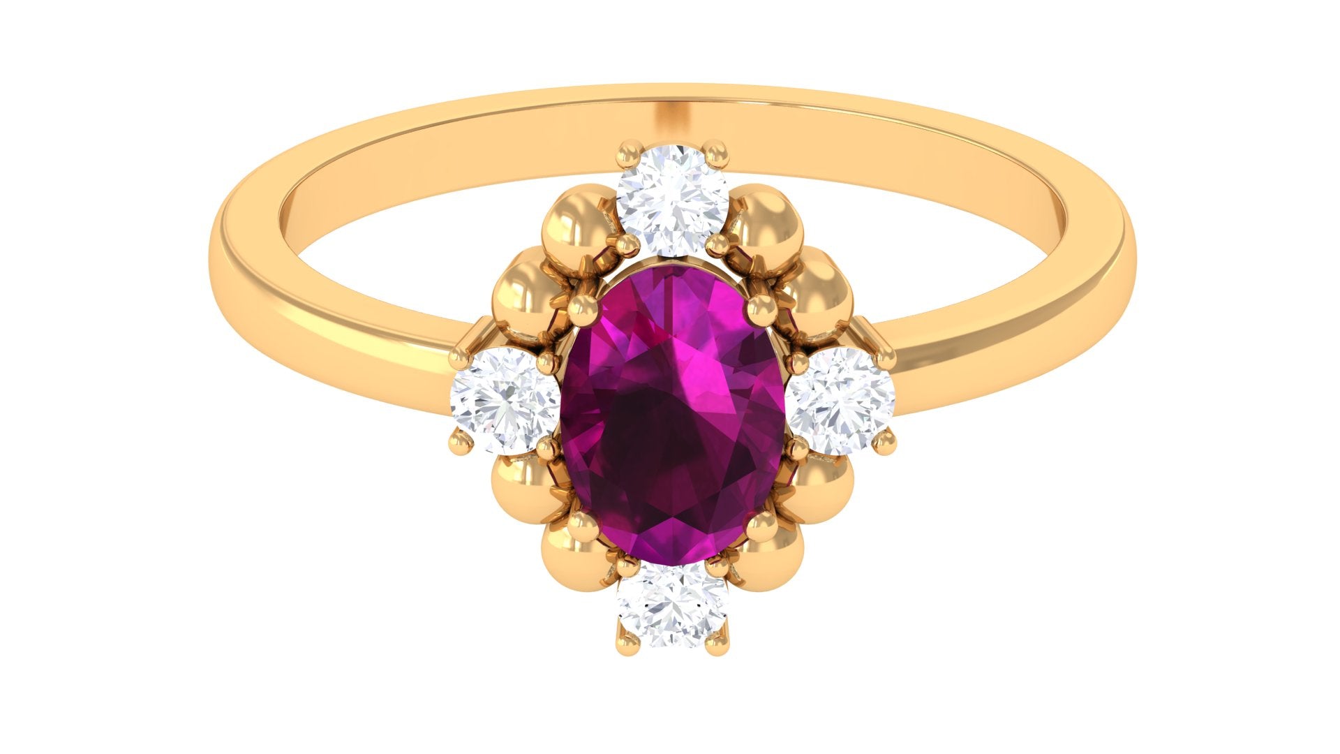 Elevate your style with this gorgeous Rhodolite Ring. It features an oval cut Rhodolite and Diamond accents set in a gold cocktail ring design. Perfect for any outfit, this Rhodolite Cocktail Ring adds a touch of elegance to any look.