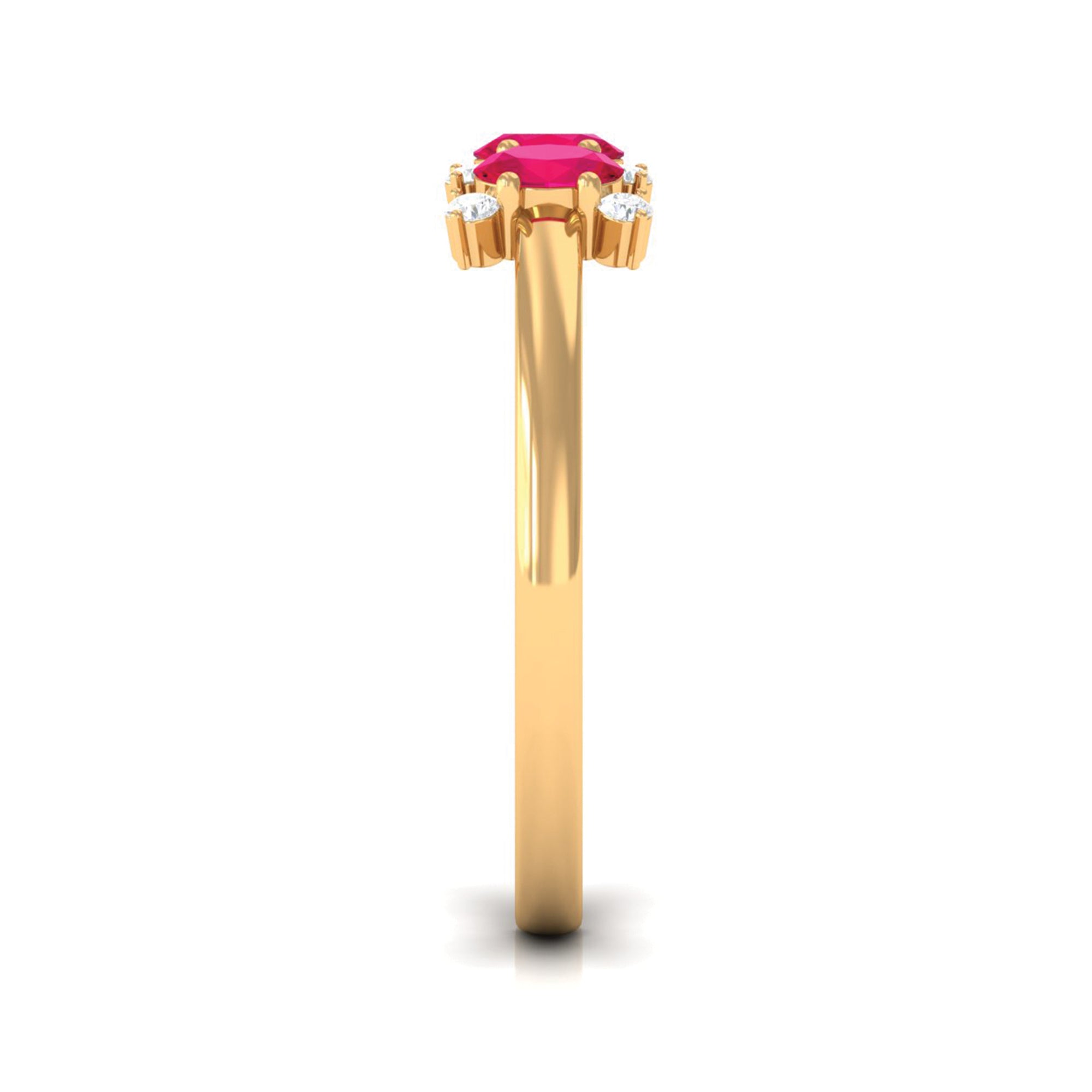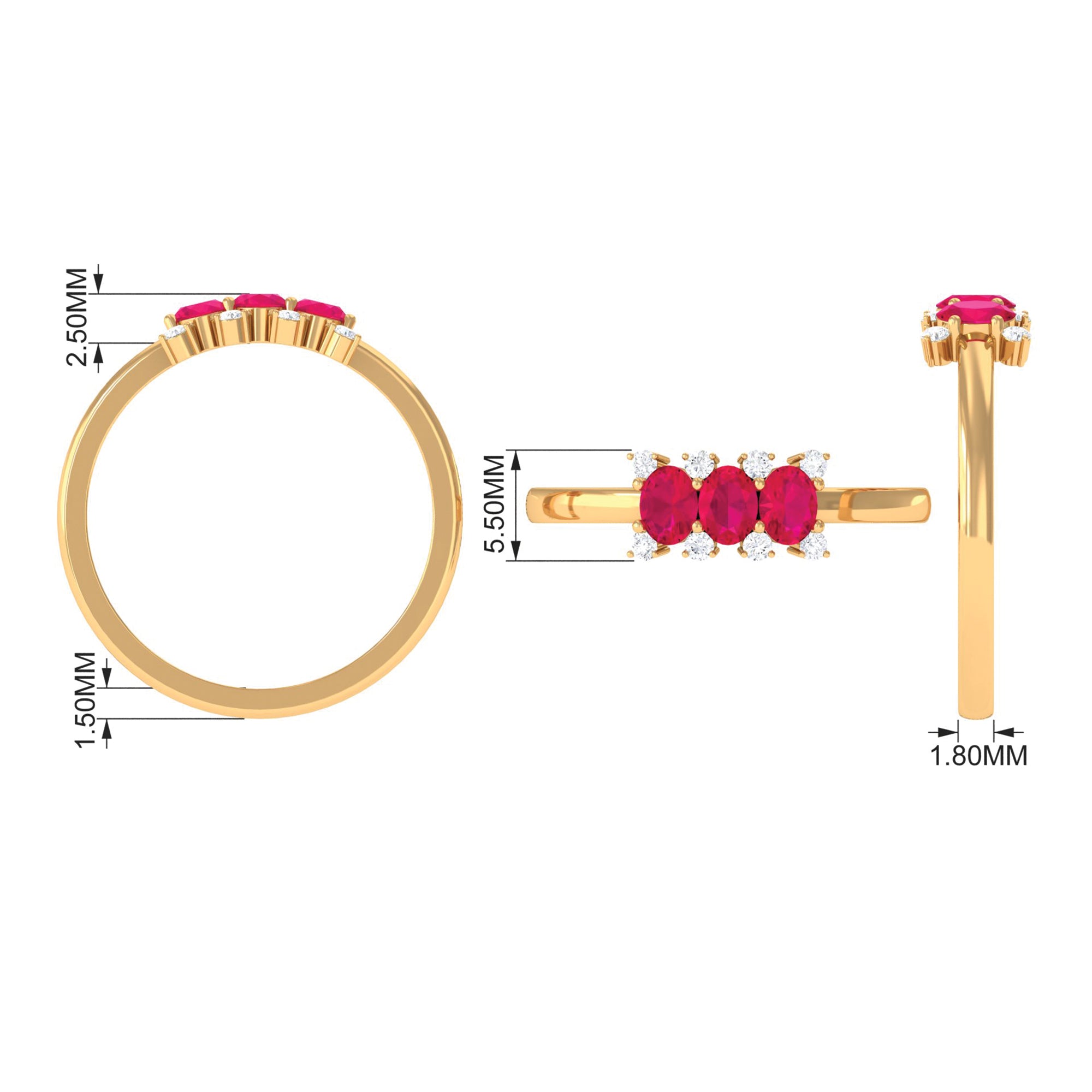 Make your love go forever with this Three Stone Promise Ring for a woman. This Three Stone Ring is consisting of Oval Shape Ruby and Round Diamond set in a prong setting.