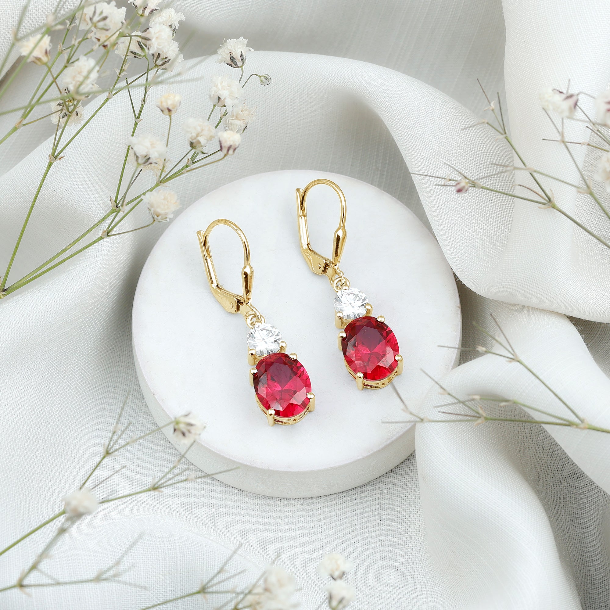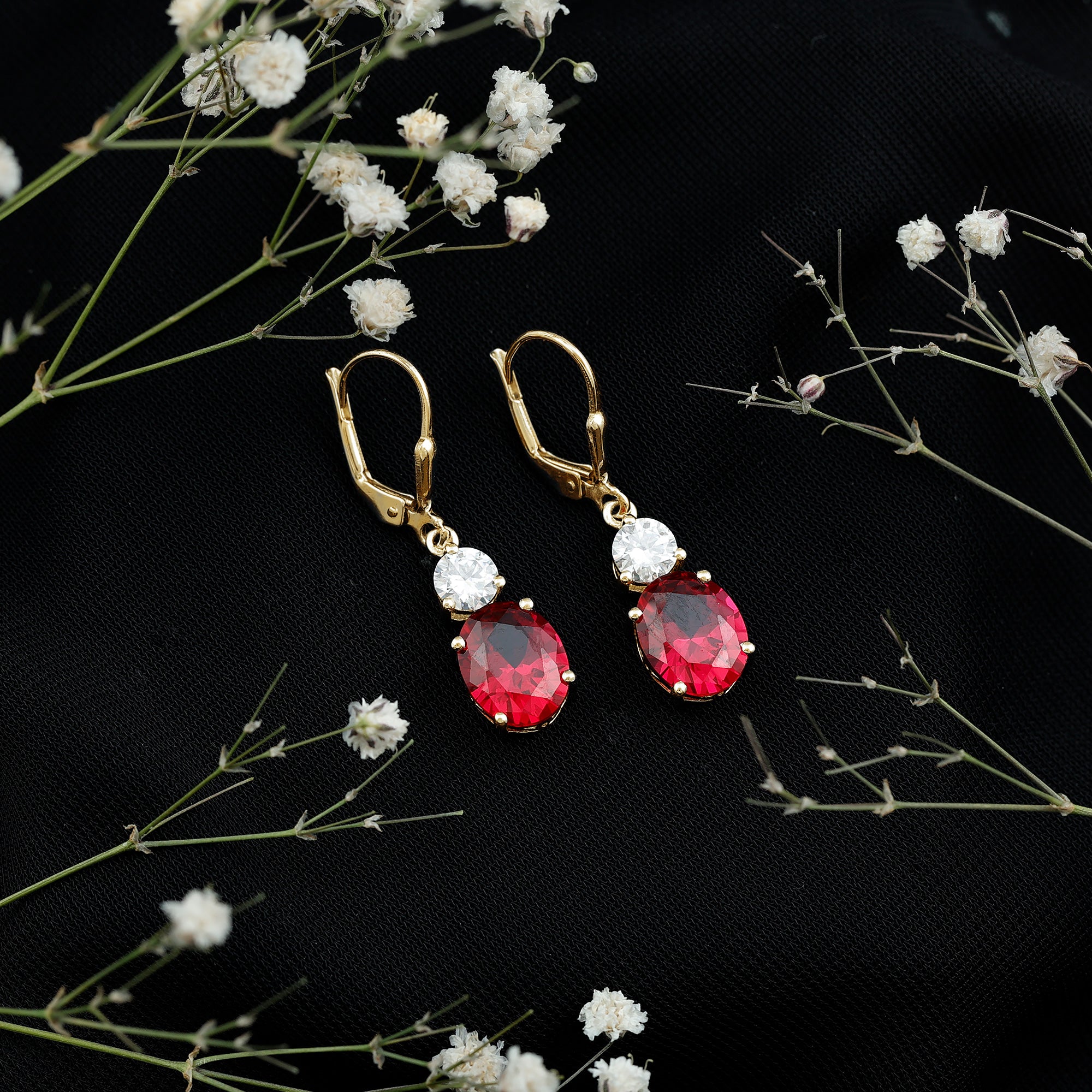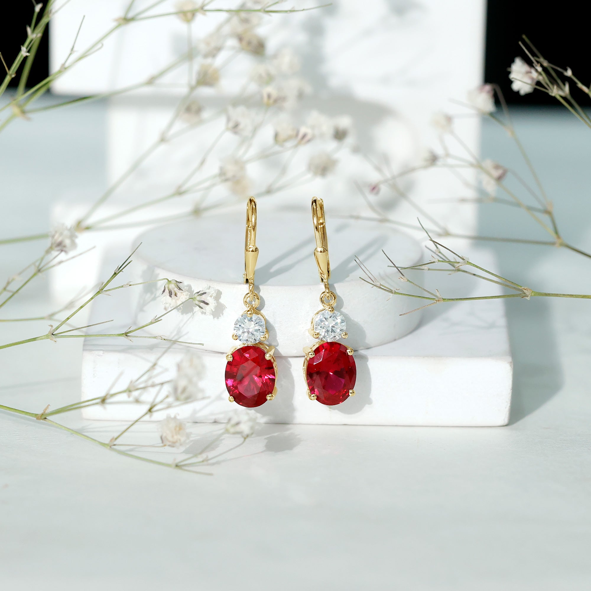 Like a glimmer of passion and grace, these Lab Grown Ruby Earrings bring a radiant charm that instantly lights up your look. Designed with care and crafted from fine quality metal, these Hoop Drop Earrings feature an 8X10 MM oval cut Lab Created Ruby paired beautifully with a 5 MM round Moissanite. Each stone is securely set in prongs, hanging gracefully from a sleek leverback closure that lets the Ruby and Moissanite Earrings move gently with every turn, catching the light in a sparkling dance. Every detail is finely finished, giving these Oval Drop Earrings a refined and graceful appearance that suits any occasion. Whether worn for a special celebration or to add a hint of luxury to your everyday style, these Ruby Dangle Earrings are made to stand out effortlessly. They reflect a mix of sophistication and simplicity, offering a style that feels both fresh and everlasting. Arriving in a beautiful jewelry box with a certificate of authenticity, these Lever Back Earrings make a meaningful gift for someone special or a lovely way to treat yourself.