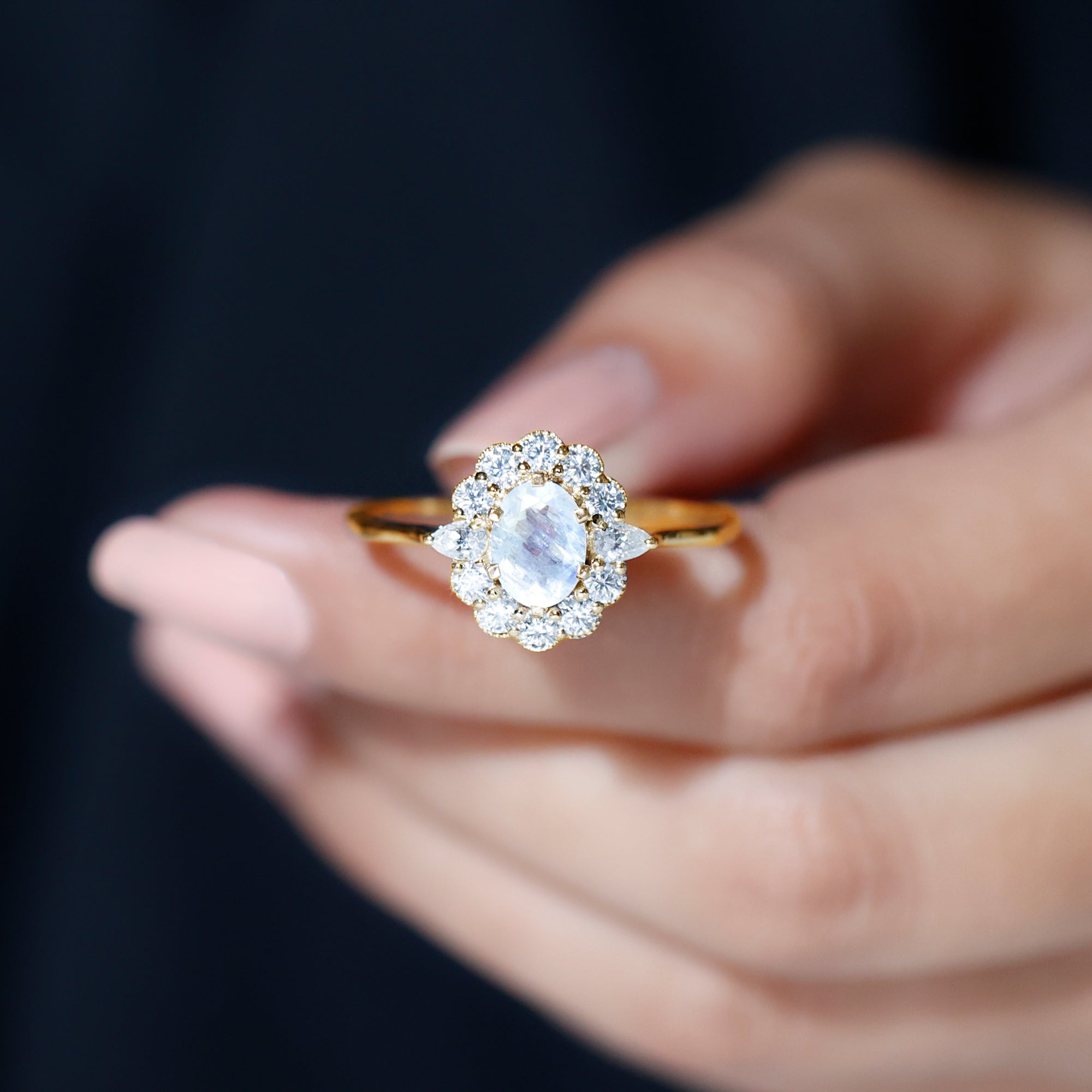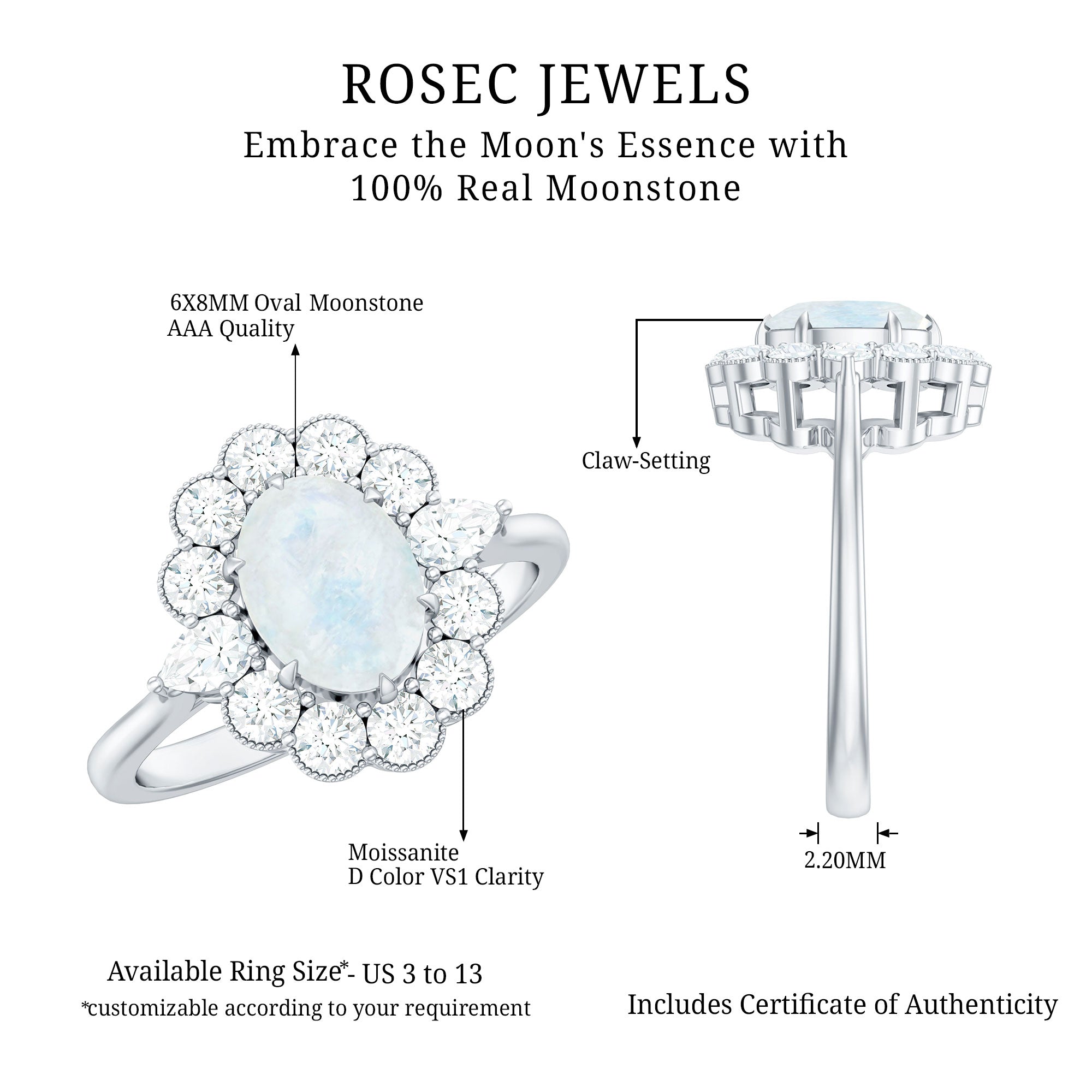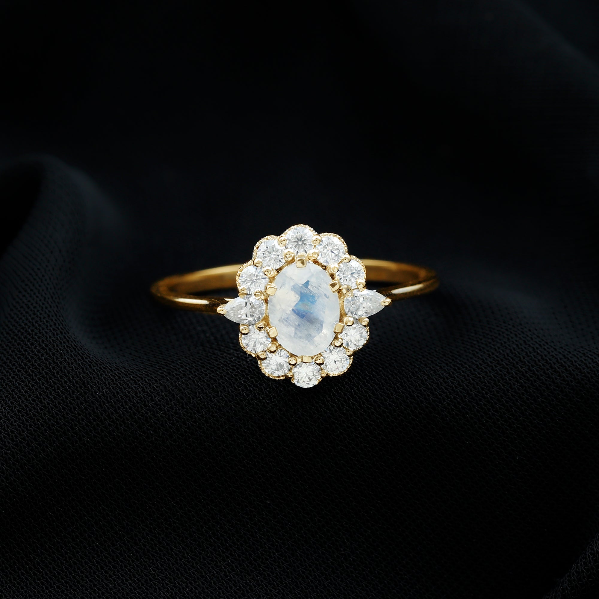 Embrace her bridal ensemble with our Statement Ring, adorned with oval-shaped moonstone in the center wrapped in a halo frame of moissanite exuding a radiant sparkle and brilliance. The exquisite placement of these gemstones embraced by the milgrain design around it makes this Moonstone Ring brilliant. Get this Halo Ring to illuminate your special moments and make them unforgettable.