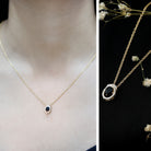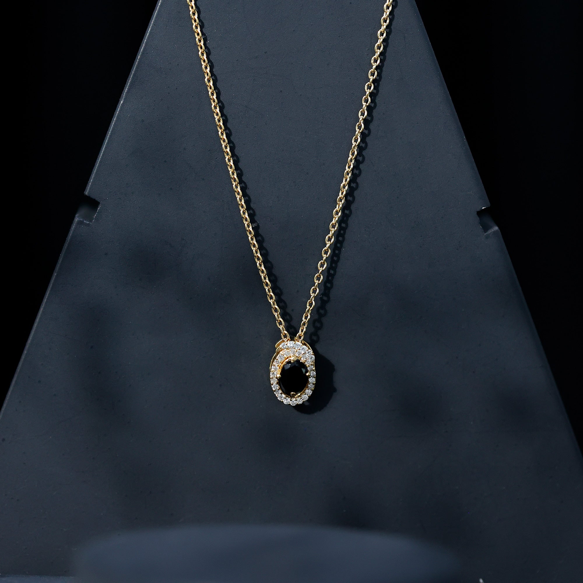 This Black Onyx Necklace is all about that stunning color, contrast, and shine. Crafted in 14k yellow gold plated sterling silver, this Oval Pendant Necklace brings together modern design and timeless charm in the most effortless way. The centerpiece of this Swirl Necklace is a 4X5 MM oval shaped AAA quality Black Onyx set in prong setting. What makes this necklace truly special is its artistic swirl design. Flowing around the center stone is a spiral of round lab grown diamonds, each carefully set to form a shimmering halo. Paired with a strong and stylish cable chain, the Black Onyx and Diamond Necklace sits comfortably and securely, making it easy to wear all day, whether you are heading to work, out for dinner, or just dressing up a simple outfit. It arrives in a signature jewelry box and comes with a certificate of authenticity, making it ready for any special occasion. Whether you are treating yourself or surprising someone you love, this Black and White Necklace is a graceful reminder of balance, strength, and timeless beauty.