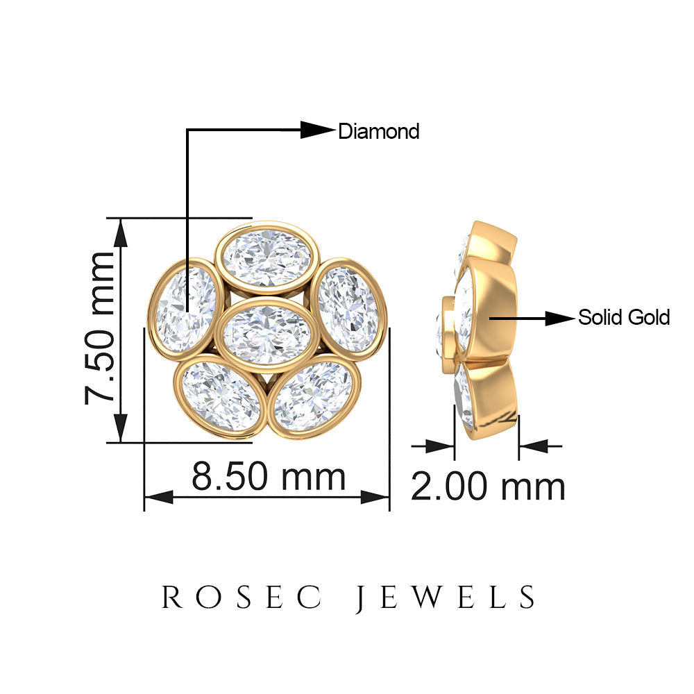 Elevate your favorite outfit with these Cluster Stud Earrings, a shimmering piece that lets you shine like a star. Adorned with Oval Shaped Diamond elegantly set in bezel setting adding a touch of brilliance and sparkle. For security and comfort, these Diamond Earrings are crafted with Screw-Back Closures which keep them intact in the earlobe from day to night. Turn every moment unforgettable with these Stud Earrings specially designed to upgrade your fashion game.