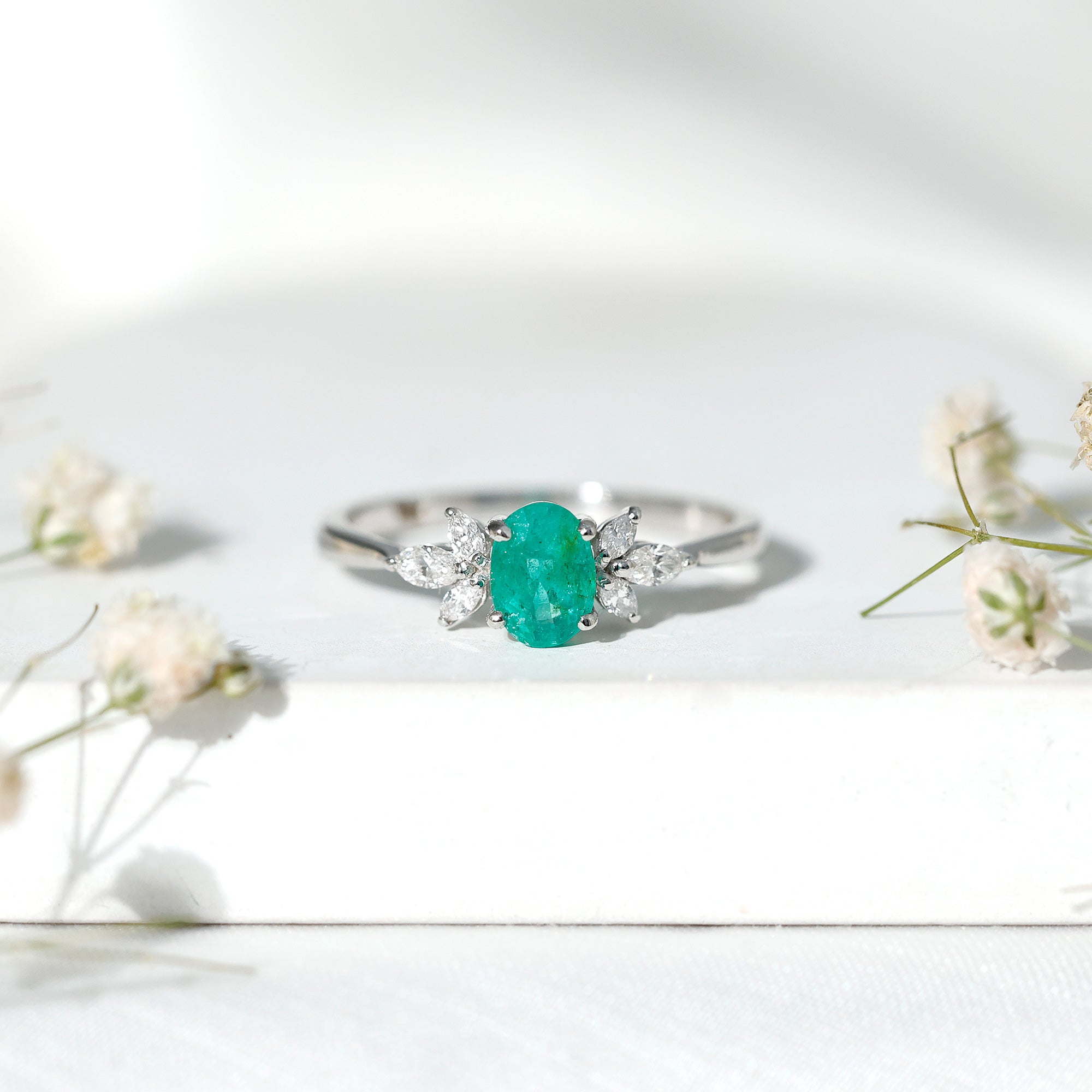 Oval Shaped Emerald Engagement Ring with Marquise Diamond Trio