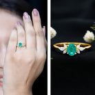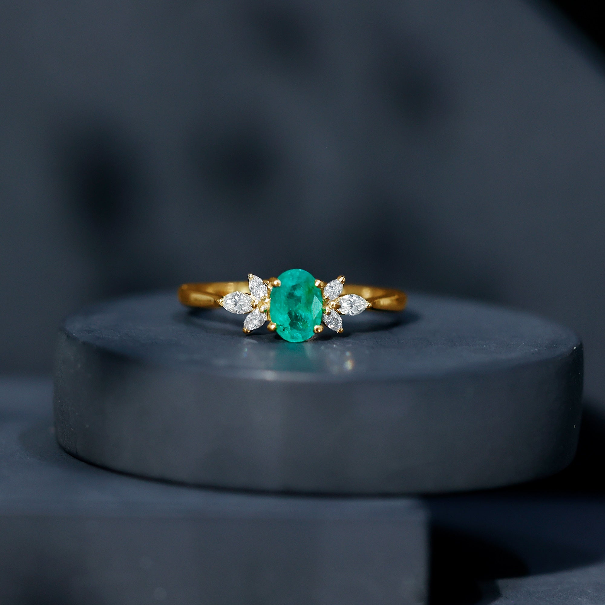 Bring a touch of luxury to your special moments with this stunning Emerald and Diamond Engagement Ring. At its center shines a beautiful 5X7 MM oval shaped emerald, set securely in claw setting. On each side of the center stone, three marquise cut diamonds form a delicate leaf-inspired design, adding a graceful and romantic touch to the overall look. Crafted with care and precision, this Oval Emerald Engagement Ring combines the vibrant green glow of a fine AAA quality emerald with the brilliance of HI-SI quality diamonds. The detailed arrangement of the stones gives the May Birthstone Ring a balanced and refined appearance, making it a timeless piece that captures attention from every angle. Perfect for engagements, anniversaries, or special occasions, this Green Emerald Ring celebrates sophistication and style. The emerald makes it an especially thoughtful choice for someone born in May or anyone who loves the rich beauty of green gemstones. Every gemstone is certified and carefully inspected to meet the highest standards of quality, ensuring that you receive a piece of true craftsmanship and lasting beauty. Presented in an elegant jewelry box, this Emerald and Diamond Ring makes a wonderful gift that will be treasured for years to come.