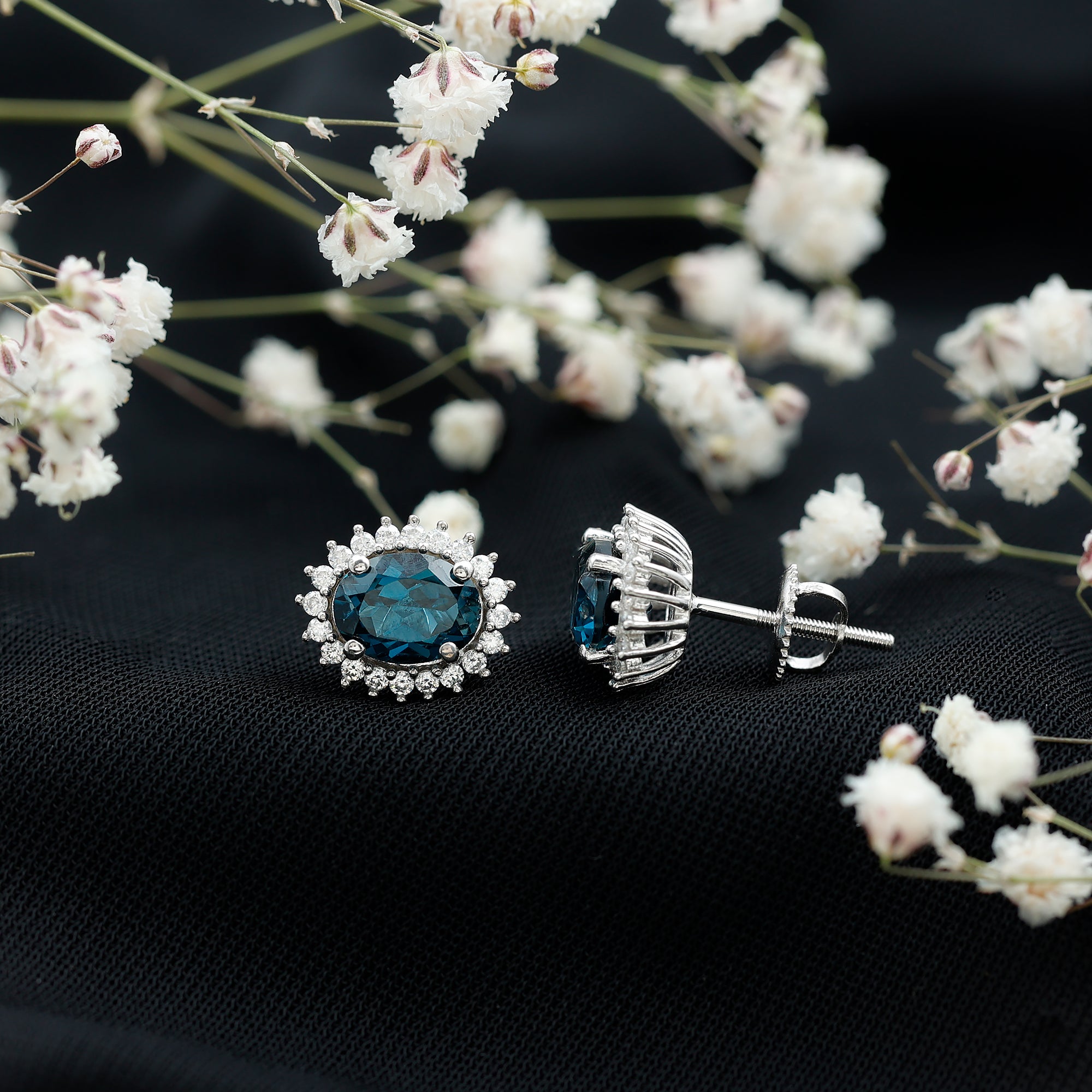 Oval Shaped London Blue Topaz Stud Earrings with Moissanite Halo