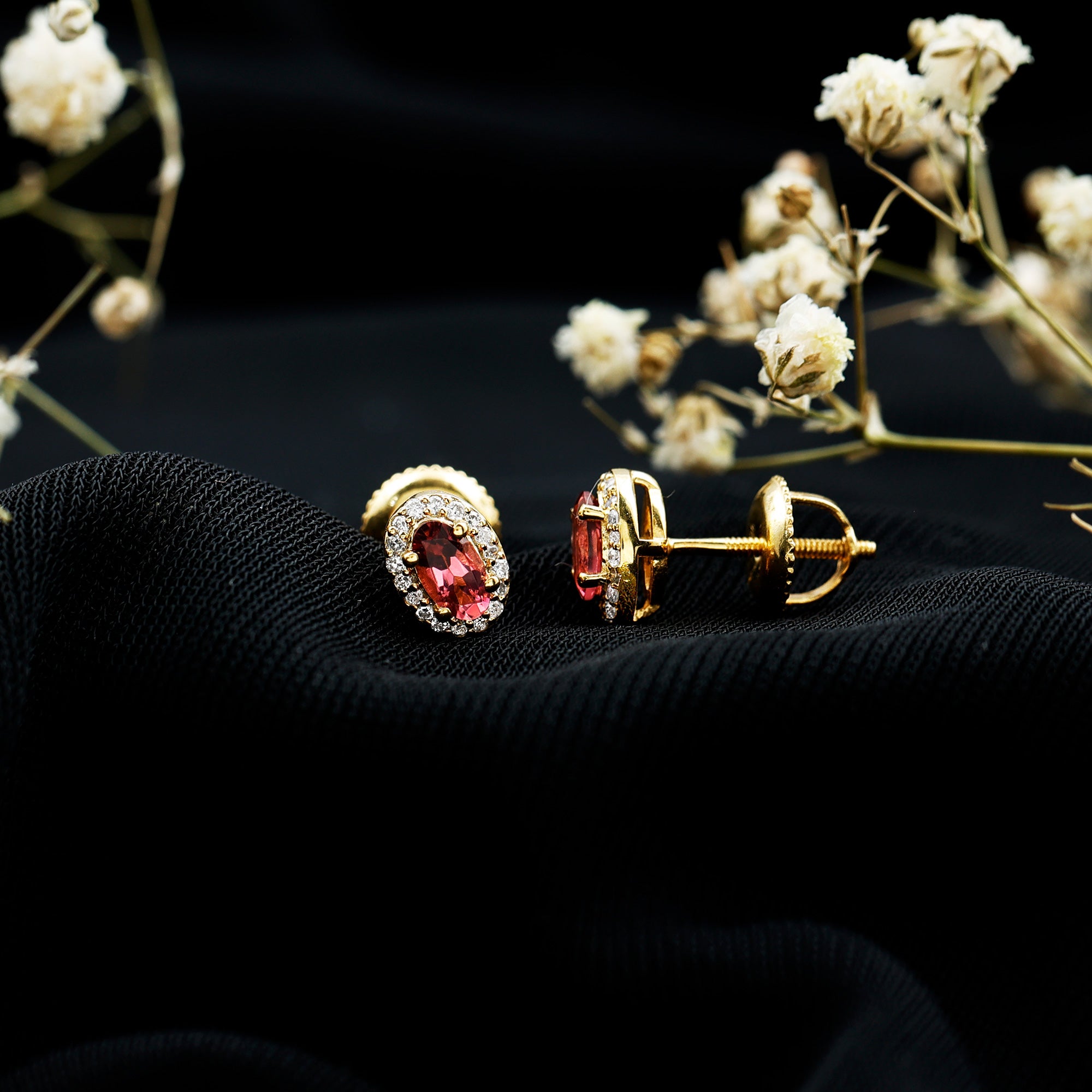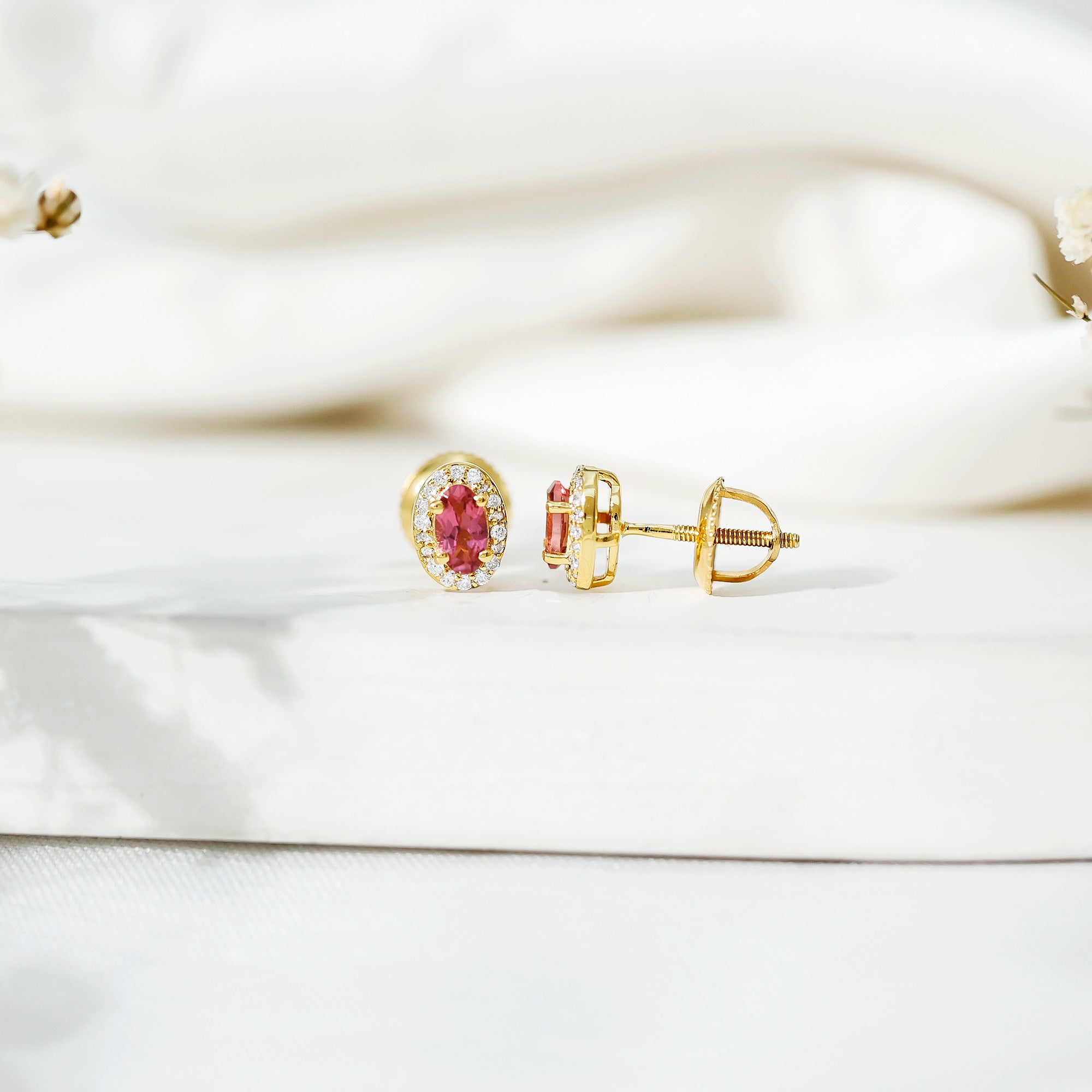 Grace your ears with a whisper of romance and radiant color with these elegant Pink Tourmaline Earrings. Designed to strike the perfect balance between modern glamour and timeless style, each earring showcases a 3X5 MM oval shaped pink tourmaline in a secure prong setting. Encircling the vibrant gemstone is a sparkling halo of round brilliant cut lab grown diamonds, expertly placed to enhance the stone’s brilliance while adding a luxurious shimmer. The contrast between the delicate blush of pink tourmaline and the sparkling white diamonds creates a refined and eye-catching design that feels both fresh and classic. Crafted in 14k yellow gold plated silver and finished with secure screw back closures, these Oval Stud Earrings are made to offer both comfort and confidence, whether worn daily or on special occasions. From romantic evenings and weddings to everyday elegance, these Pink Tourmaline and Diamond Earrings add a gentle yet captivating sparkle to any outfit. The AAA quality pink stone, paired with EF-VS quality lab grown diamonds, ensures a classic finish that is ideal for gifting, whether you are celebrating a milestone, an anniversary, or simply sharing a heartfelt moment. Delicate yet dazzling, these Halo Stud Earrings are more than accessories, they are expressions of style, sentiment, and timeless beauty.