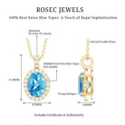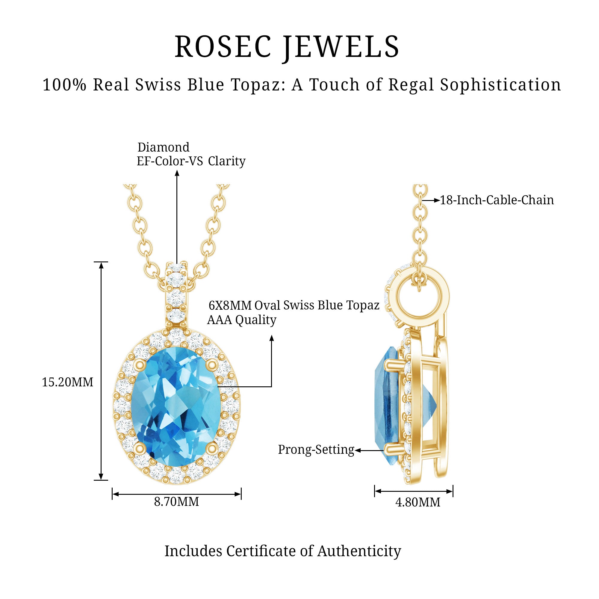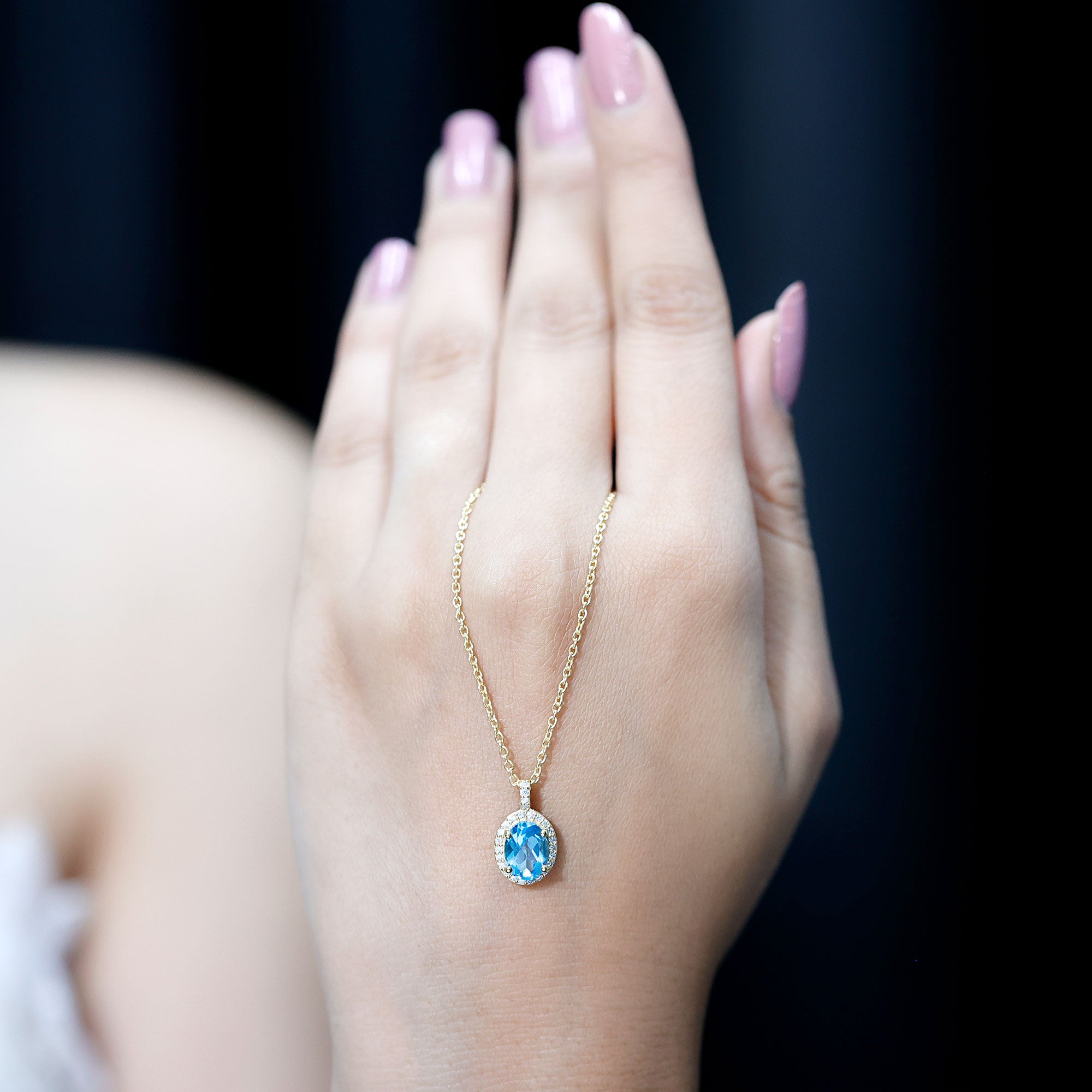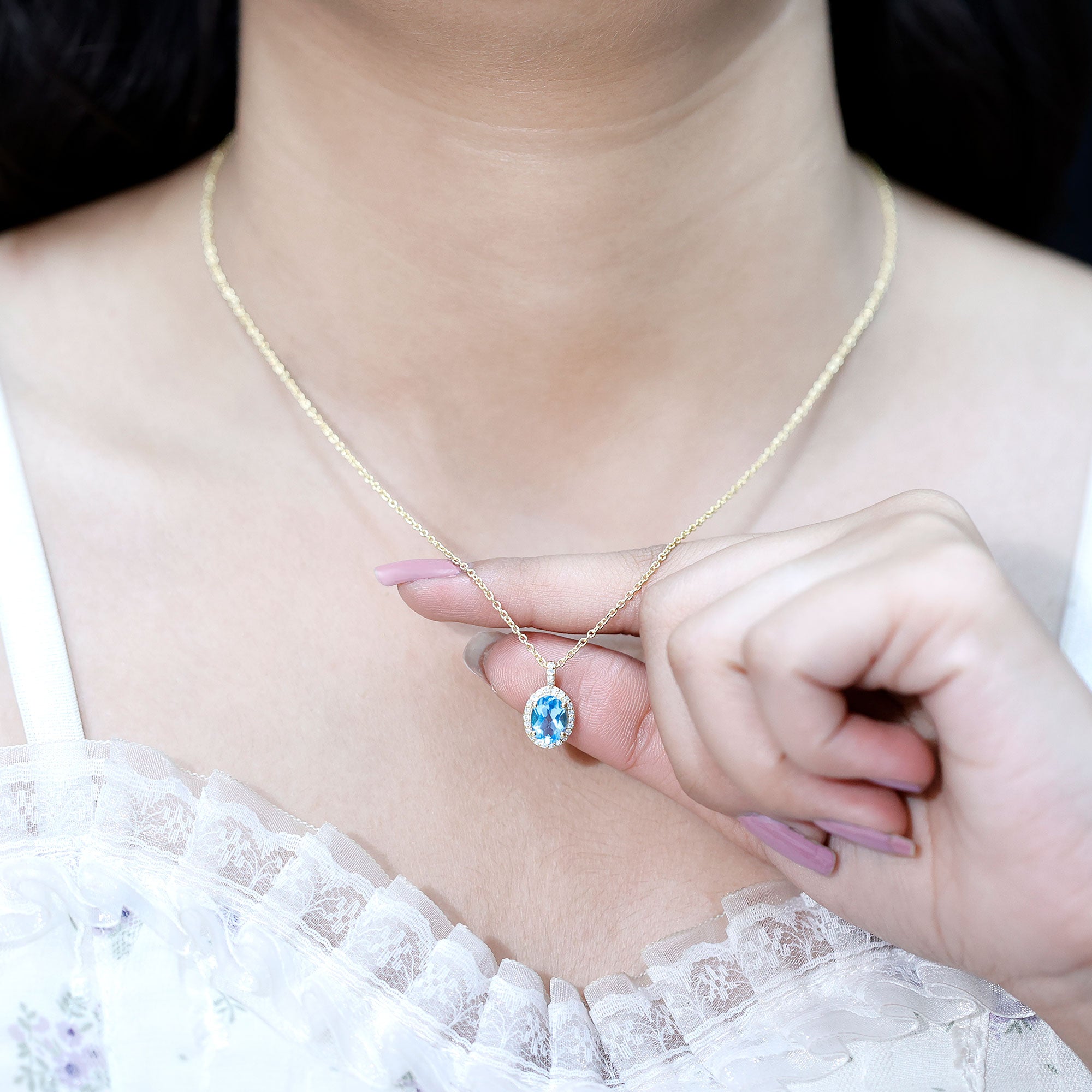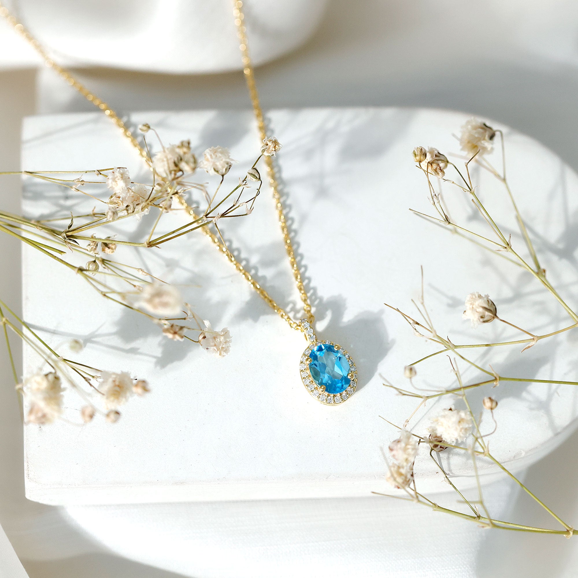 Make every moment feel special with this elegant Swiss Blue Topaz Necklace, designed to add charm and sophistication to your everyday style. Handcrafted in 14k yellow gold plated silver, this necklace features a 6X8 MM oval shaped Swiss Blue Topaz, securely set in prong setting. Surrounding the center stone is a delicate halo of round lab grown diamonds, giving the Oval Pendant just the right touch of brilliance without overpowering its design. The halo catches light from all angles, adding a gentle sparkle that is perfect for both casual and formal looks. What makes this Halo Pendant Necklace even more special is the decorative bail, which is also adorned with shimmering lab created diamonds, a thoughtful detail that adds extra shine and ties the whole piece together seamlessly. The Blue Stone Necklace hangs from a sleek, polished chain that sits comfortably on the neckline and fastens securely, making it easy to wear all day. Its soft curves make it a perfect accessory for everything from office meetings to evening dinners. This Swiss Blue Topaz and Diamond Necklace is an ideal gift for birthdays, anniversaries, or simply a way to treat yourself. It is stylish, sophisticated, and made to be cherished for years to come.