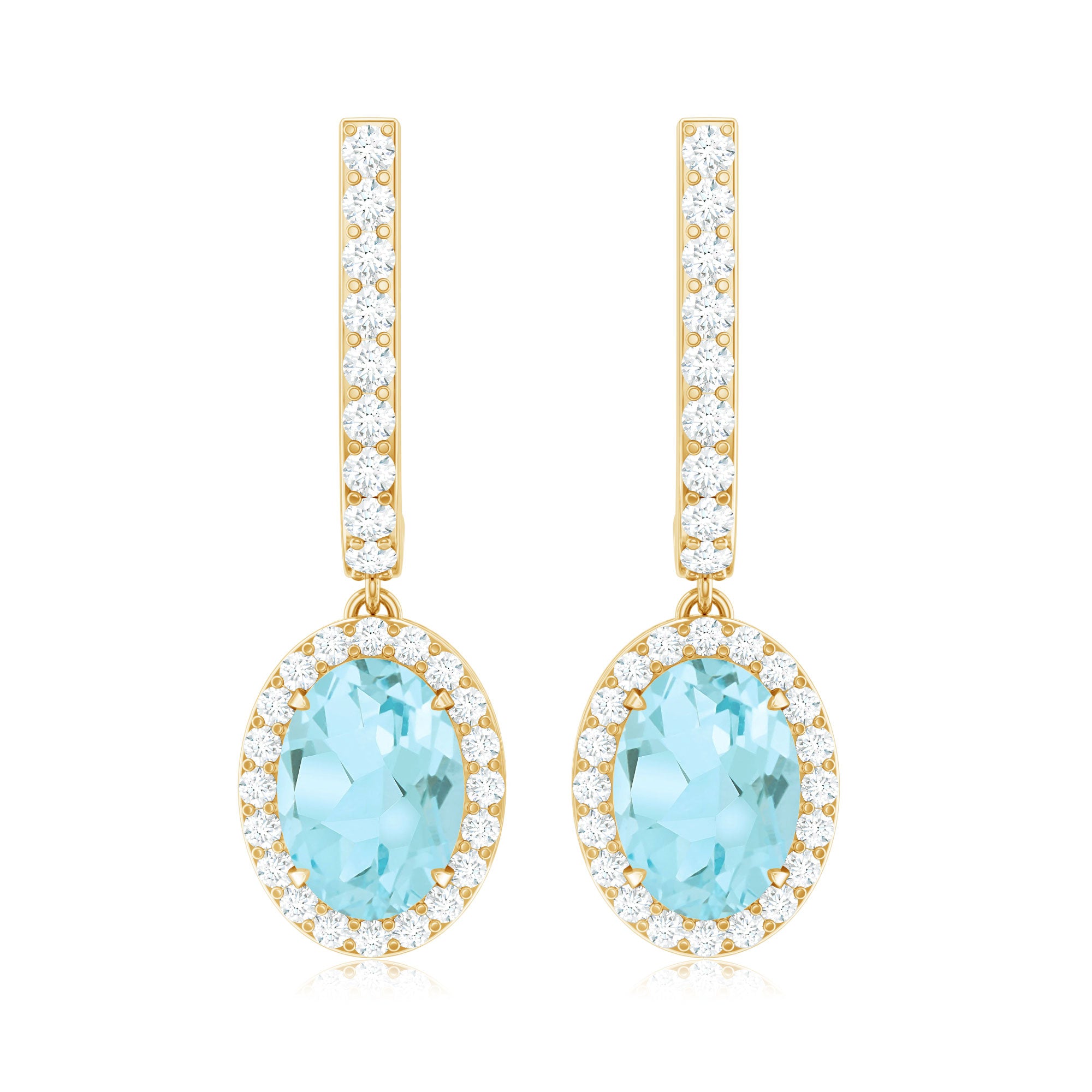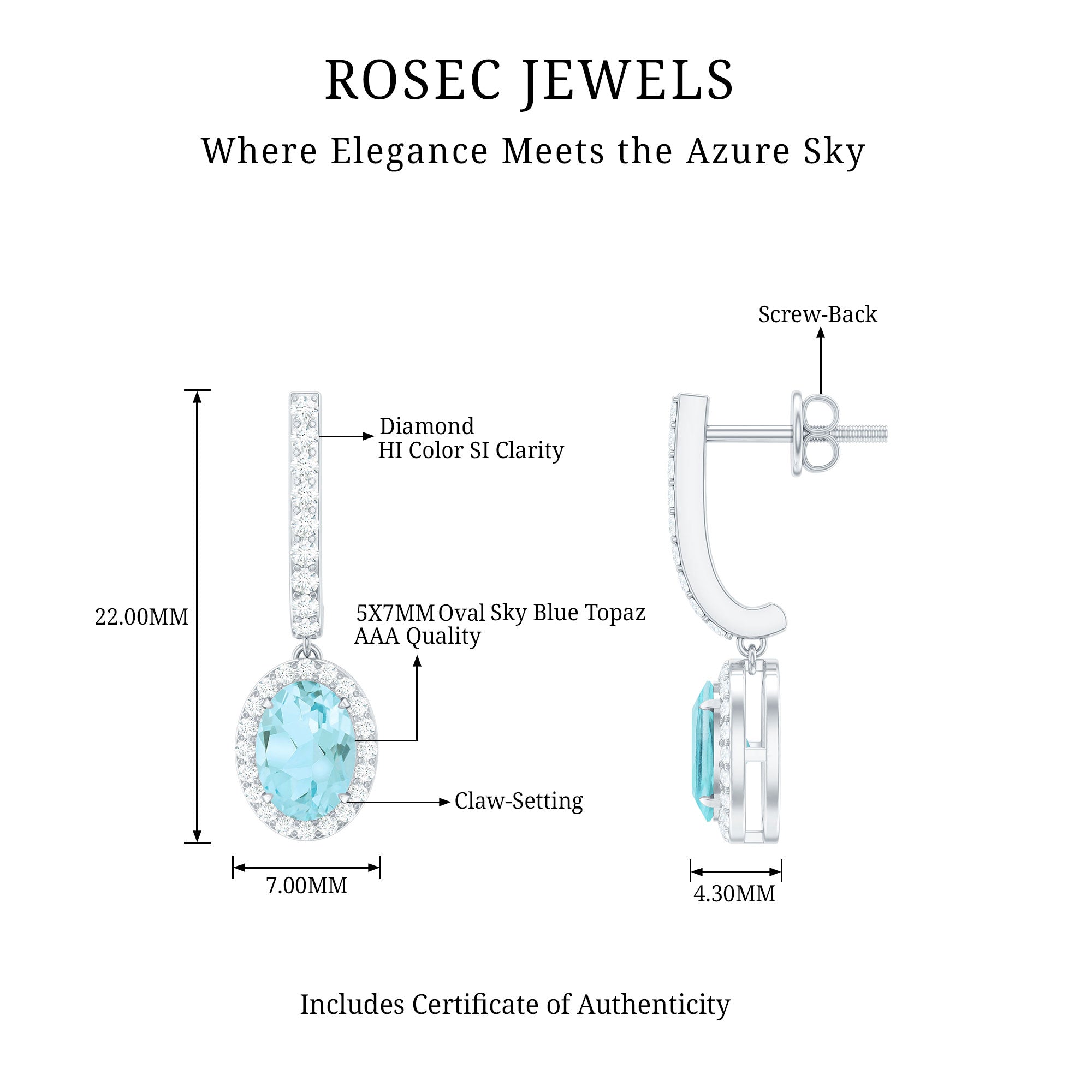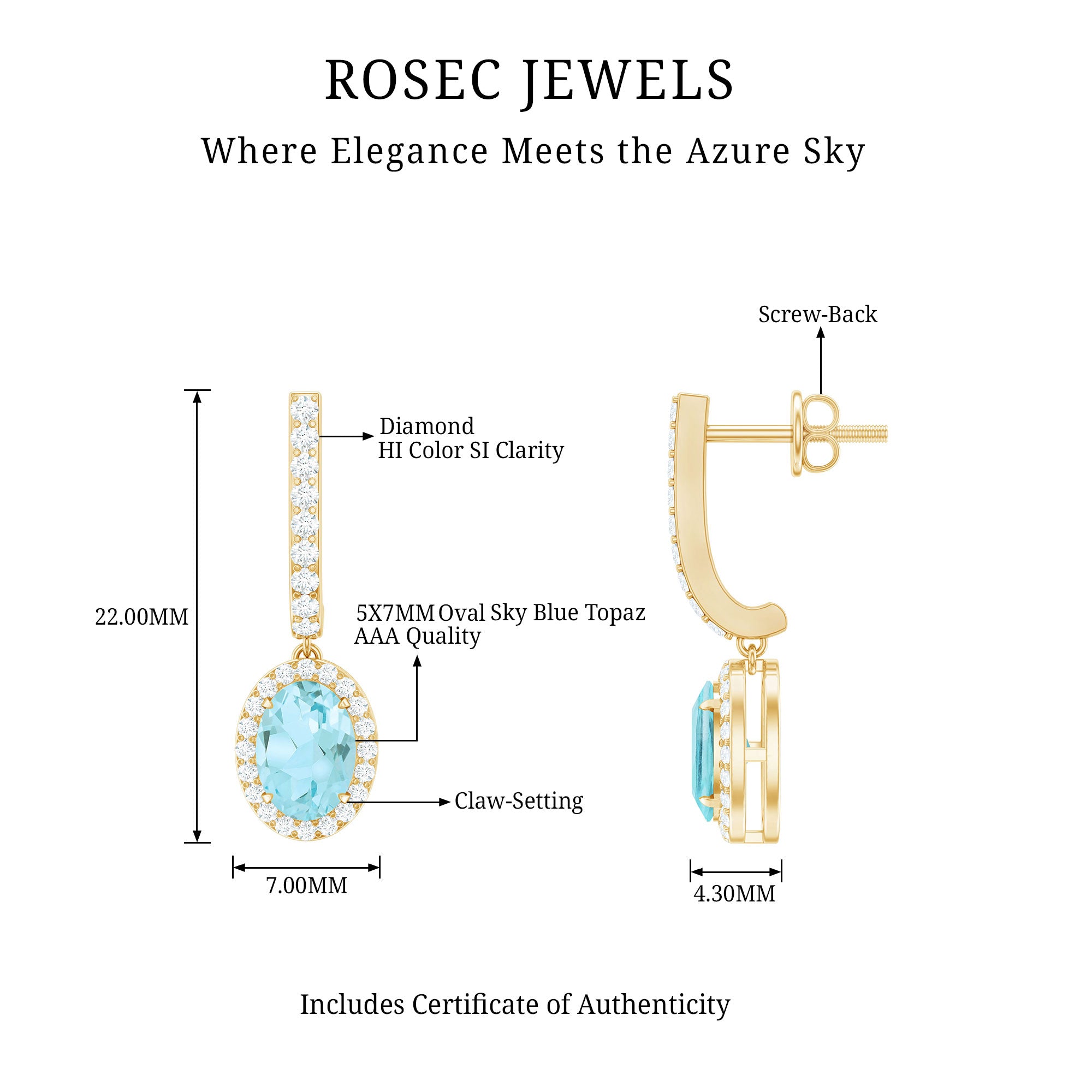 Honor your mother this Mothers Day with these gorgeous Drop Hoop Earrings. The earrings feature an oval-cut sky blue topaz in a claw setting surrounded by a halo of Diamonds. Crafted with solid gold, these earrings offer durability and a luxurious appeal. Celebrate your mother with this stunning and beautiful jewelry piece from Rosec Jewels. The earrings are sure to become a cherished part of your mothers jewelry collection.