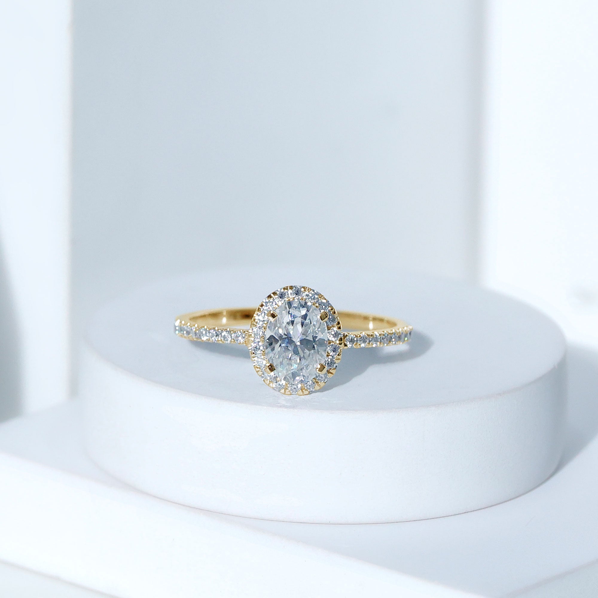 Become a style icon with the exquisite Halo Engagement Ring, sure to win hearts. Adorned with an Oval Cut Zircon at its center, the ring is graced by a dazzling cubic zirconia halo that extends to decorate the shank. This CZ Ring offers the perfect symbol for your affection, making it an ideal choice for an Engagement Ring to propose to your beloved.