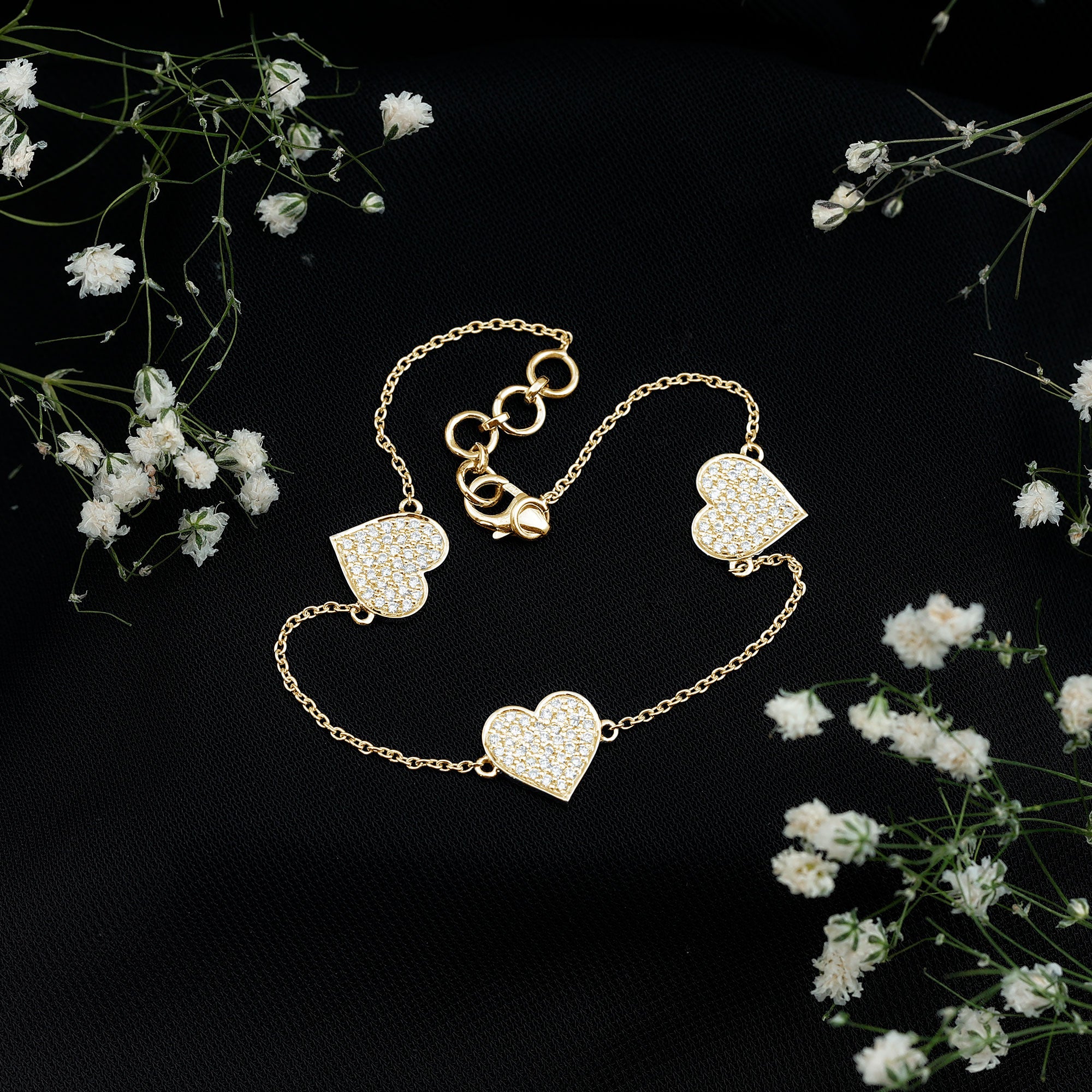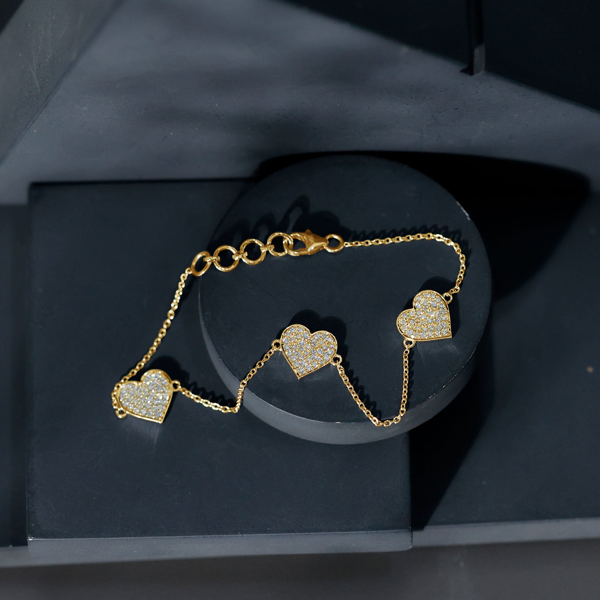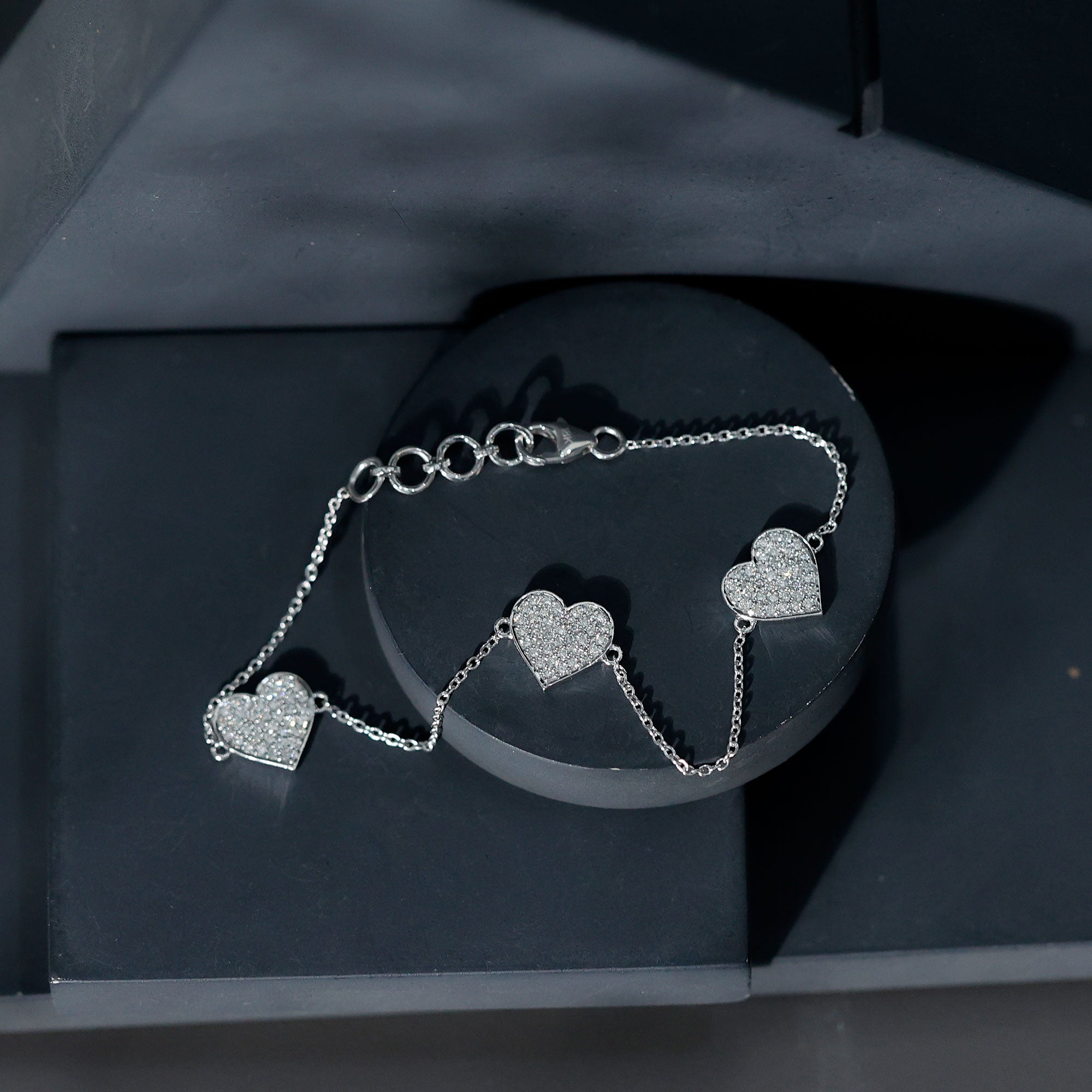 Adorn your wrist with a blend of sparkle and elegance, infused with a hint of romance, through this Diamond Heart Shaped Bracelet. It showcases three hearts embellished with dazzling round cut lab-grown diamonds set in pave setting, with radiating exceptional brilliance. These sparkling EF-VS quality lab-grown diamond hearts are carefully spaced along a delicate chain, allowing each heart to shine on its own. This Diamond Station Bracelet strikes a perfect balance between minimalism and romantic charm, adding a subtle yet enchanting sparkle to your daily attire. You can wear it alone for an effortlessly stylish appearance or layer it with other favorites, this Heart Chain Bracelet is truly a must-have. Additionally, it serves as a lovely gift for your special someone, perfect for commemorating milestones, birthdays, or simply celebrating the beautiful moments in life.