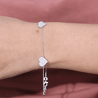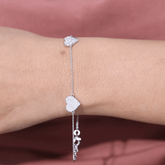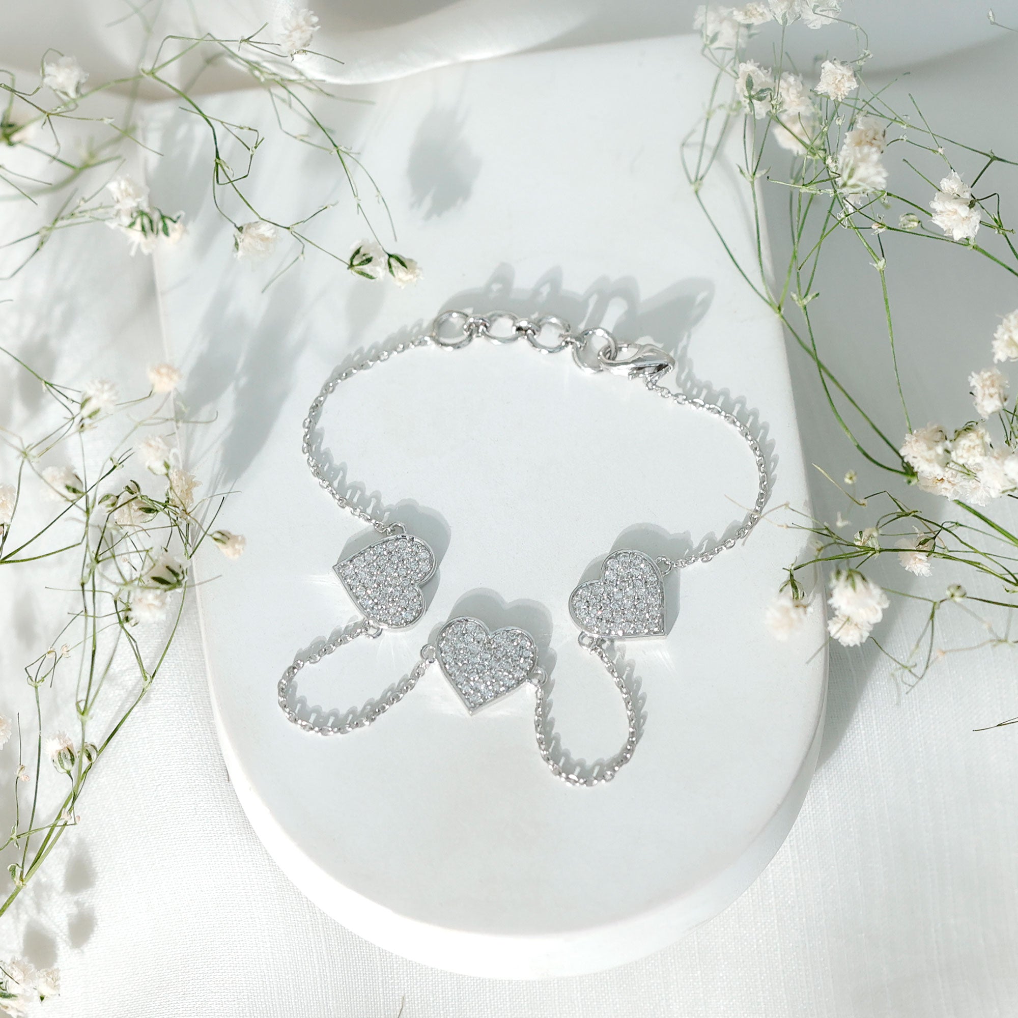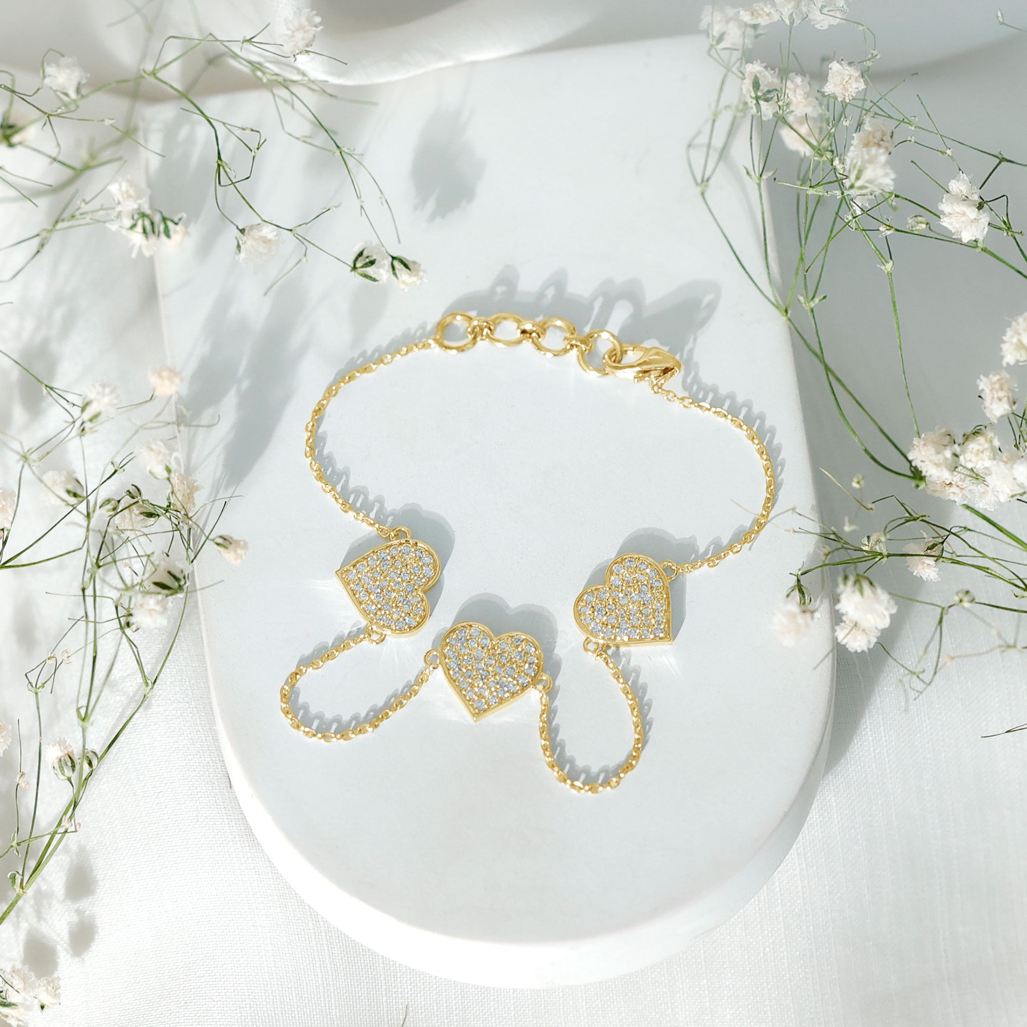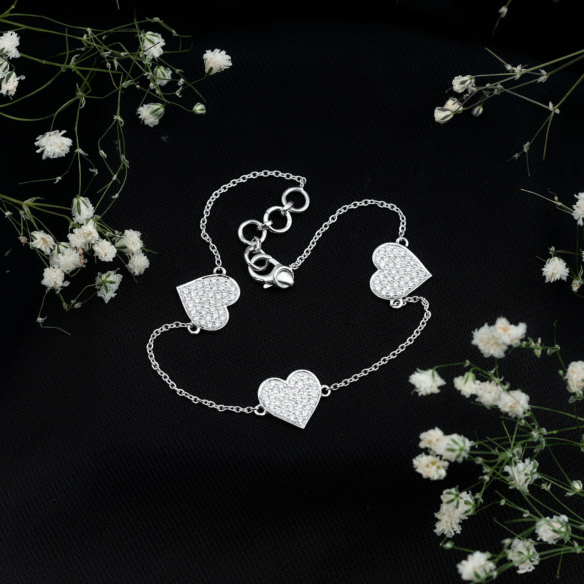 Adorn your wrist with a blend of sparkle and elegance, infused with a hint of romance, through this Diamond Heart Shaped Bracelet. It showcases three hearts embellished with dazzling round cut lab-grown diamonds set in pave setting, with radiating exceptional brilliance. These sparkling EF-VS quality lab-grown diamond hearts are carefully spaced along a delicate chain, allowing each heart to shine on its own. This Diamond Station Bracelet strikes a perfect balance between minimalism and romantic charm, adding a subtle yet enchanting sparkle to your daily attire. You can wear it alone for an effortlessly stylish appearance or layer it with other favorites, this Heart Chain Bracelet is truly a must-have. Additionally, it serves as a lovely gift for your special someone, perfect for commemorating milestones, birthdays, or simply celebrating the beautiful moments in life.