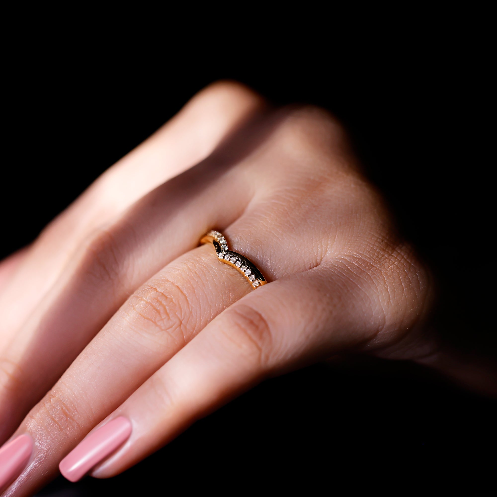 Make her surprise with this Diamond Ring Guard, to beautify her fingers. The ring features Round Shape Diamonds decorated on the band in Pave Setting. This Chevron Ring can be styled in both ways either solely to achieve a minimal look or with the engagement ring to achieve a statement look. This Engagement Ring Enhancer adds a touch of elegance and glamour which elevates the style quotient. This Nesting Band Ring is precisely crafted for your special one. Get her this ring and witness a priceless moment that will be cherished forever.