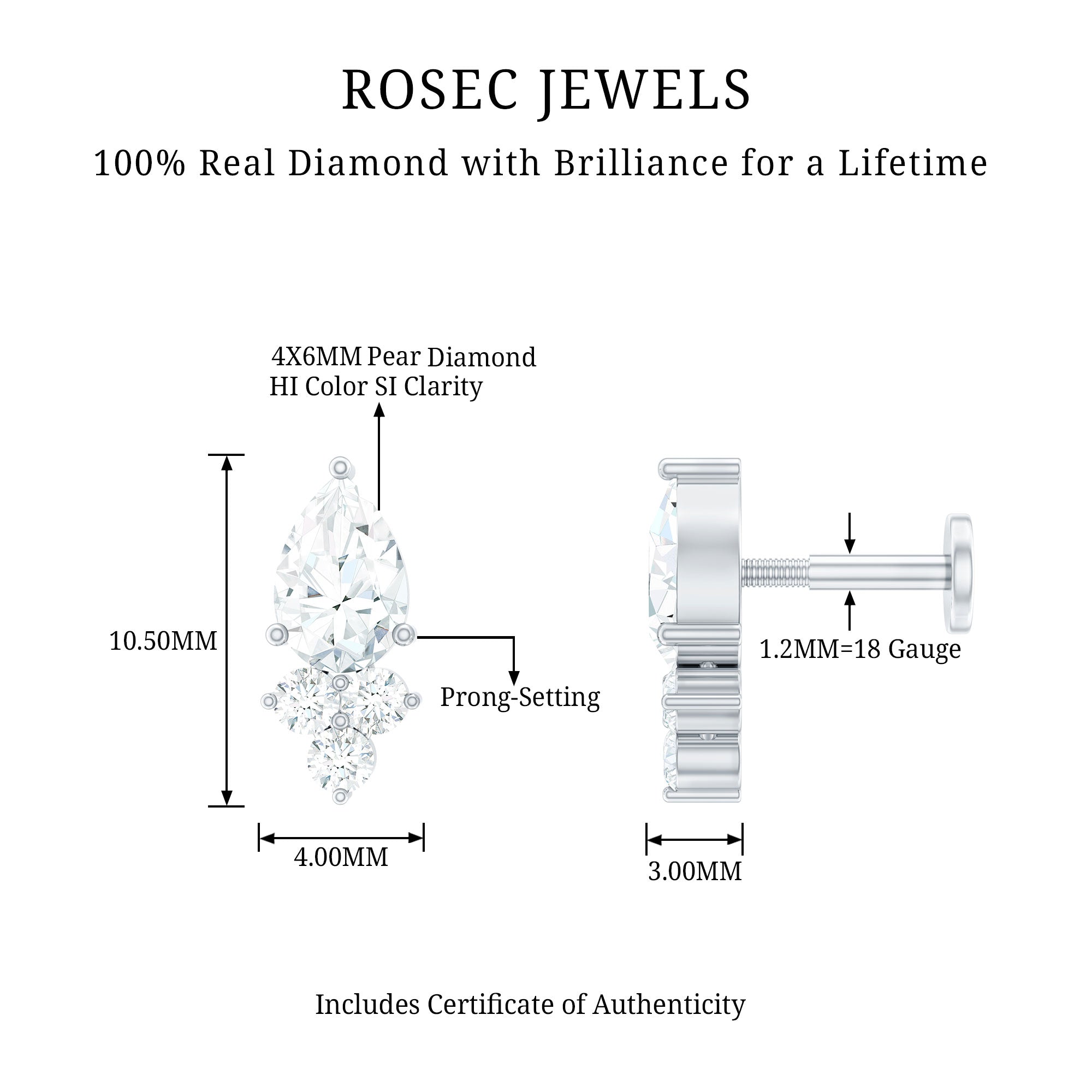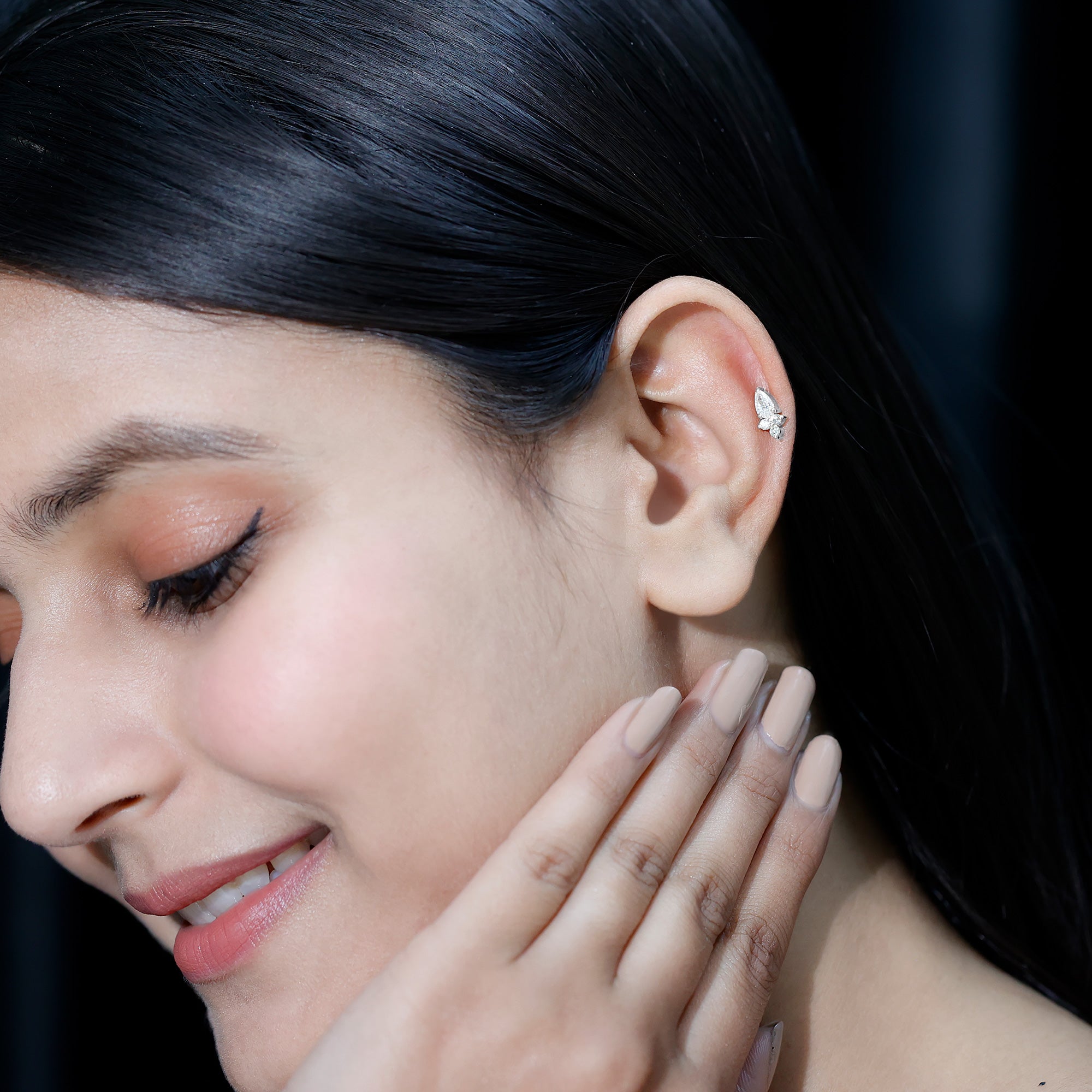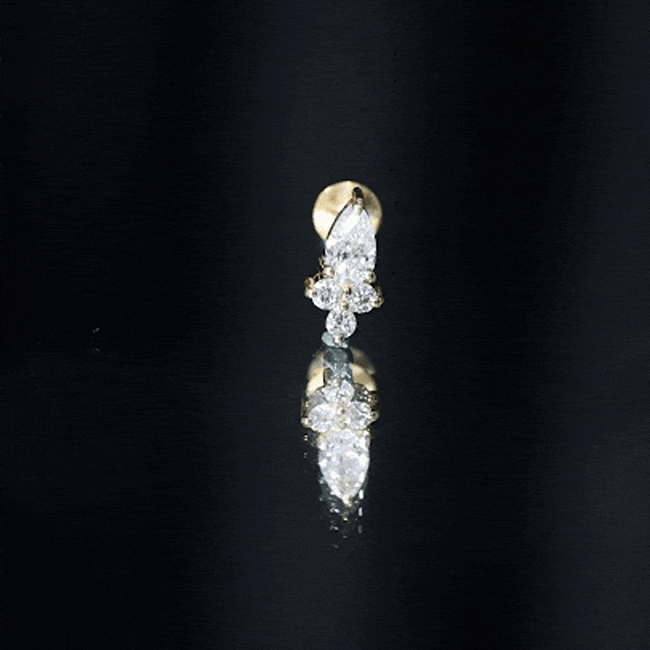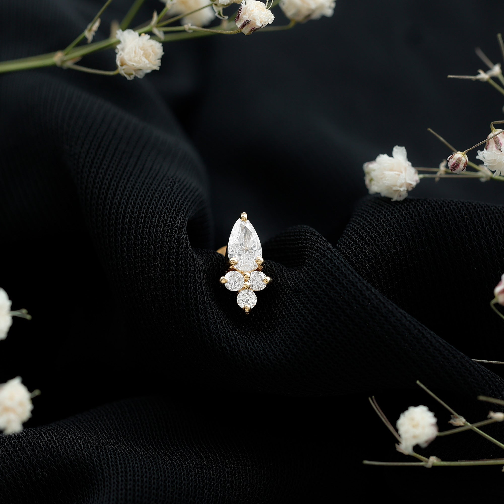 You will surely fall in love with the sparkle of this elegant Diamond Helix Earring, curated to bring style to multiple piercings. The earring features a pear shaped diamond at the top, beautifully complemented by a trio of round diamonds below. Each stone is carefully set in secure prong setting, ensuring that it catches the light from every angle while maintaining durability and safety for everyday wear. The Pear Shape Diamond Earring is designed with a flat back style, providing comfort and preventing any poking or irritation while sleeping, making it ideal for day and night wear. Its thoughtful design allows you to style it on various piercings, including the helix, cartilage, tragus, conch, or upper lobe, offering versatility and the opportunity to create a layered, fashionable ear stack. Crafted for durability and ease of wear, this Diamond Piercing Earring is suitable for an active lifestyle. It can be worn confidently during workouts, travel, or any daily activity without compromising comfort or style. The combination of the pear-shaped and round diamonds adds a delicate yet noticeable sparkle, making it a perfect accessory for both casual and formal occasions. This piece comes presented in a jewelry box, making it an excellent gift option for yourself or a loved one.