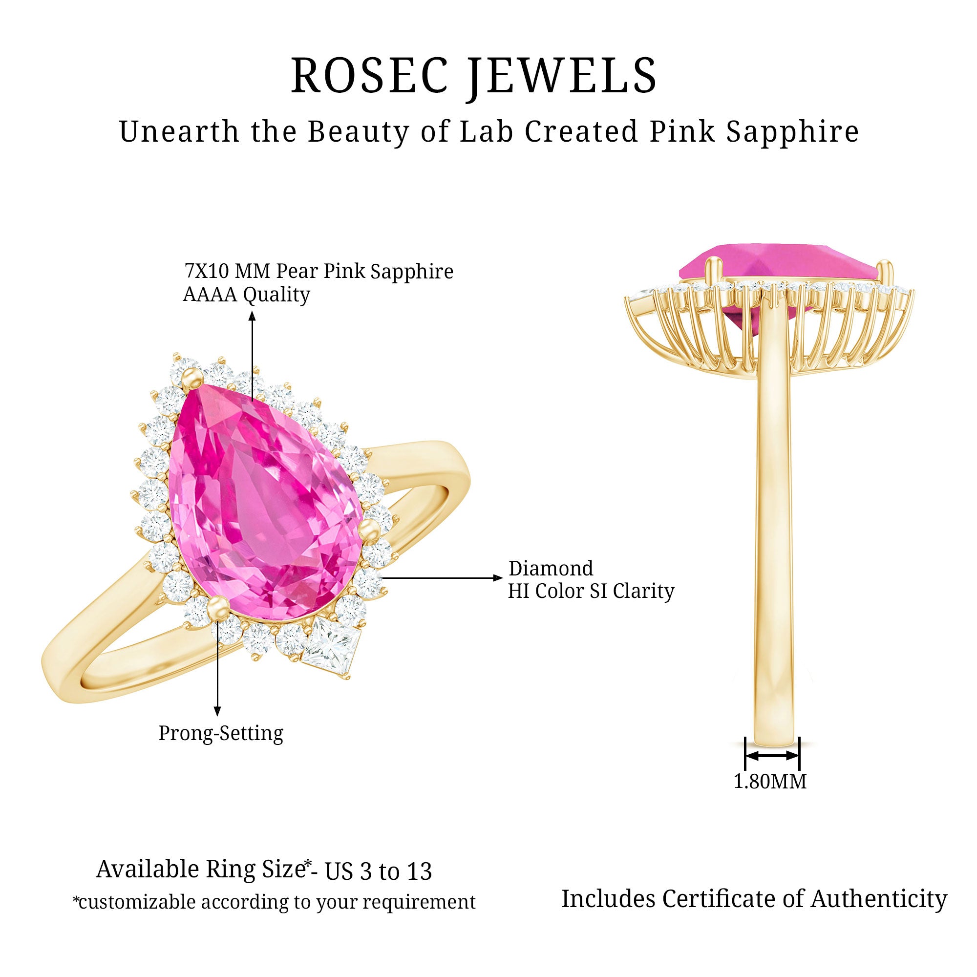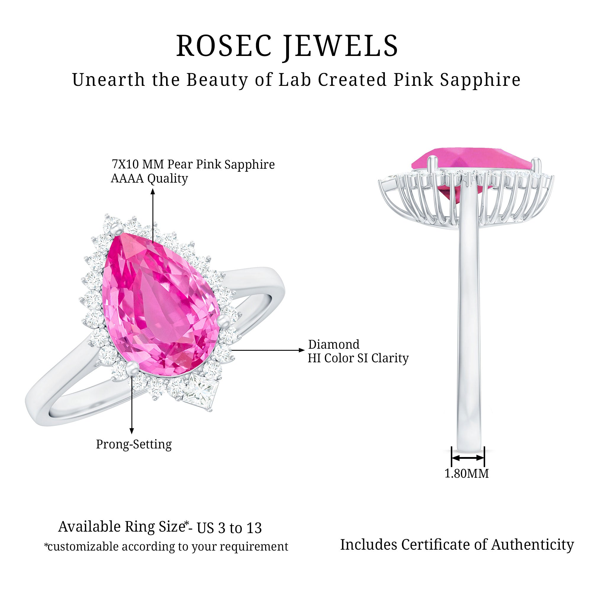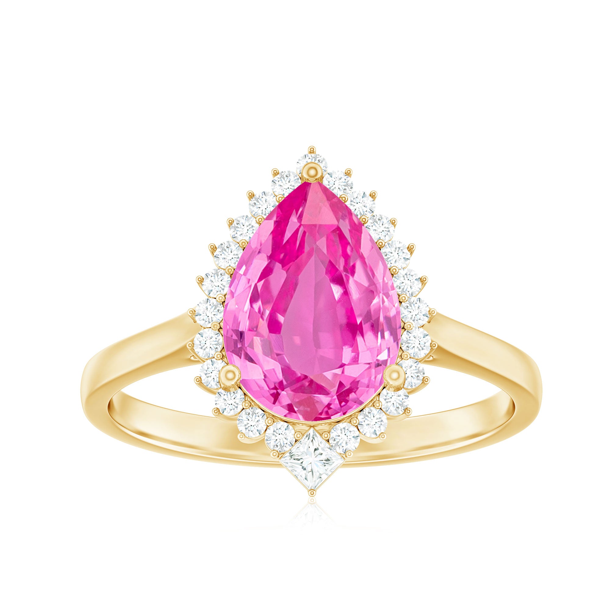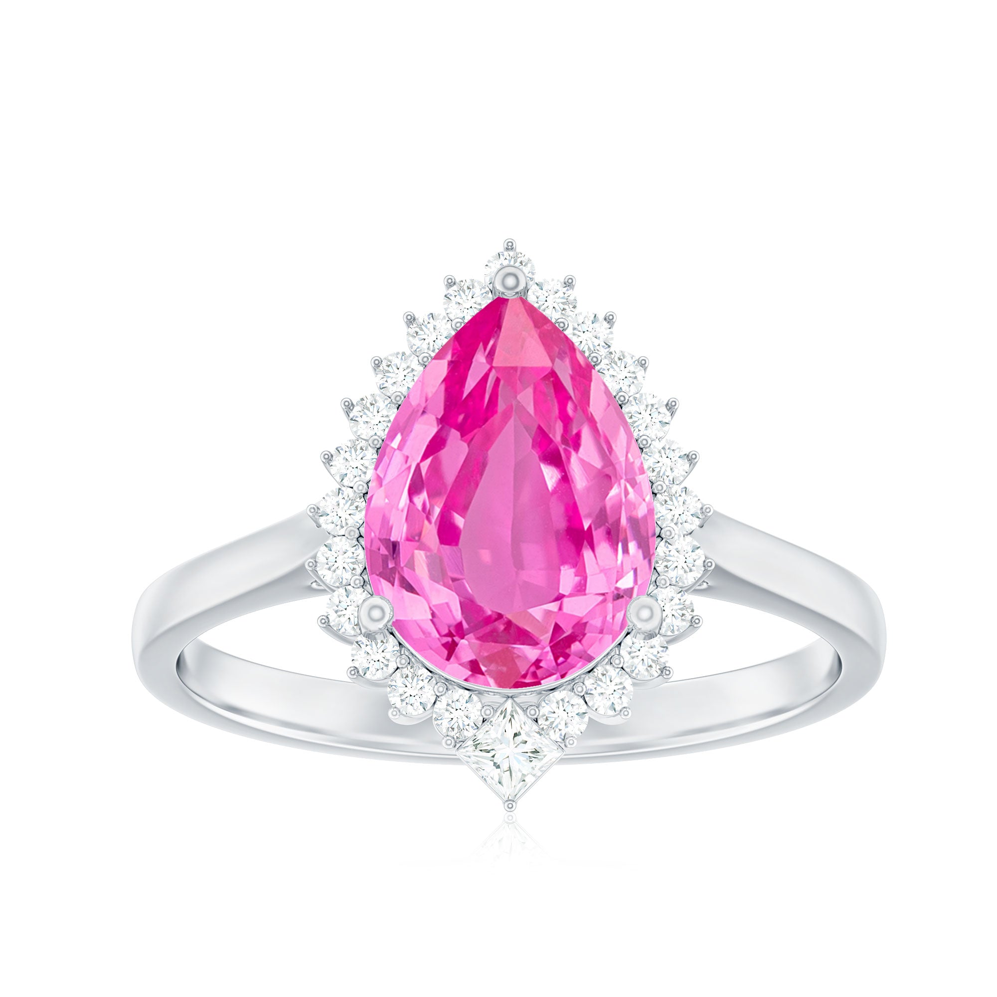 Convey emotions eloquently with the Halo Engagement Ring. Its Pear Cut Lab-Created Pink Sapphire and Diamond Halo exude a glistening allure, making it an excellent choice for cocktail and engagement jewelry, symbolizing love and celebration.