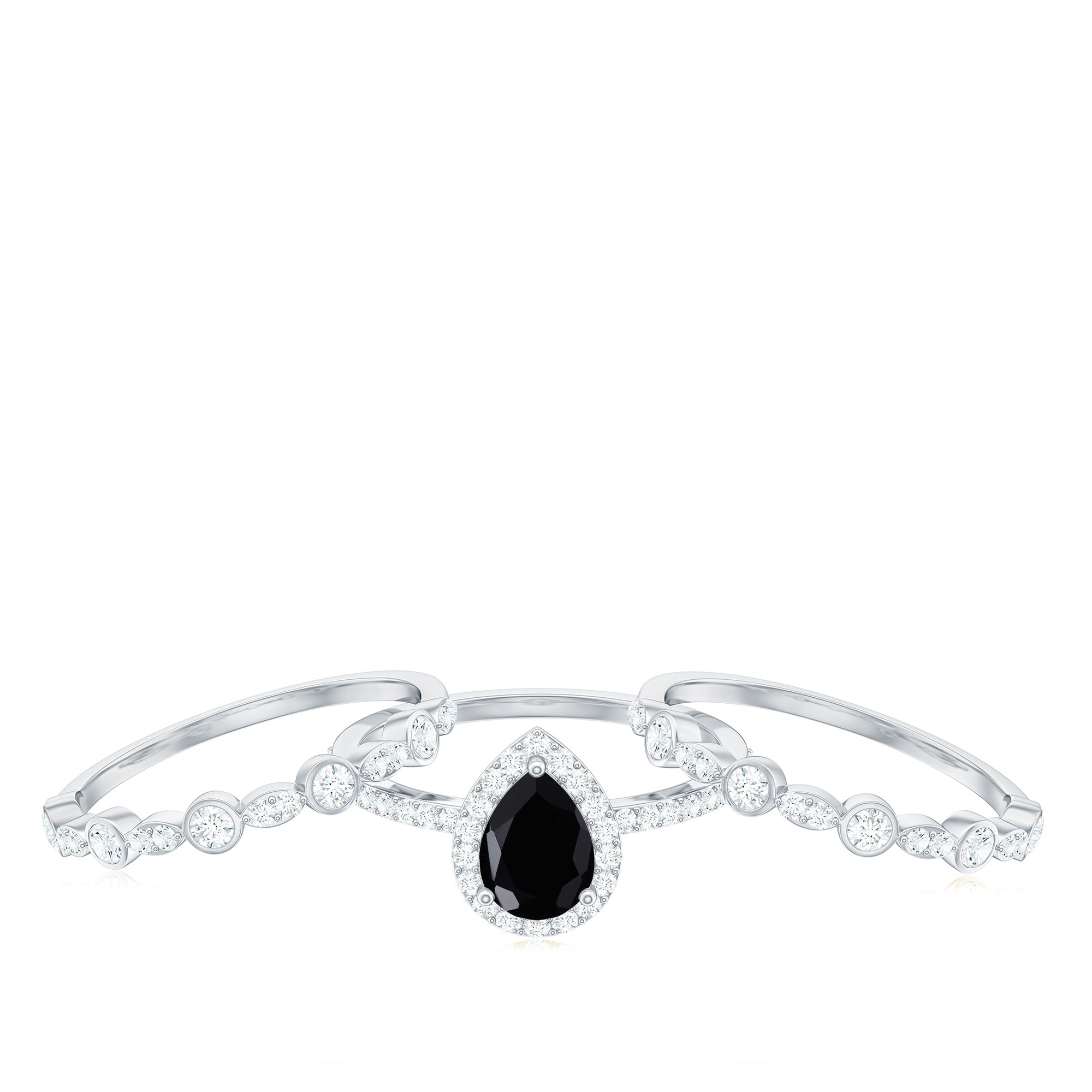 Your bride deserves a ring that shines as brightly as her smile, and this Moissanite Engagement Ring Set is designed to commemorate that unforgettable occasion. Crafted with elegance and brilliance in mind, this 3 Piece Bridal Set serves as a stunning representation of everlasting love. At the core of the set is a brilliant 6X8 MM pear-shaped black onyx, meticulously cut and set in a prong setting, surrounded with tiny round shape moissanites set as halo and more as side stones. This AAA quality black onyx is known for its grounding properties, helping to center the mind, improve focus, and bring clarity amidst chaos. Its brilliance is beautifully accentuated by two coordinating ring guards, each embellished with round cut moissanite stones that gracefully frame the center ring on either side. The outcome is a glamorous Trio Wedding Ring Set that exudes elegance from every perspective. Constructed from premium materials and designed for durability, this Solitaire Wedding Set strikes the perfect balance between contemporary design and timeless beauty. Whether worn as a complete set for a striking wedding day appearance or styled individually for everyday sophistication, these rings seamlessly adapt to your lifestyle while continually reminding you of your love story. Ideal for the bride who appreciates style, sparkle, and ethical beauty, moissanite presents a thoughtful alternative to traditional gemstones, offering remarkable brilliance while being conflict-free and environmentally friendly. This Engagement Ring with Wedding Band Set is presented in a luxurious jewelry box, accompanied by a Gemstone Authenticity Certificate, ensuring peace of mind and a premium unboxing experience.