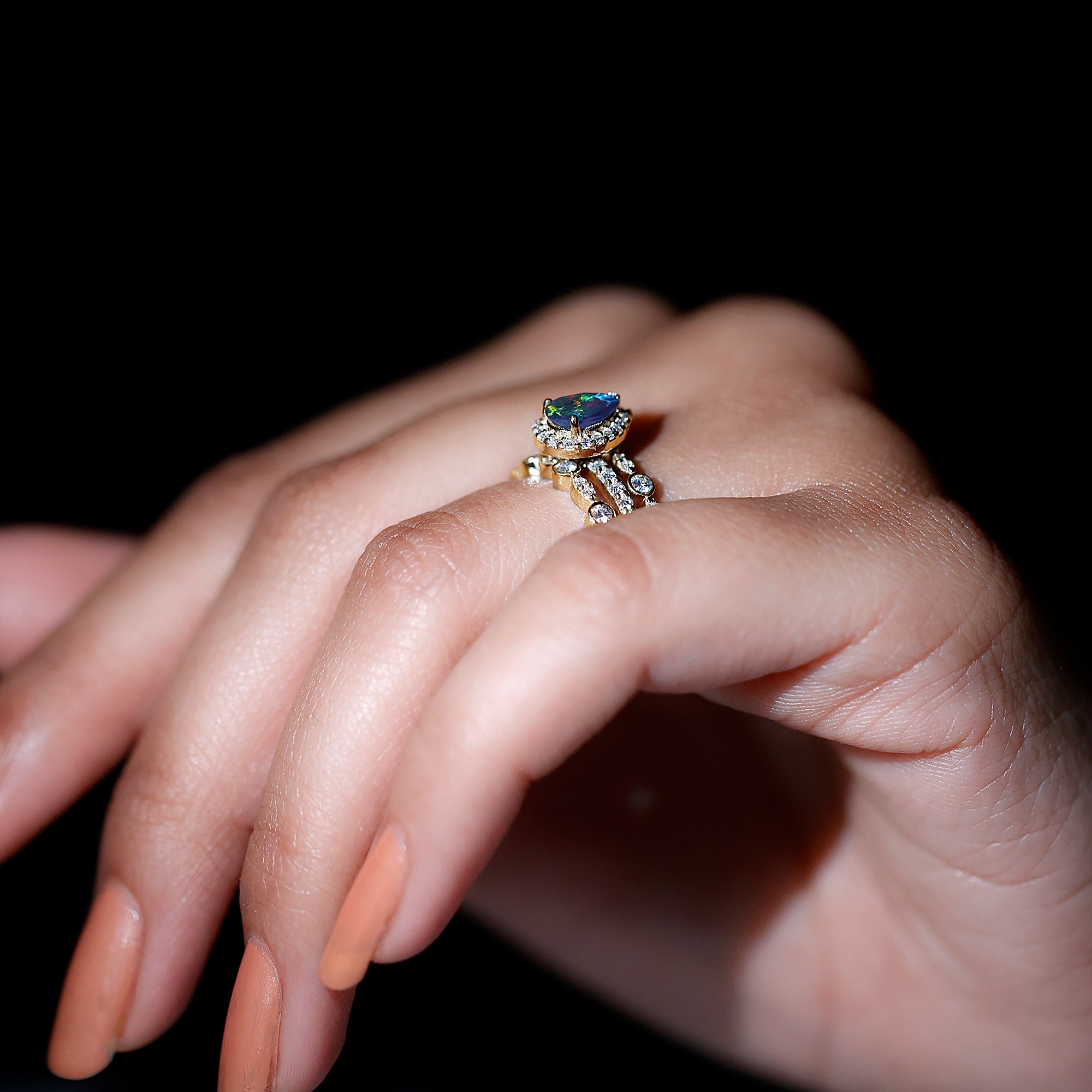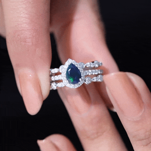 Big ring for your big days, adorn your hand with this Bridal Ring Set of 3. The engagement rings centerpiece showcases a dazzling pear-cut Black Opal. The matching wedding bands, adorned with shimmering Moissanite stones, add a touch of sparkle and elegance to the set.
