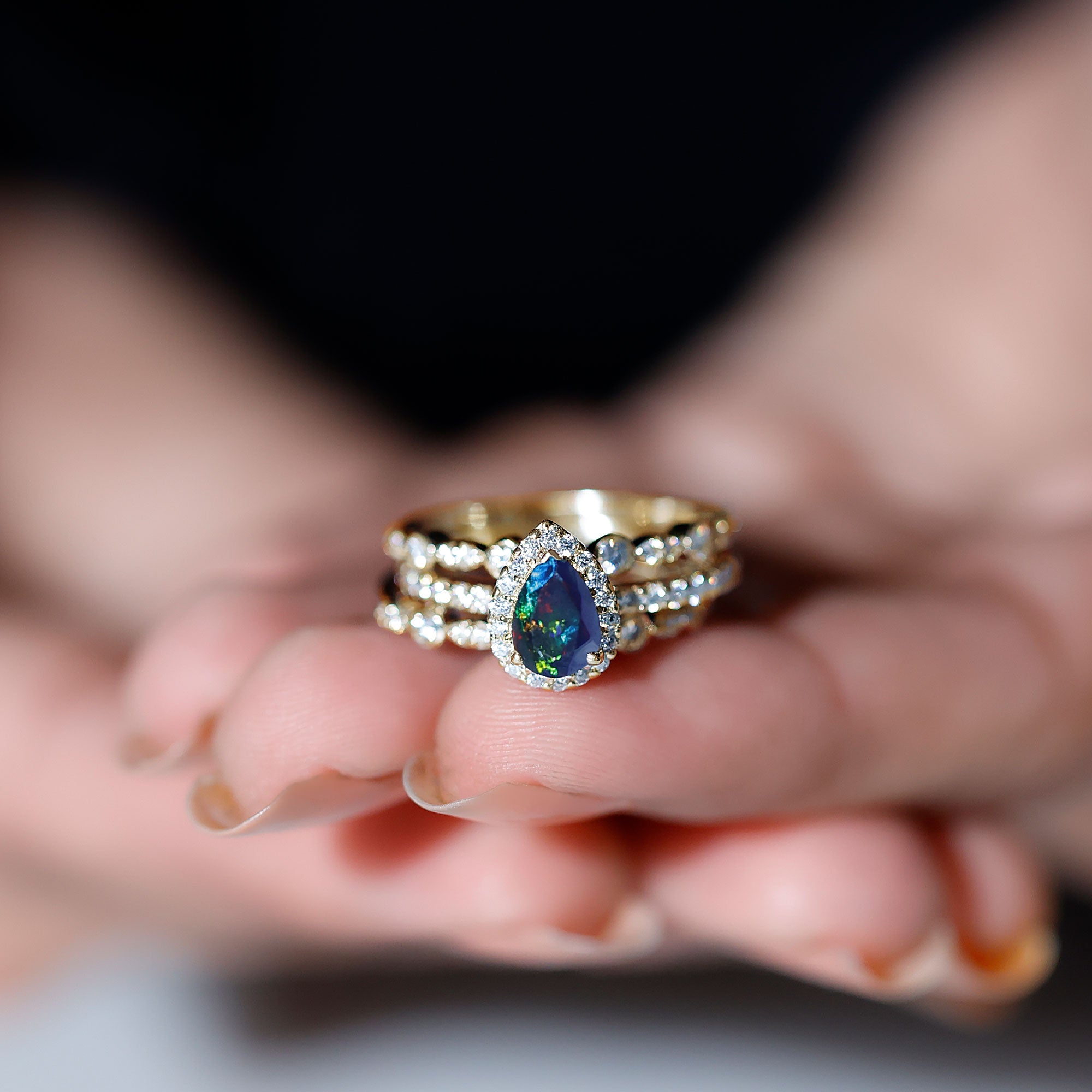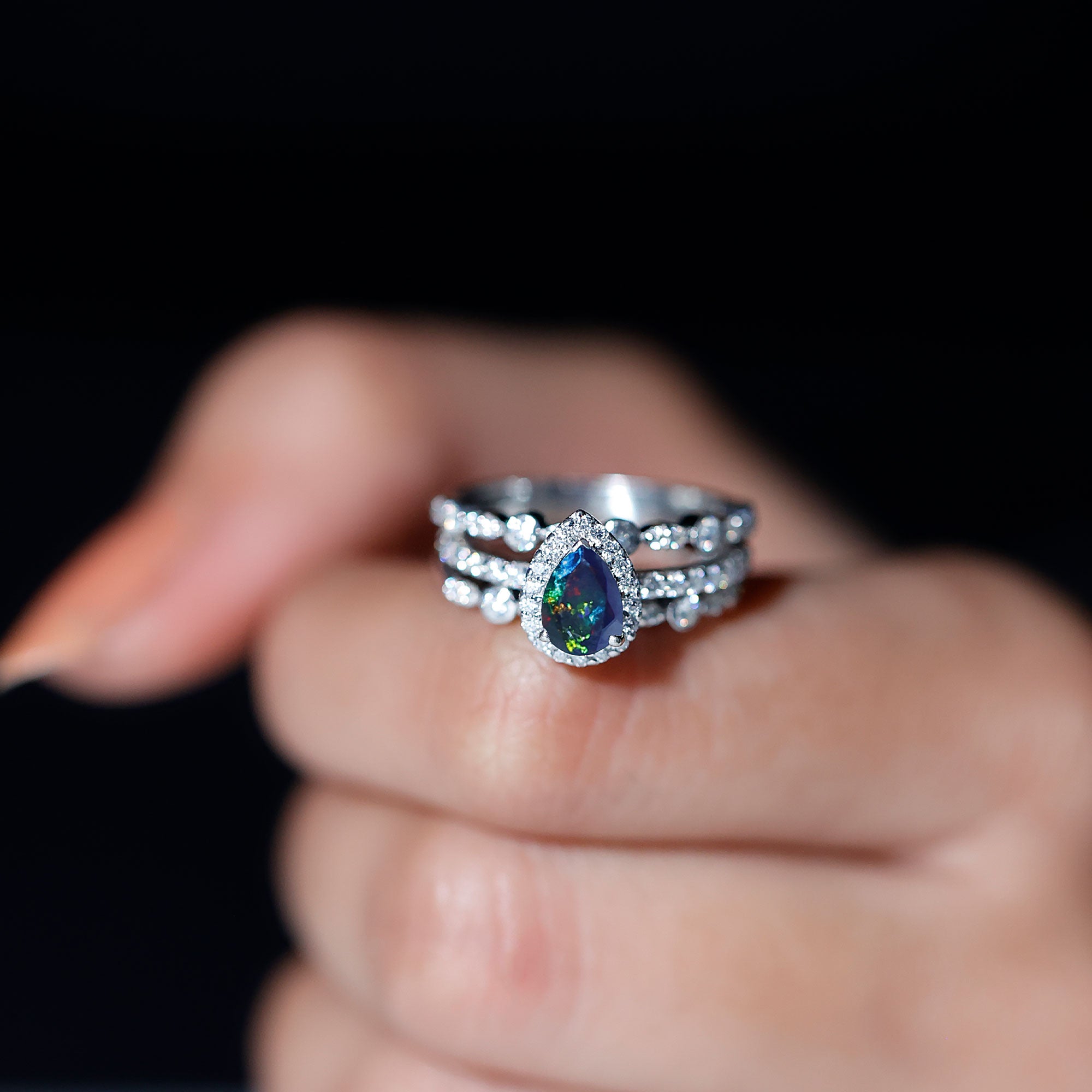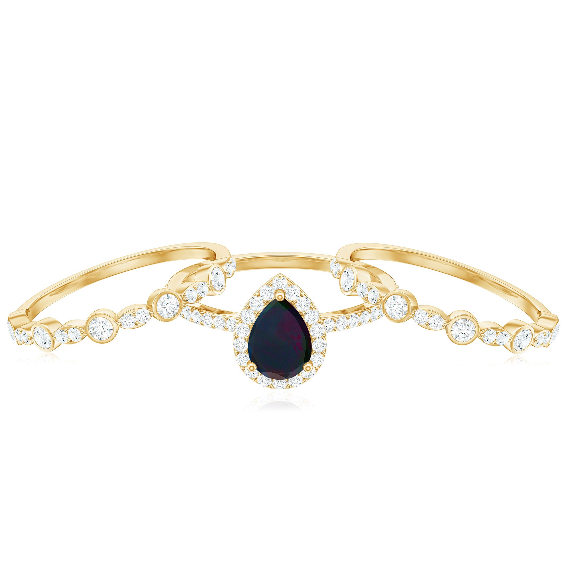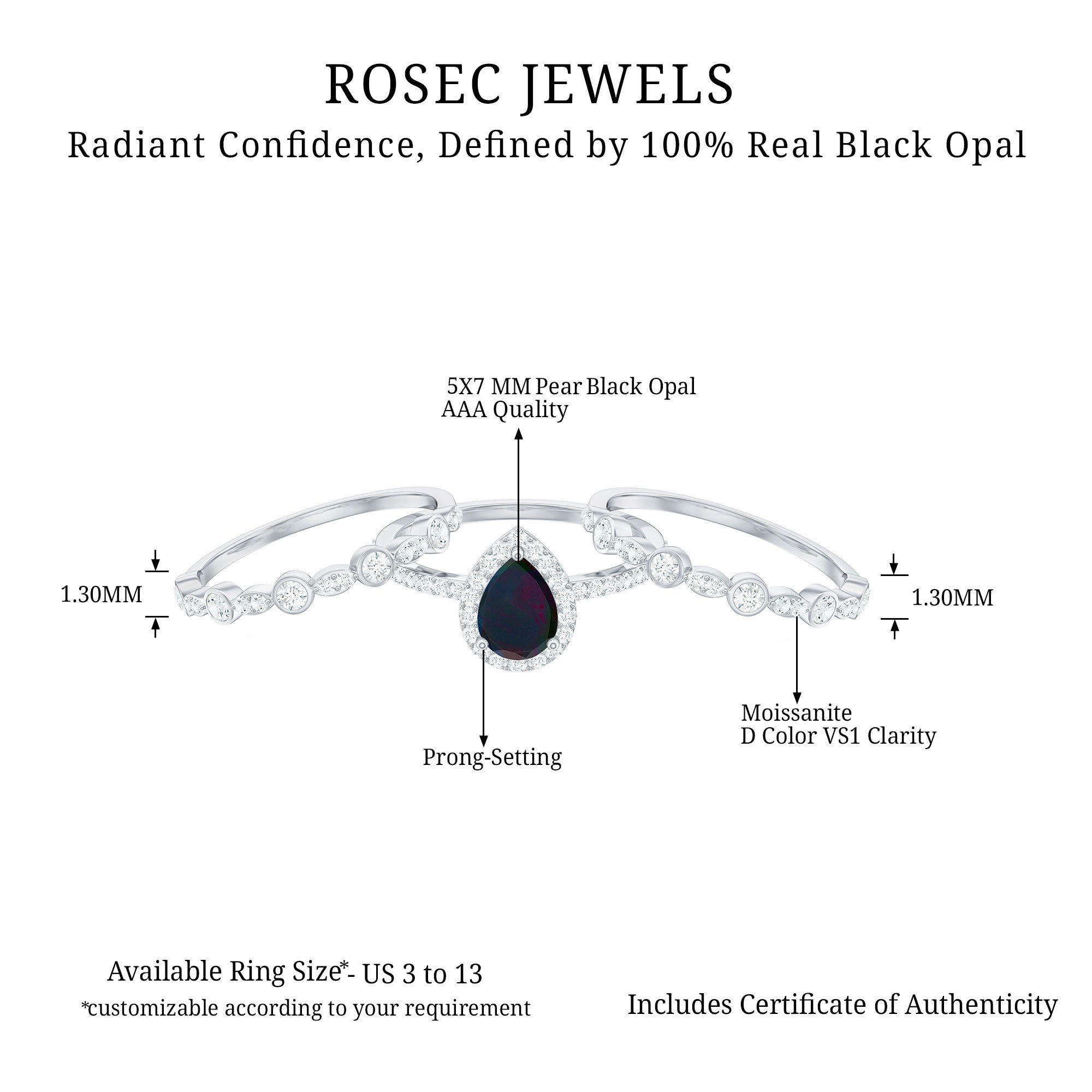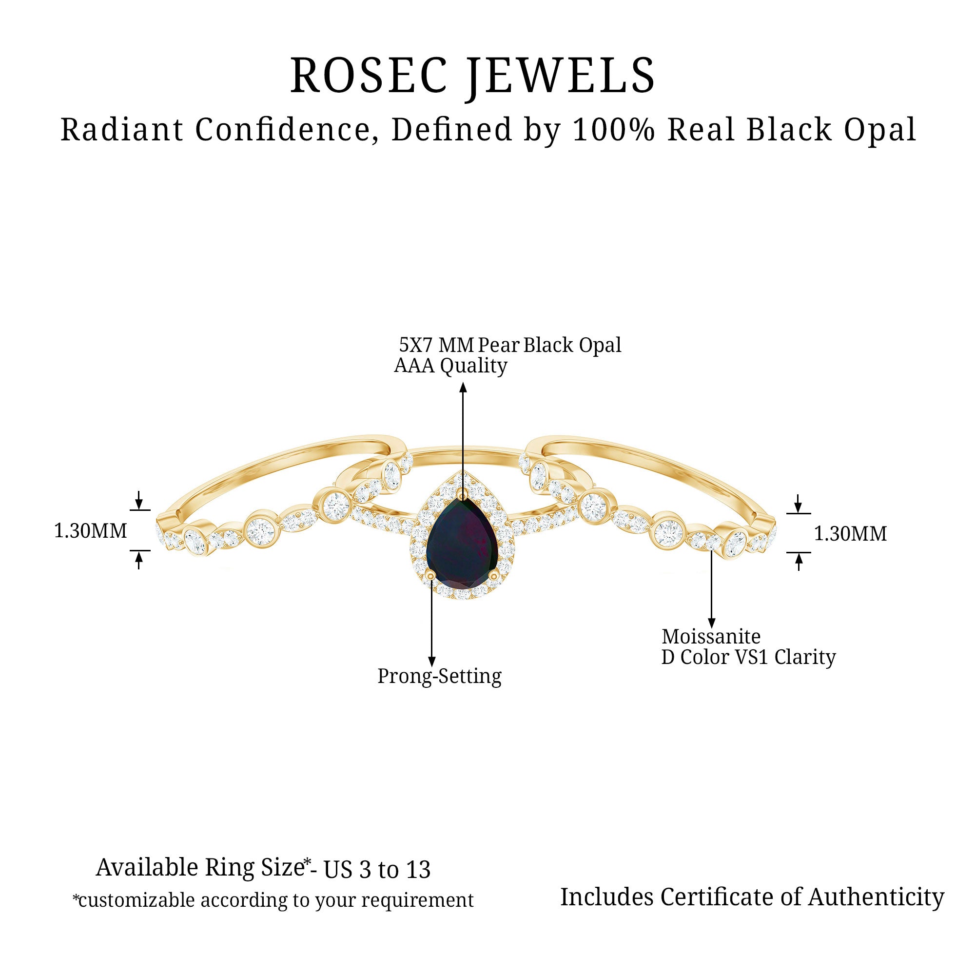 Pear Cut Black Opal Bridal Trio Ring Set with Moissanite Band