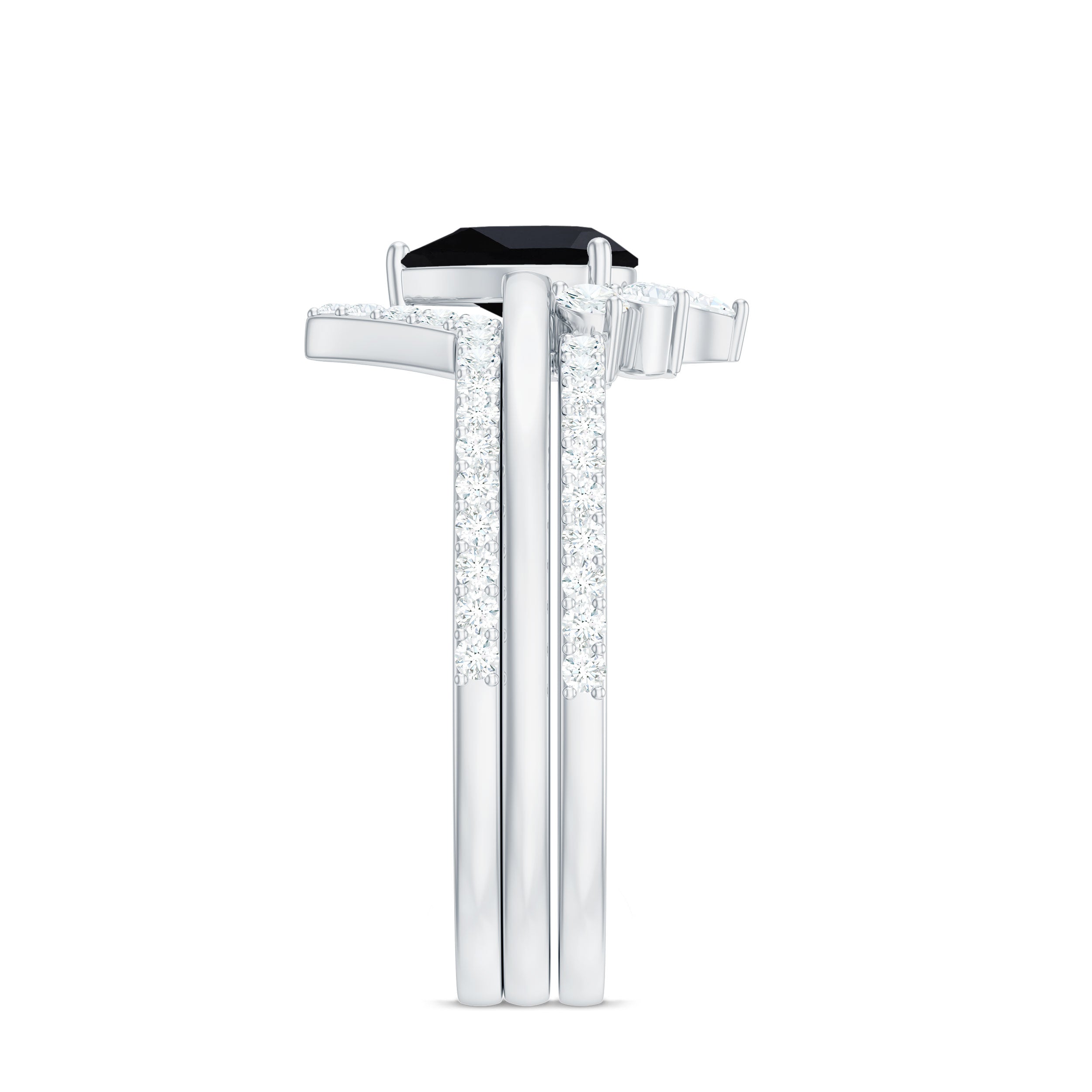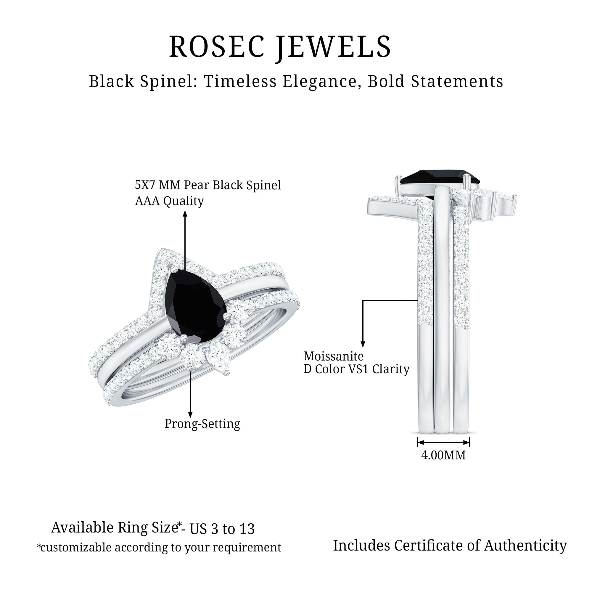 Pear Cut Black Spinel Trio Wedding Ring Set with Moissanite