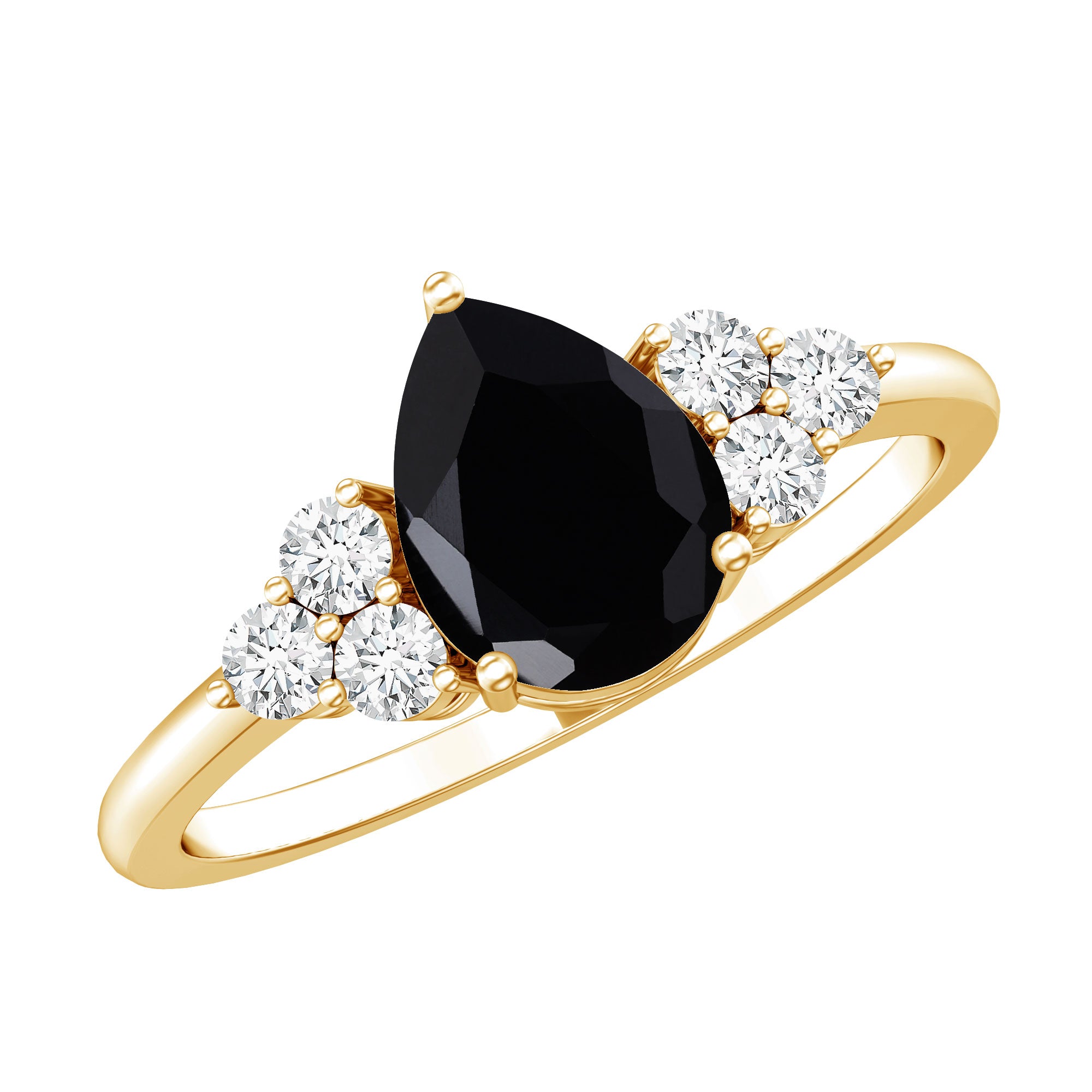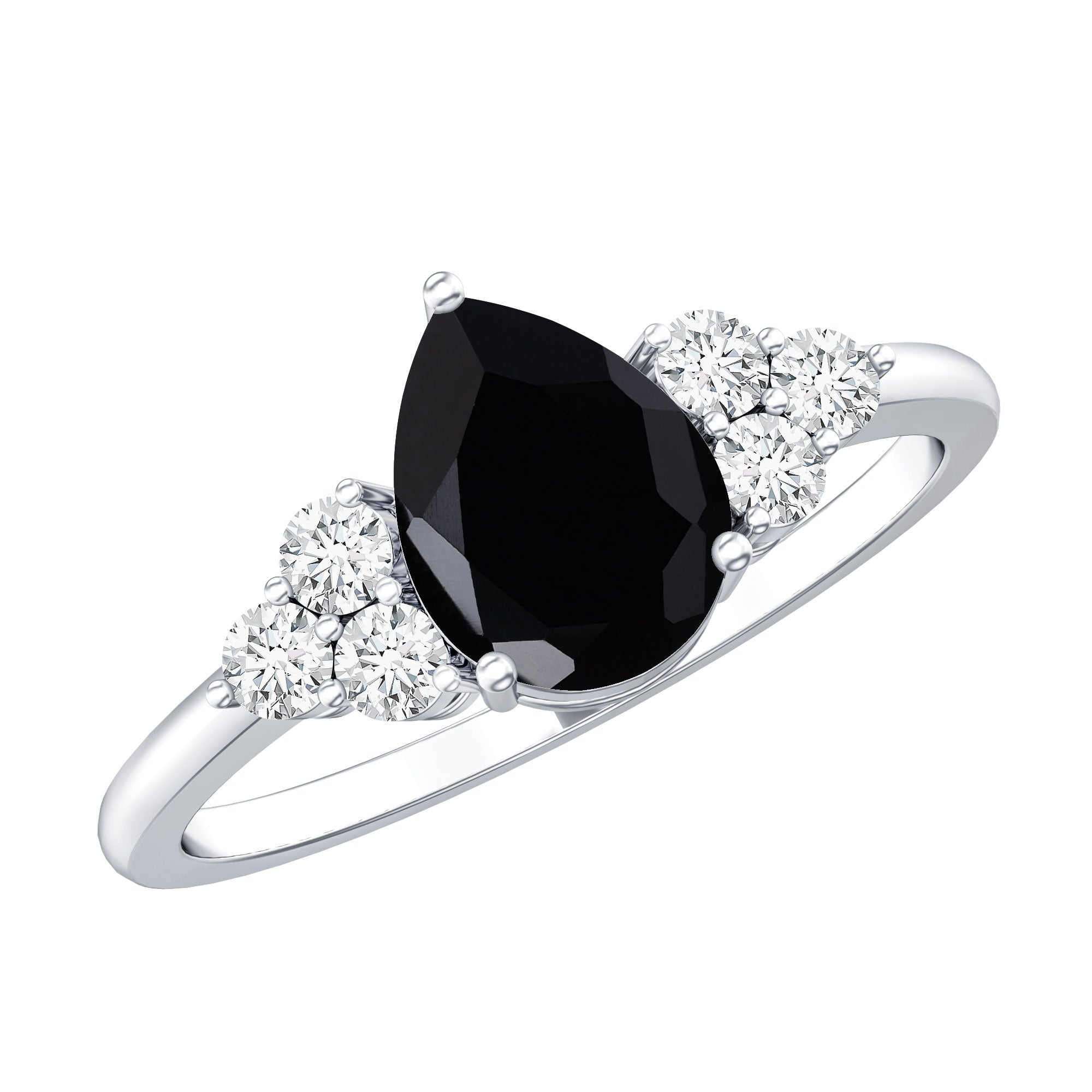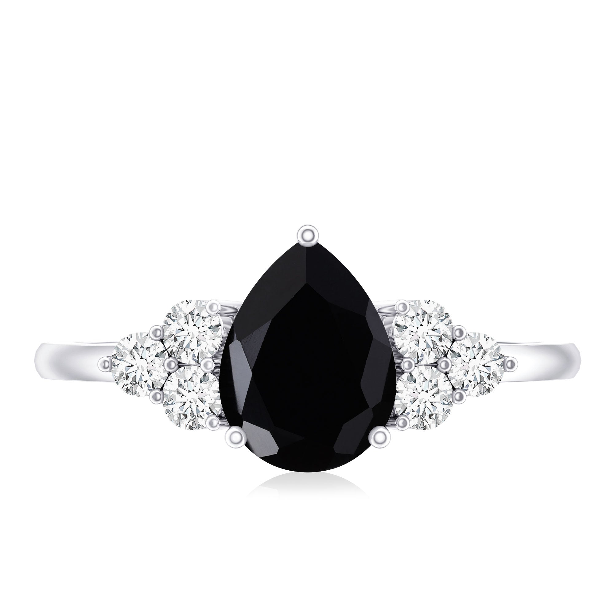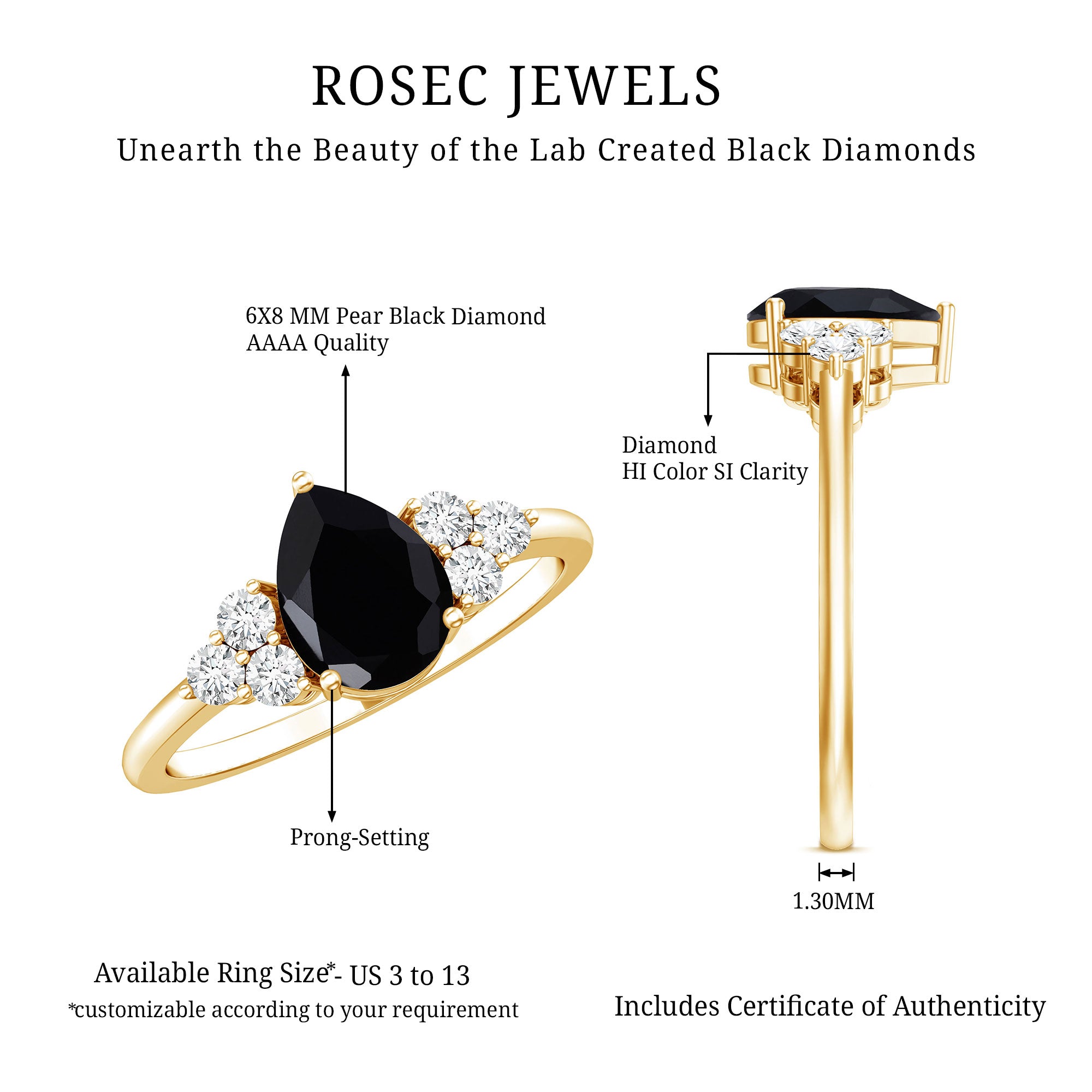 Pear Cut Created Black Diamond Solitaire Ring with Diamond Trio
