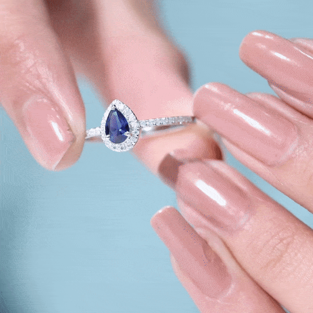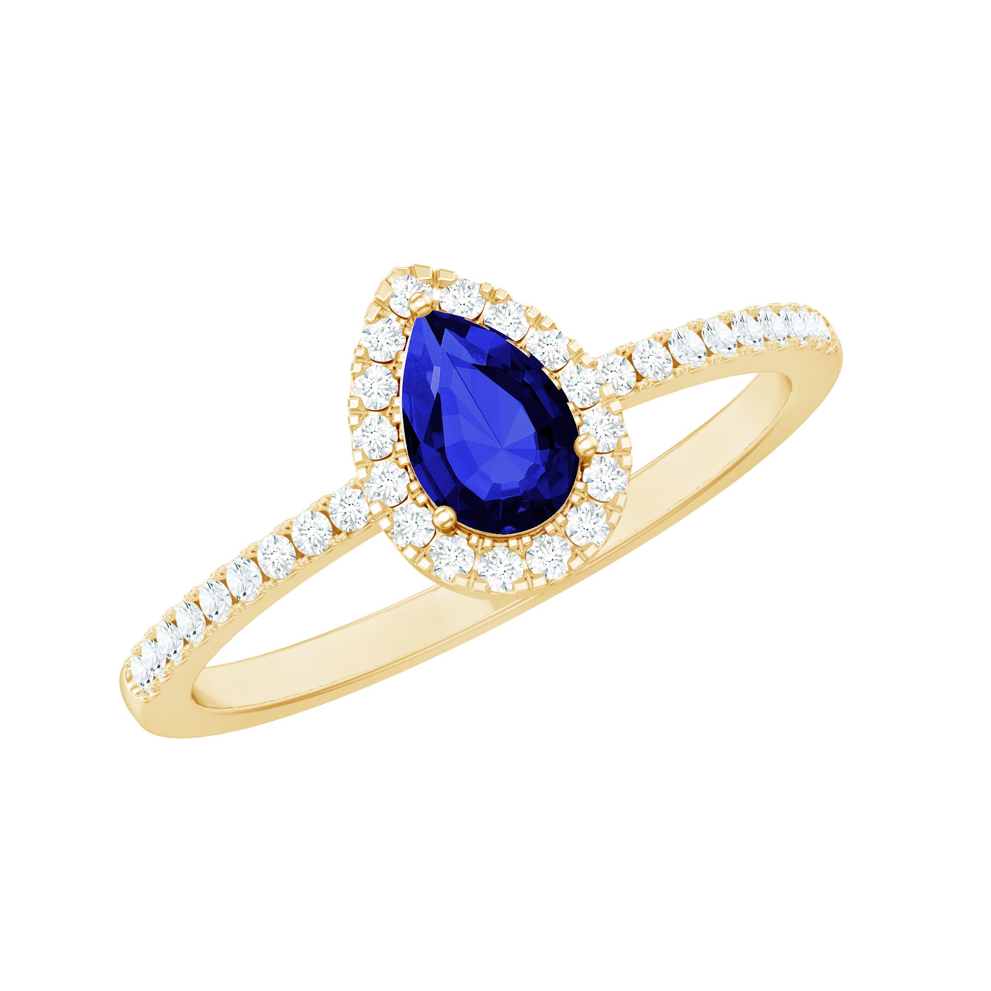 Enhance your special day with the elegance of this stunning Pear Halo Engagement Ring. The brilliance of this ring is heightened by the exquisite side stones and the halo of round-cut Diamond, which beautifully accentuates the dazzling pear-cut lab-created blue sapphire at its center. The captivating appeal of this engagement ring is sure to leave her in awe and make your proposal moment truly unforgettable.
