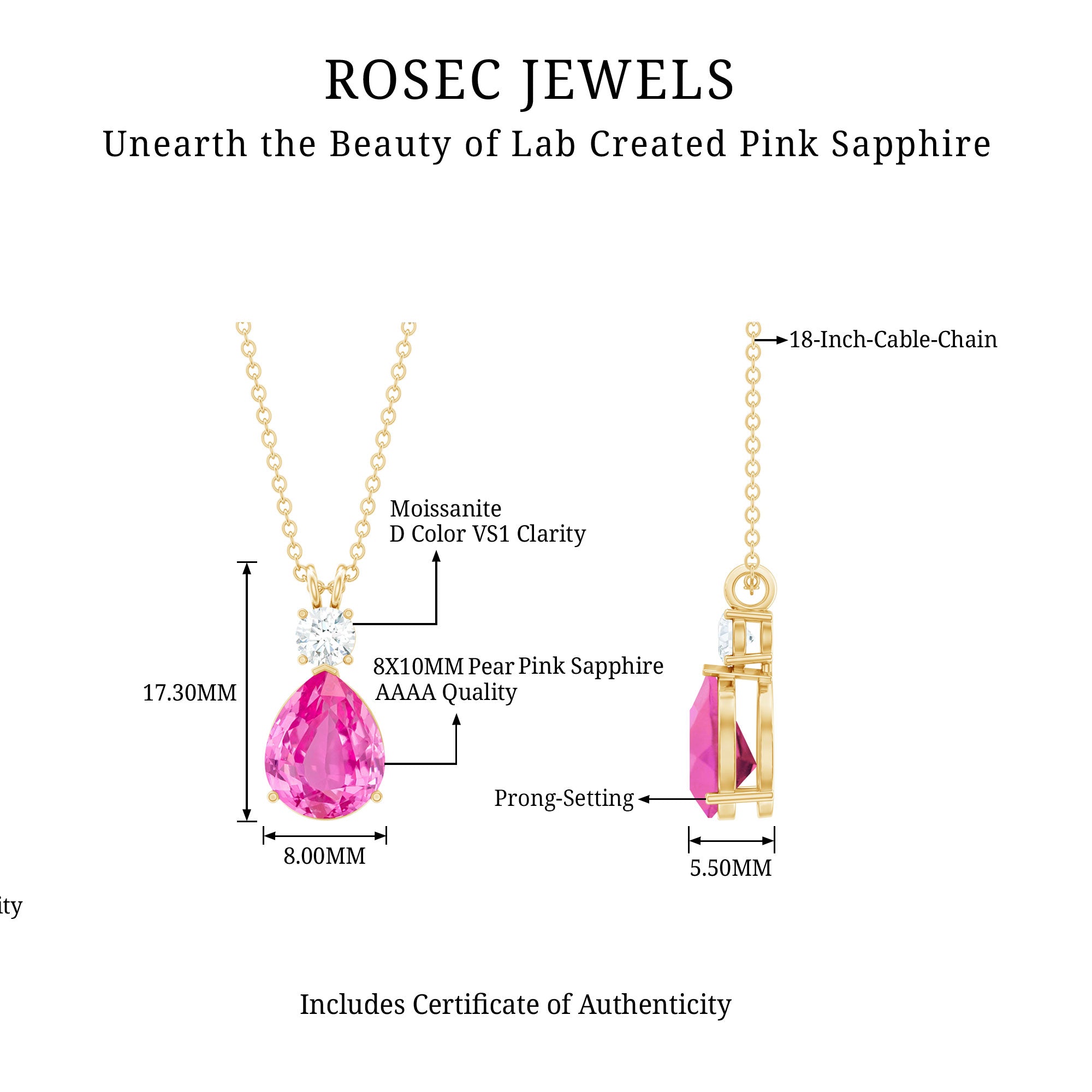 Make her heart skip a beat with this Drop Pendant Necklace. Featuring Pear Cut Lab Created Pink Sapphire secured in 3 Prong Setting while Round Moissanite studded on the top of it.