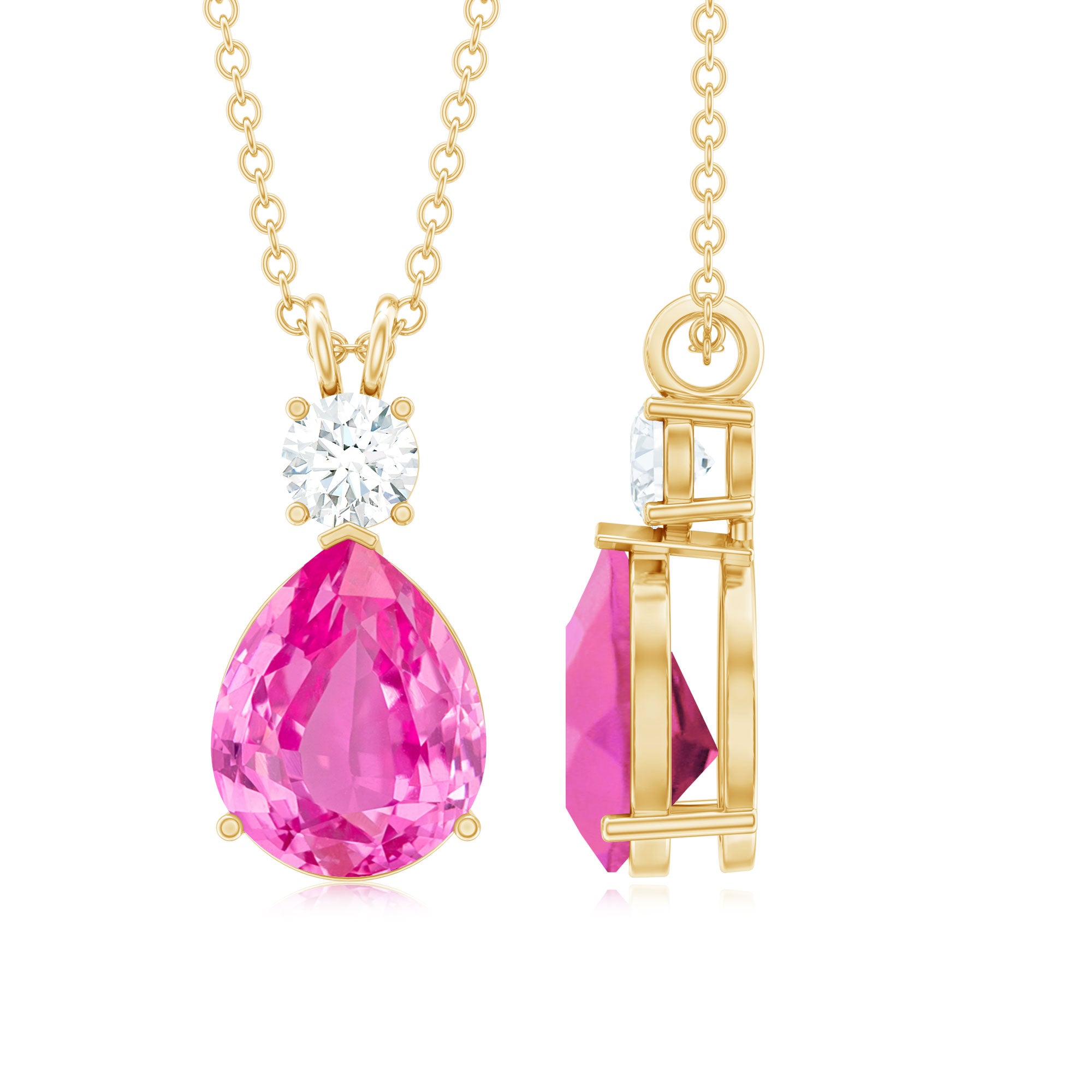 Make her heart skip a beat with this Drop Pendant Necklace. Featuring Pear Cut Lab Created Pink Sapphire secured in 3 Prong Setting while Round Moissanite studded on the top of it.