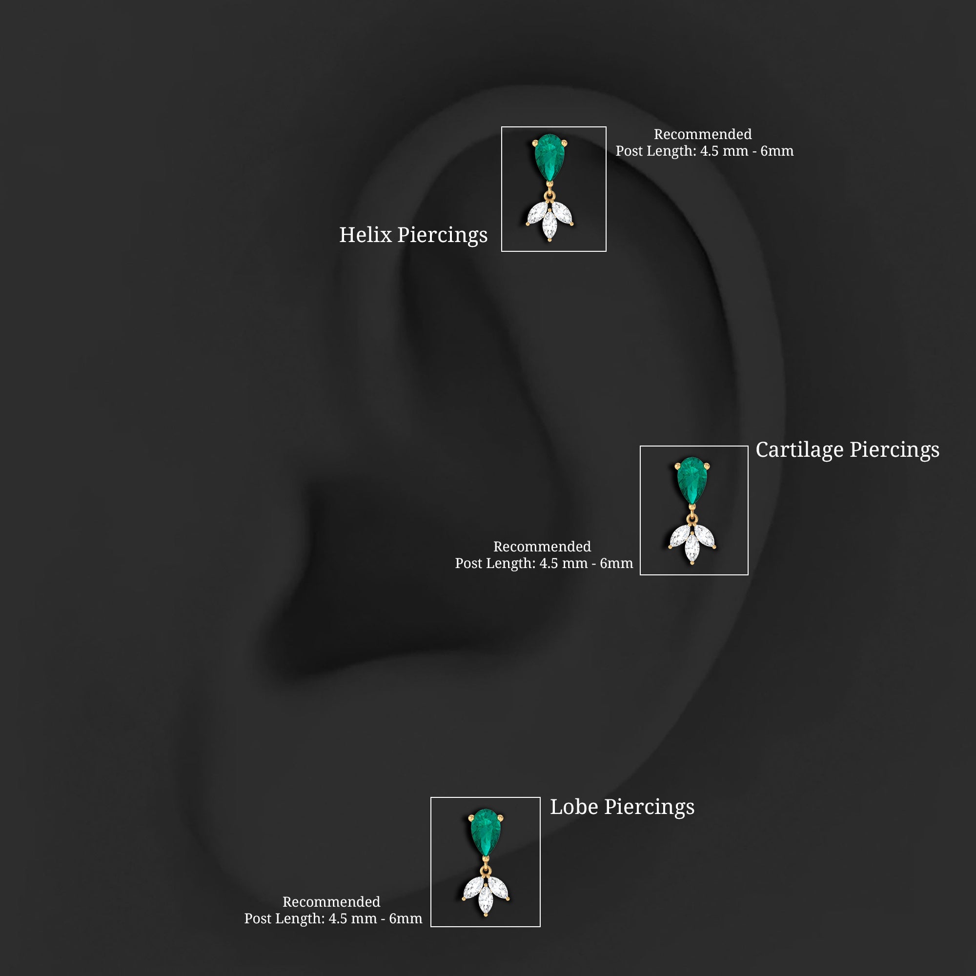 The Emerald and Moissanite Dangle Earring is a beautiful piece of jewelry. Featuring a stunning Pear Cut Emerald while Marquise Cut Moissanites in Prong Setting. You can wear this Green Emerald Earring on your Helix, Cartilage, or Upper Lobe Piercing.
