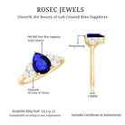 This solitaire ring features a stunning pear-shaped created blue sapphire at its center, with a trio of dazzling Diamond stones on each side. The prong setting beautifully highlights the central piece, effortlessly drawing attention. Whether youre going for a casual movie date or spending time with your friends, this Created Sapphire Ring will ensure you stand out and turn heads wherever you go. Its a true crowd-pleaser.