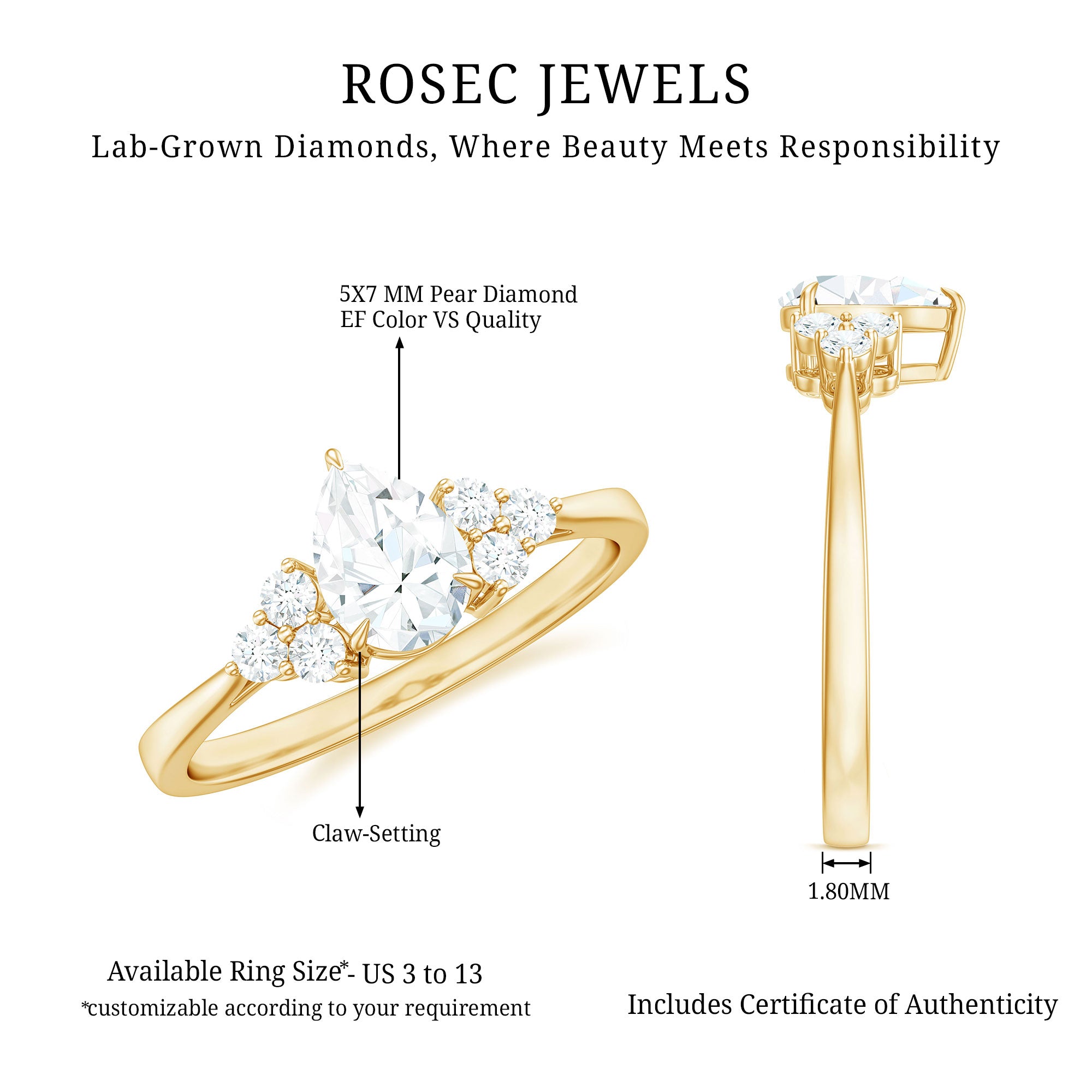Let every meaningful moment shine brighter with this Lab Grown Diamond Engagement Ring that carries both beauty and grace. The design centers around a 5X7 MM pear cut lab created diamond, offering an elegant sparkle that instantly draws the eye. On each side, a trio of round lab created diamonds adds extra brilliance, creating a gentle flow of light that enhances the charm of the centerpiece. Made for women who appreciate simple yet refined style, the Teardrop Engagement Ring blends classic elegance with a modern touch. Its smooth finish and balanced design make it comfortable for everyday wear while still feeling special enough for important occasions. Whether you are marking a proposal, an anniversary, or a personal milestone, the Pear Shaped Diamond Ring brings a sense of joy and meaning to the moment. Available in a variety of metal options and ring sizes, it offers the flexibility to choose a look that fits your taste perfectly.