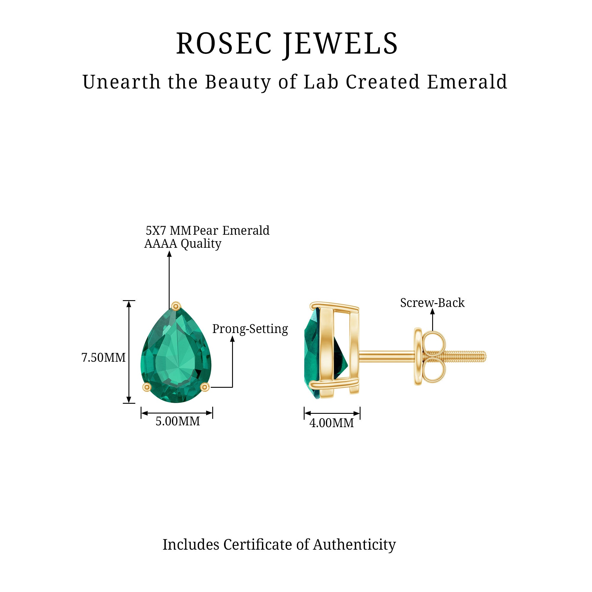 Small details often make the biggest impact, and these lab created Emerald Stud Earrings are a perfect example. Each earring features a 5X7MM pear shaped lab created emerald secured in 3-prong setting that highlights its rich green color. The teardrop shape adds a graceful touch, making the Solitaire Stud Earrings eye-catching. Designed for comfort and ease, the Green Emerald Earrings are lightweight and pleasant to wear throughout the day. The screw back closures keep them firmly in place, allowing you to move through your day with confidence. Whether worn during daily routines or for special moments, they add a gentle sparkle that enhances any outfit. The solitaire style keeps the focus on the emerald, letting its color and shape stand out beautifully. They arrive in a signature jewelry box with a certificate of authenticity, making them a thoughtful gift or a meaningful addition to your own collection. With their graceful design and vibrant green hue, these Teardrop Stud Earrings bring elegance and meaning to every look.