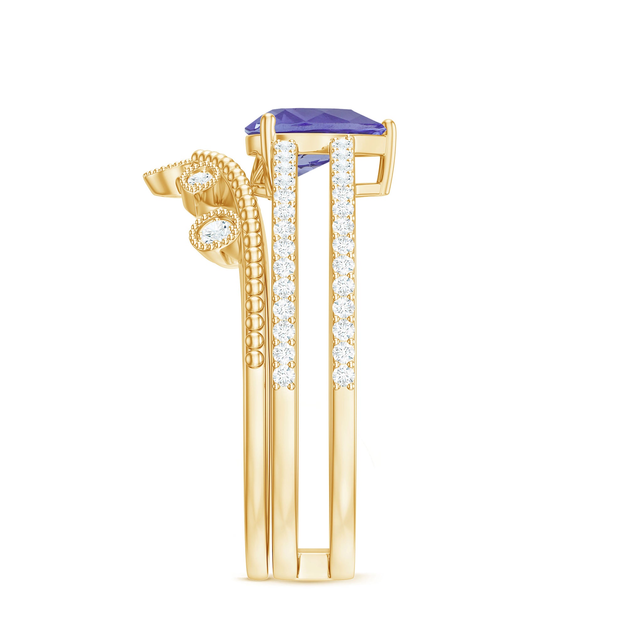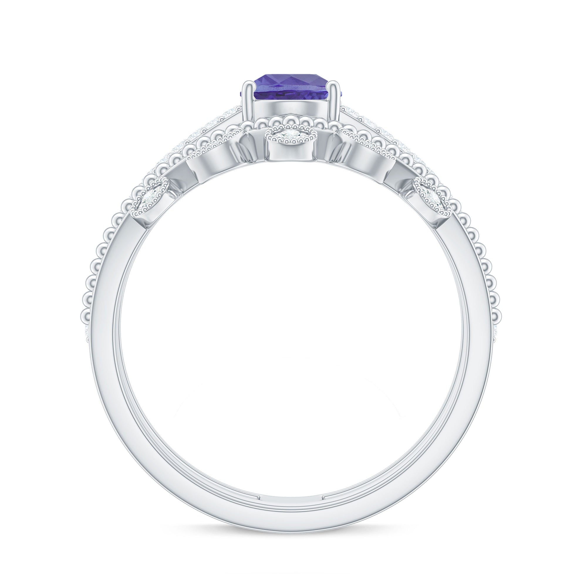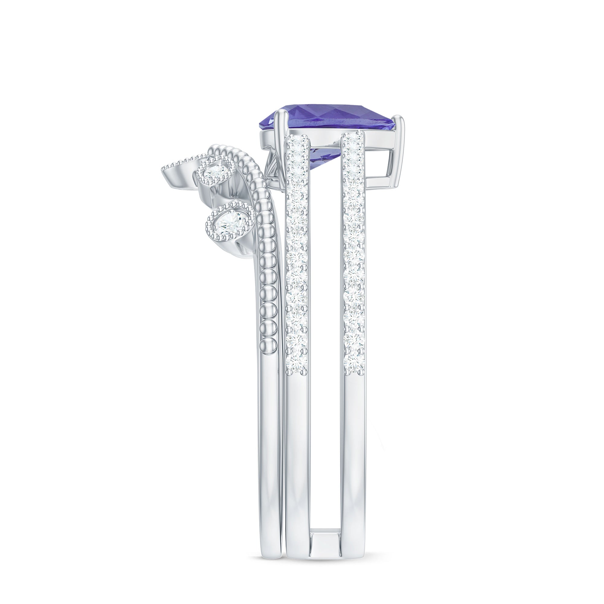 A reminiscent sparkle that captures the magic of a love story, this Tanzanite Wedding Ring Set is made for moments that take your breath away. At the center of the Double Band Engagement Ring, a 5X7mm Pear Shape Tanzanite shimmers with a soft, enchanting glow, surrounded by delicate Diamond stones that trace the curves of the double band like tiny whispers of forever. Complementing it, the Curved Wedding Band dances gracefully around the finger, its leaf inspired design adorned with dainty Diamond stones and intricate Beaded detailing, adding a natural elegance that feels both timeless and modern. This Wedding Bridal Ring Set tells a story of two hearts intertwined, offering a subtle yet captivating statement of devotion. This Vintage Wedding Ring Set comes in a signature jewelry box, ready to create a moment of awe and excitement, and is available in a range of sizes to ensure a perfect fit. Whether it is a proposal, a milestone or a promise of forever, this Wedding Engagement Ring Set celebrates love in its most radiant form, an everyday treasure that will always remind you of the magic in your story.