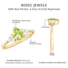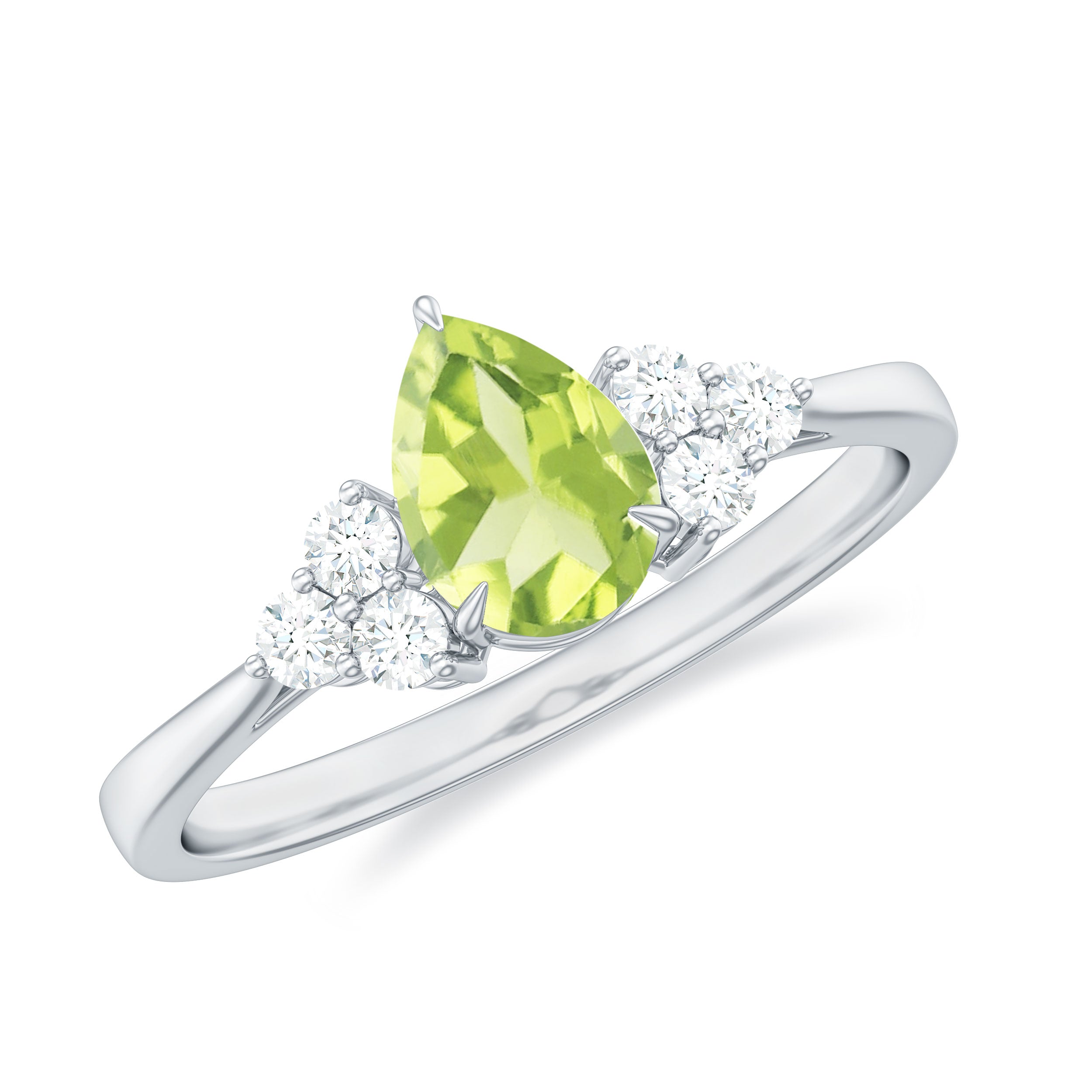 Elevate your everyday style with a touch of regal charm through this exquisite Peridot Ring. Adorned with a stunning 5X7 MM Pear Cut Peridot in a Claw Setting, this ring exudes subtle elegance. The addition of Diamond gemstones in a trio on the Teardrop Engagement Ring design adds a dazzling accent. Versatile enough to be worn on any occasion, this ring effortlessly enhances your jewelry collection with its timeless appeal.