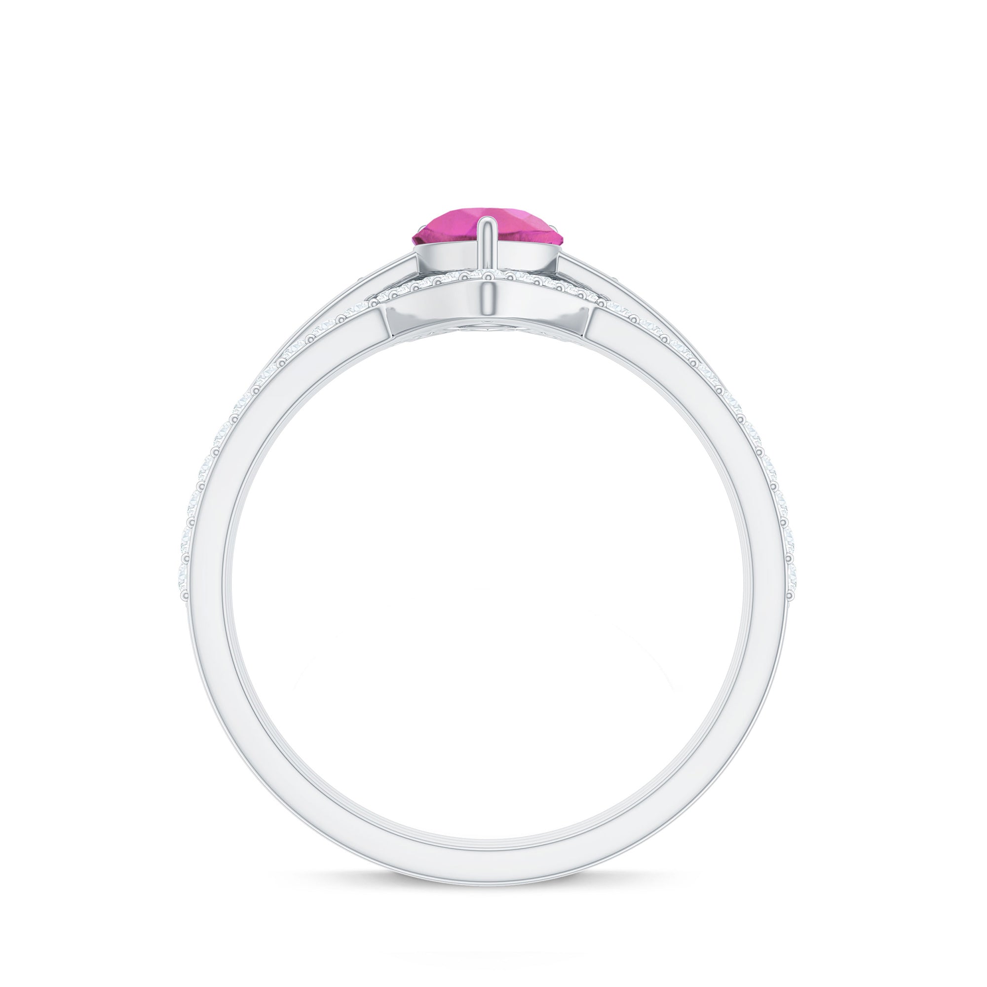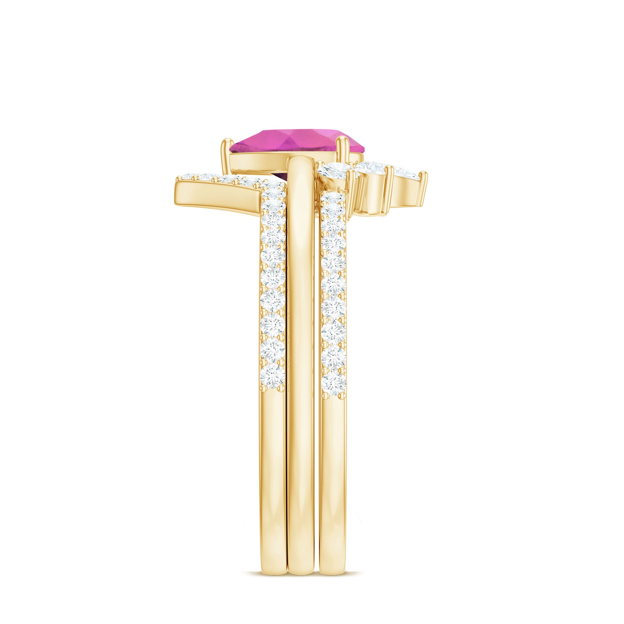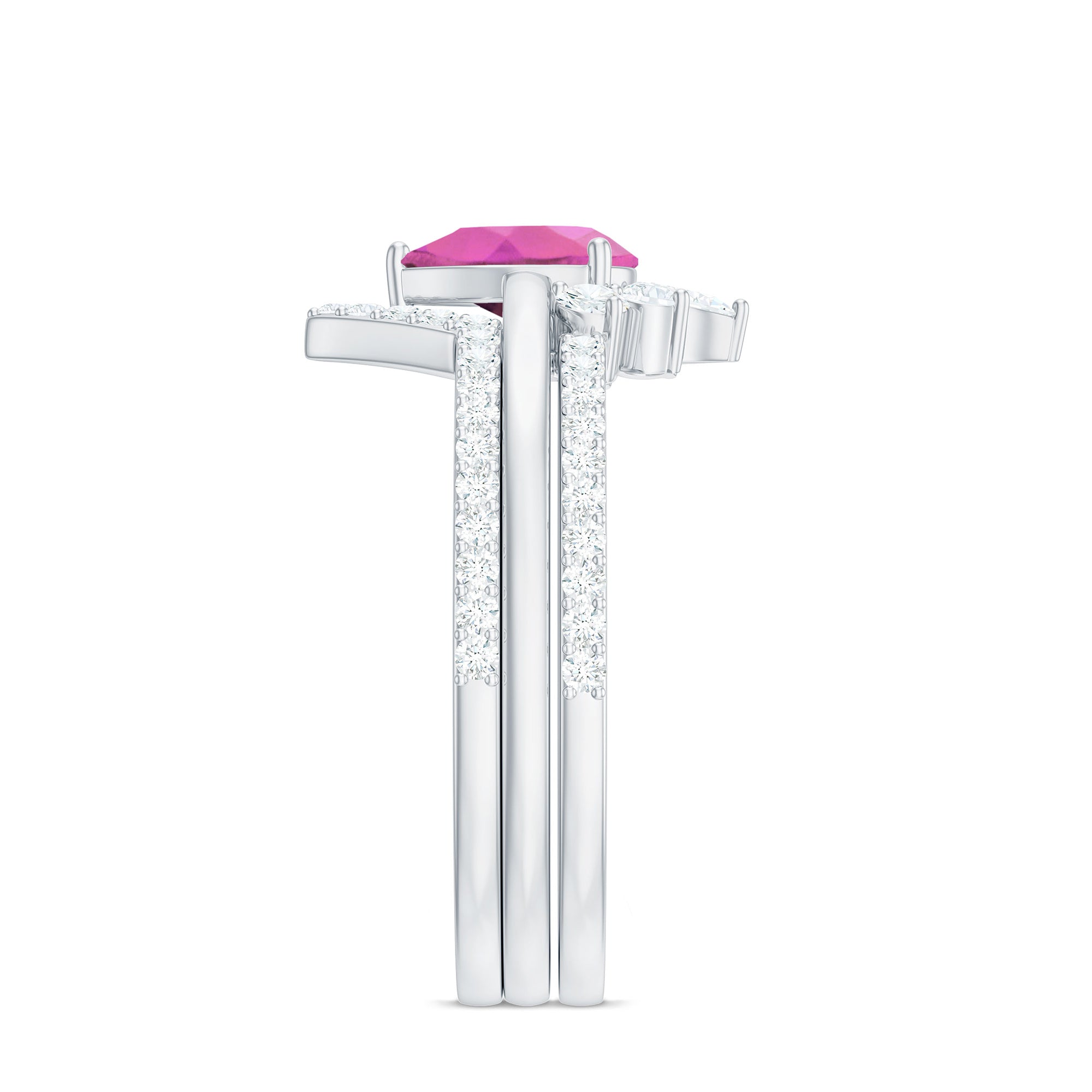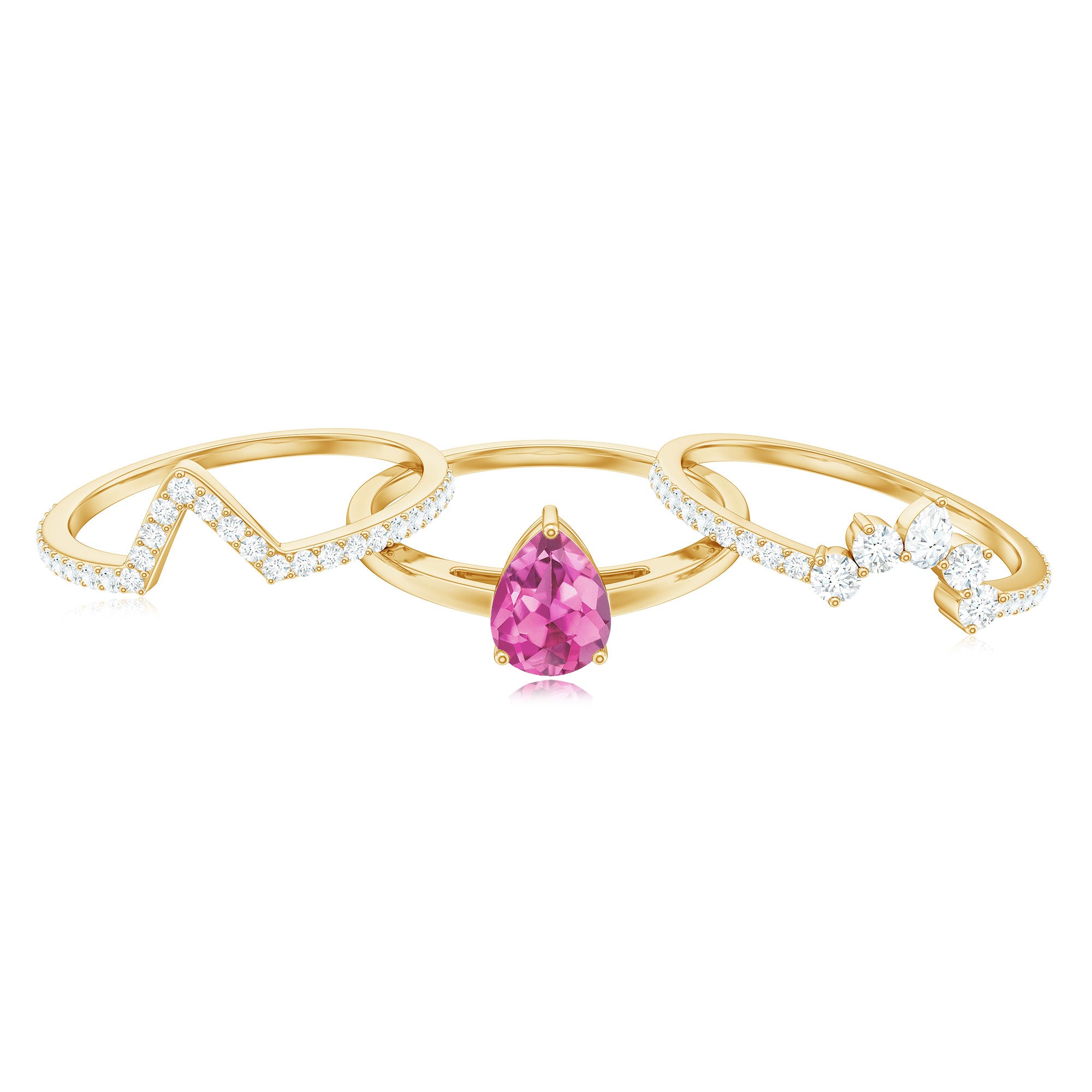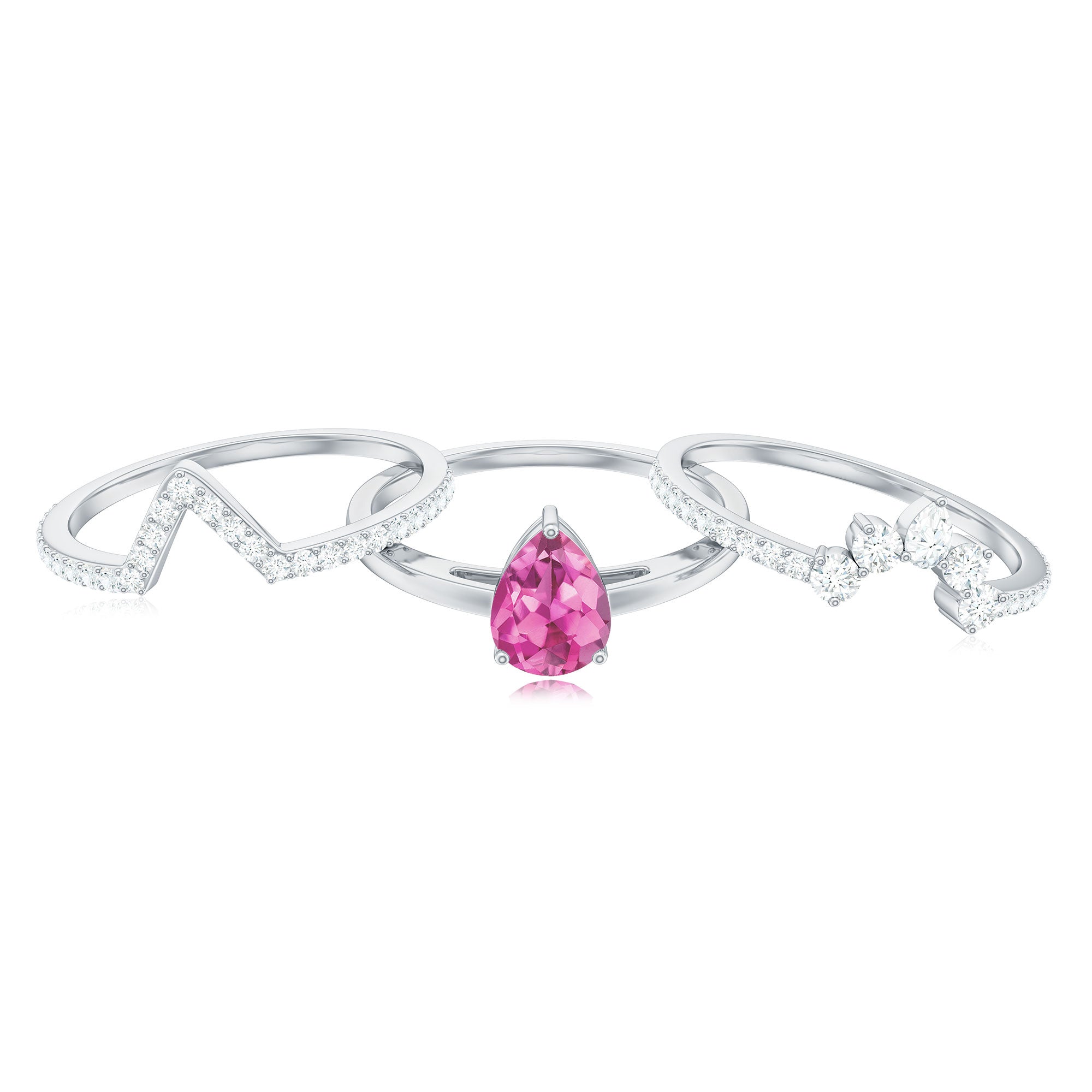 Make her big day even more memorable with this stunning Three Ring Set adorned with pear cut Pink tourmaline set as Solitaire in one ring with two enhancer featuring round moissanite stones. This Bridal Ring Set is a splendid choice for any woman, exuding elegance and sophistication. Surprise your lady with this exquisite moissanite ring set and let it be a cherished piece shell treasure forever, representing the beauty of your love on her big day.