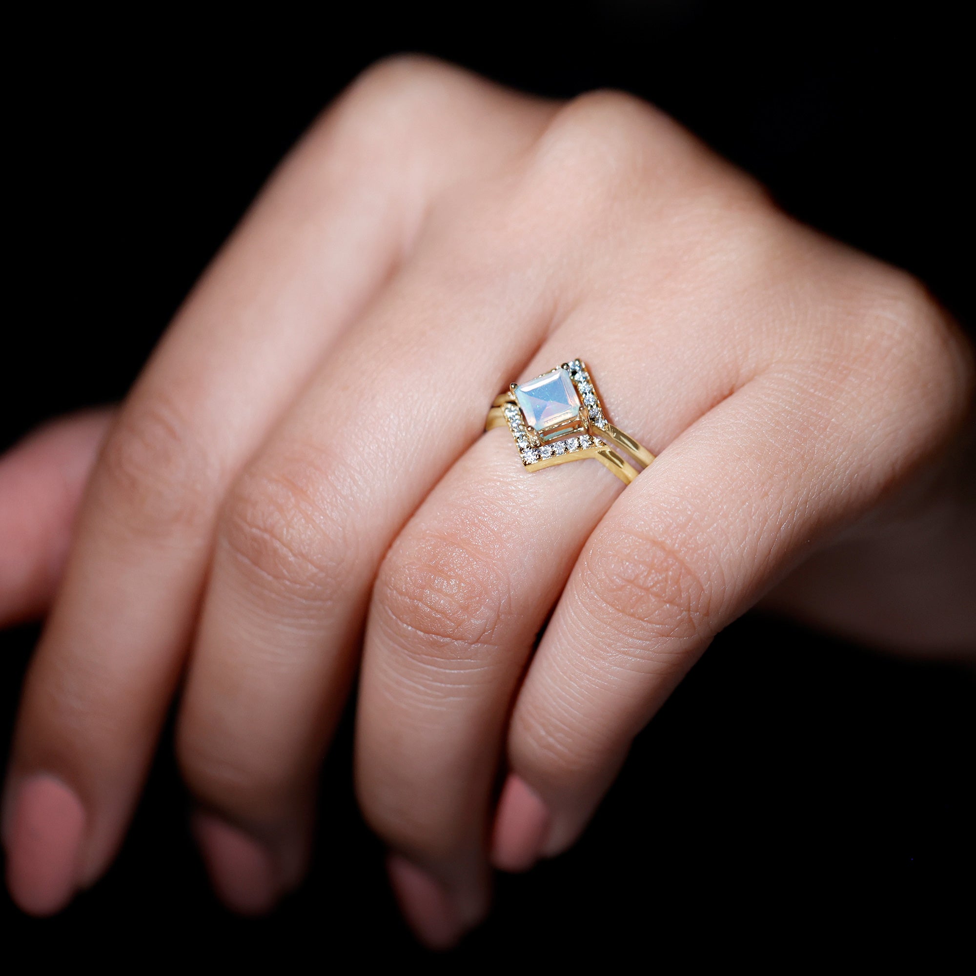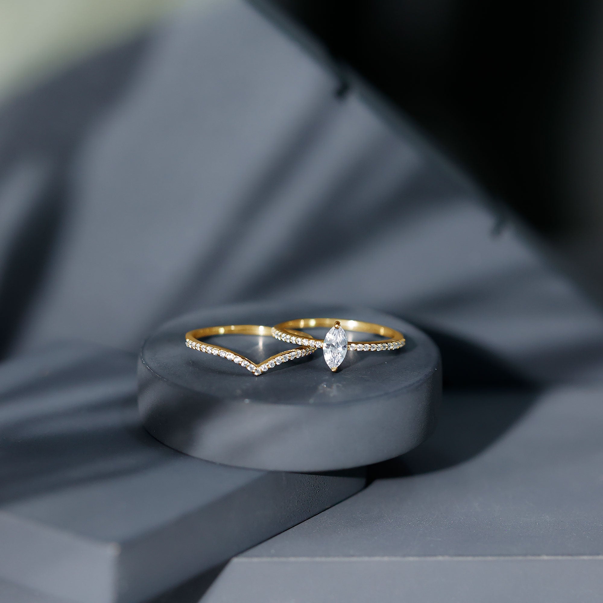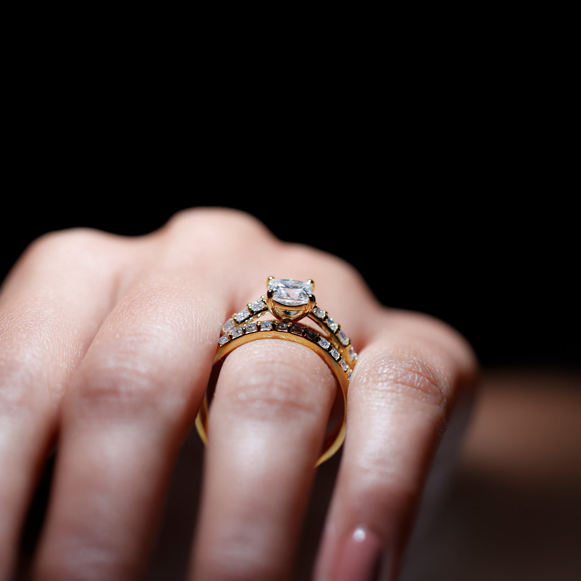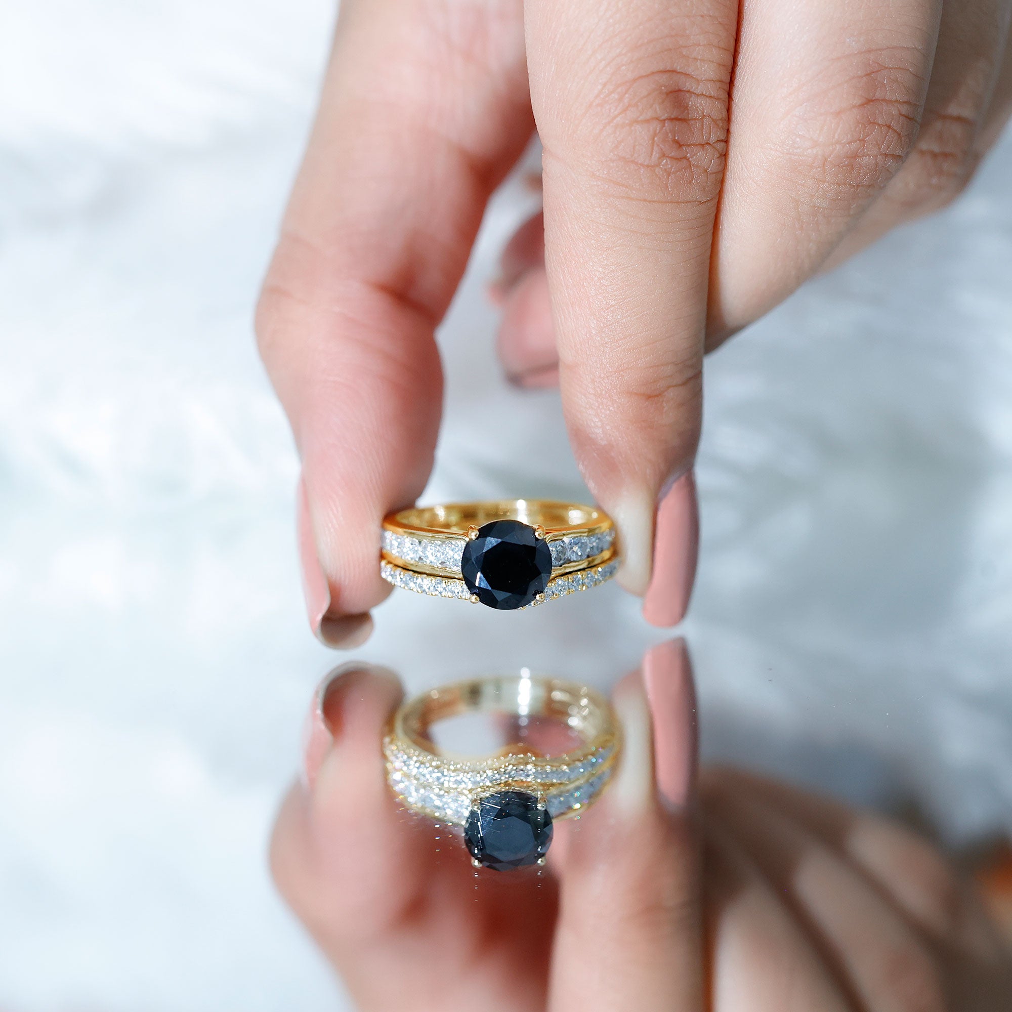 Bridal sets come in various designs, from ornate filigree to contemporary minimalist forms, to fit every couple's preferences and personalities. The identical bands give the finger a seamless appearance, highlighting the unity of the couple's commitment.