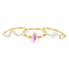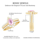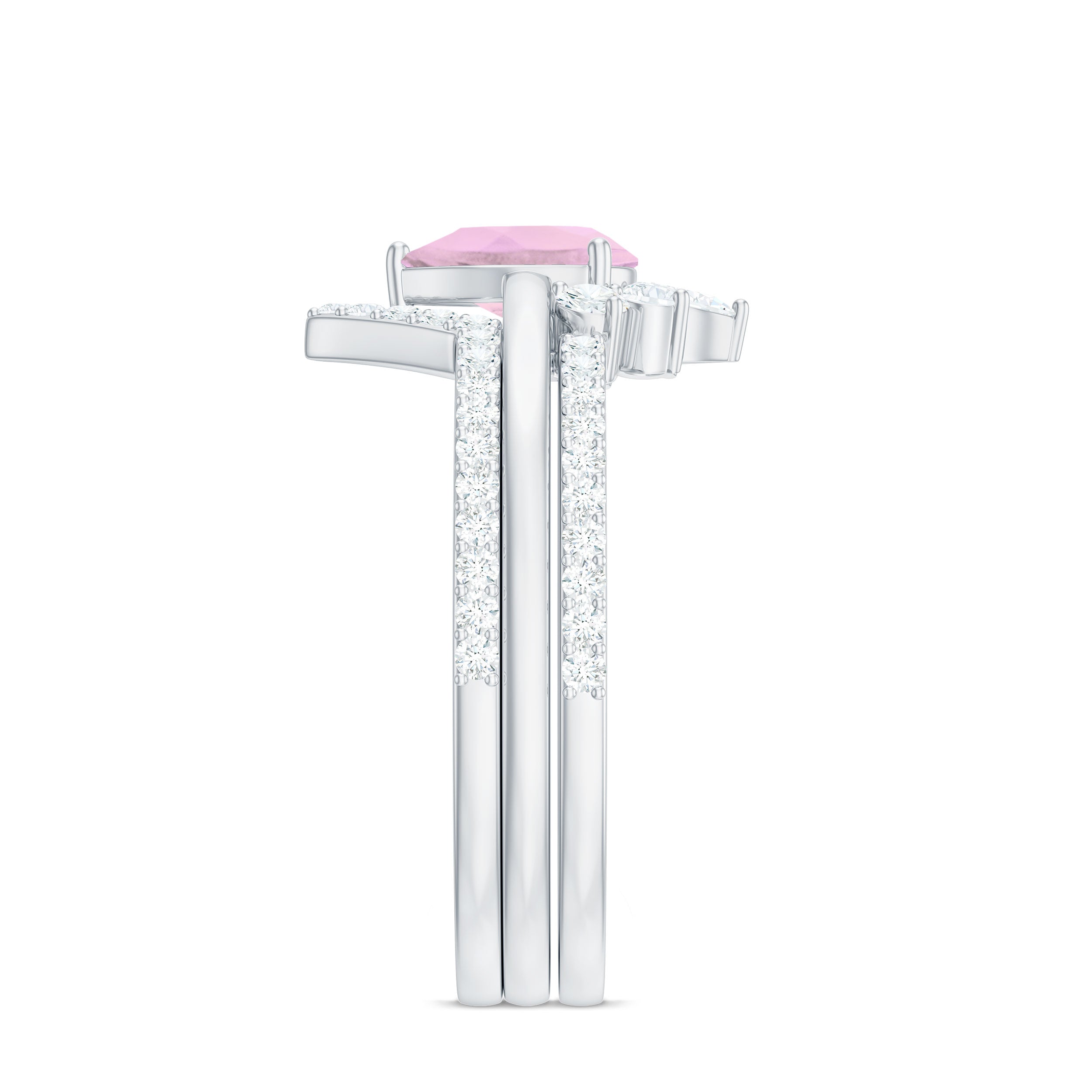 Make her big day even more memorable with this stunning Three Ring Set adorned with pear cut Rose Quartz set as Solitaire in one ring with two enhancer featuring round moissanite stones. This Bridal Ring Set is a splendid choice for any woman, exuding elegance and sophistication. Surprise your lady with this exquisite moissanite ring set and let it be a cherished piece shell treasure forever, representing the beauty of your love on her big day.