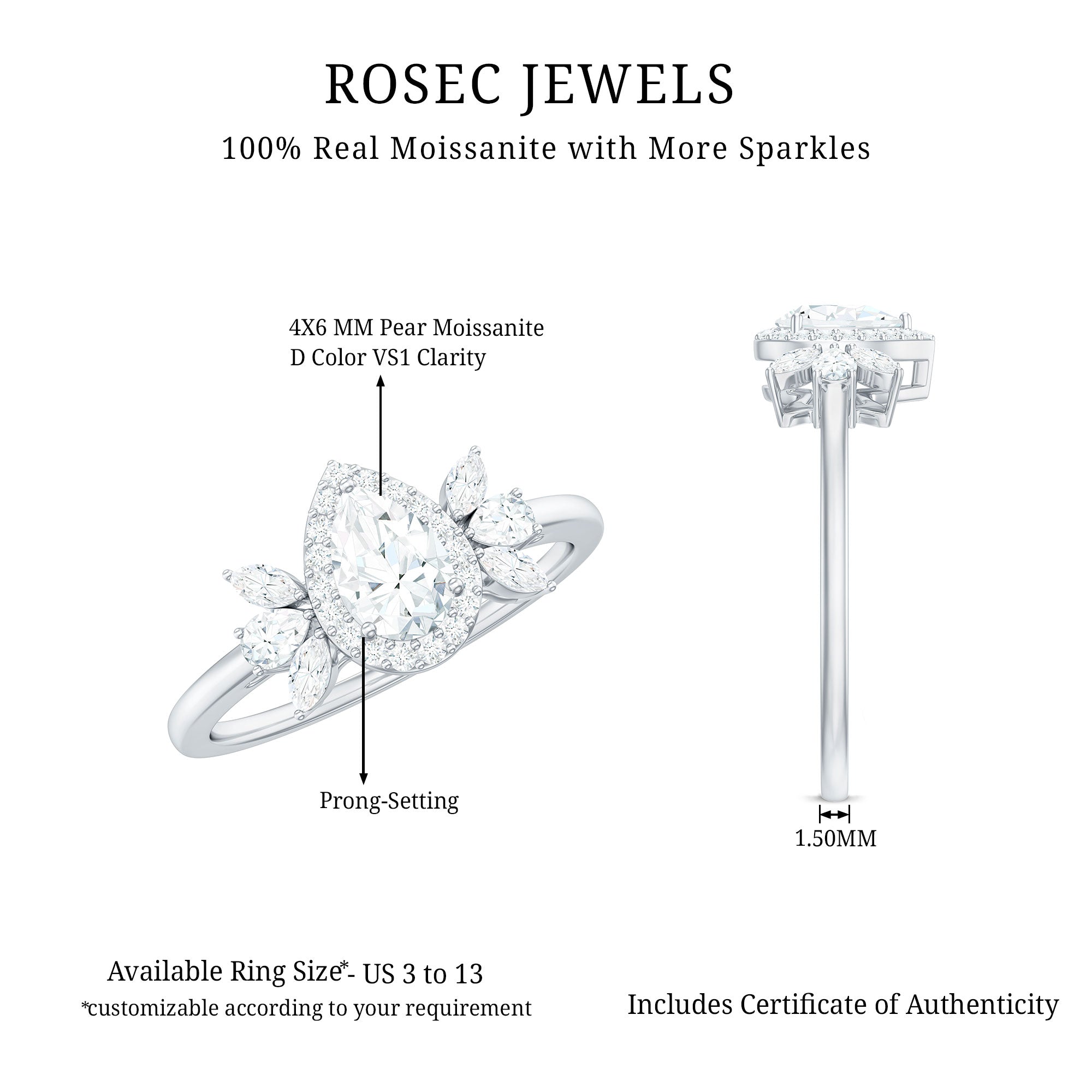 Graceful and full of sparkle, this Moissanite Engagement Ring is a beautiful mix of classic charm and modern style. At the center sits a brilliant 4X6 MM pear shaped moissanite, securely held in prong setting. The center stone is surrounded by a halo of round moissanites, adding extra shine and making the center look even more radiant. With D-VS1 quality, the moissanite offers incredible clarity and sparkle, symbolizing pure and lasting love. To make the design even more eye-catching, a trio of small marquise and pear shaped moissanite stones is placed on each side of the center. These delicate accents bring balance and elegance to the Halo Engagement Ring while keeping the overall look soft and romantic. Every stone is carefully placed to give the Teardrop Engagement Ring a glowing finish from all angles. This Moissanite Halo Ring offers a wonderful alternative to traditional diamonds, more affordable and just as brilliant, without compromising on beauty or meaning. This Pear Shaped Engagement Ring is a lovely way to express your love. It comes carefully packaged in a beautiful jewelry box, ready to gift or treasure. Thoughtfully designed and full of meaning, it is a piece she will cherish always.