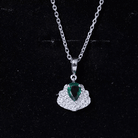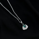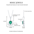 Elevate your neckline with this Lab Grown Emerald Pendant Necklace, crafted with care using 14k white gold plated silver. The pendant features a 5X7 MM pear-shaped lab-created emerald at its heart, securely set in prong setting. Surrounding the center stone are delicate round cut moissanite stones that add just the right amount of sparkle to enhance your outfits charm without overshadowing the main gem, also creating a classic contrast look anyone will love to show off. This Designer Emerald Necklace shines with the timeless beauty of AAAA quality lab emerald and D color VS1 clarity Moissanites. It hangs from a sturdy yet simple cable chain, allowing it to sit elegantly on your neckline and complete your look. This Statement Pendant and Chain will come in a velvet pouch for safe, dust-free storage, along with a certificate of authenticity.